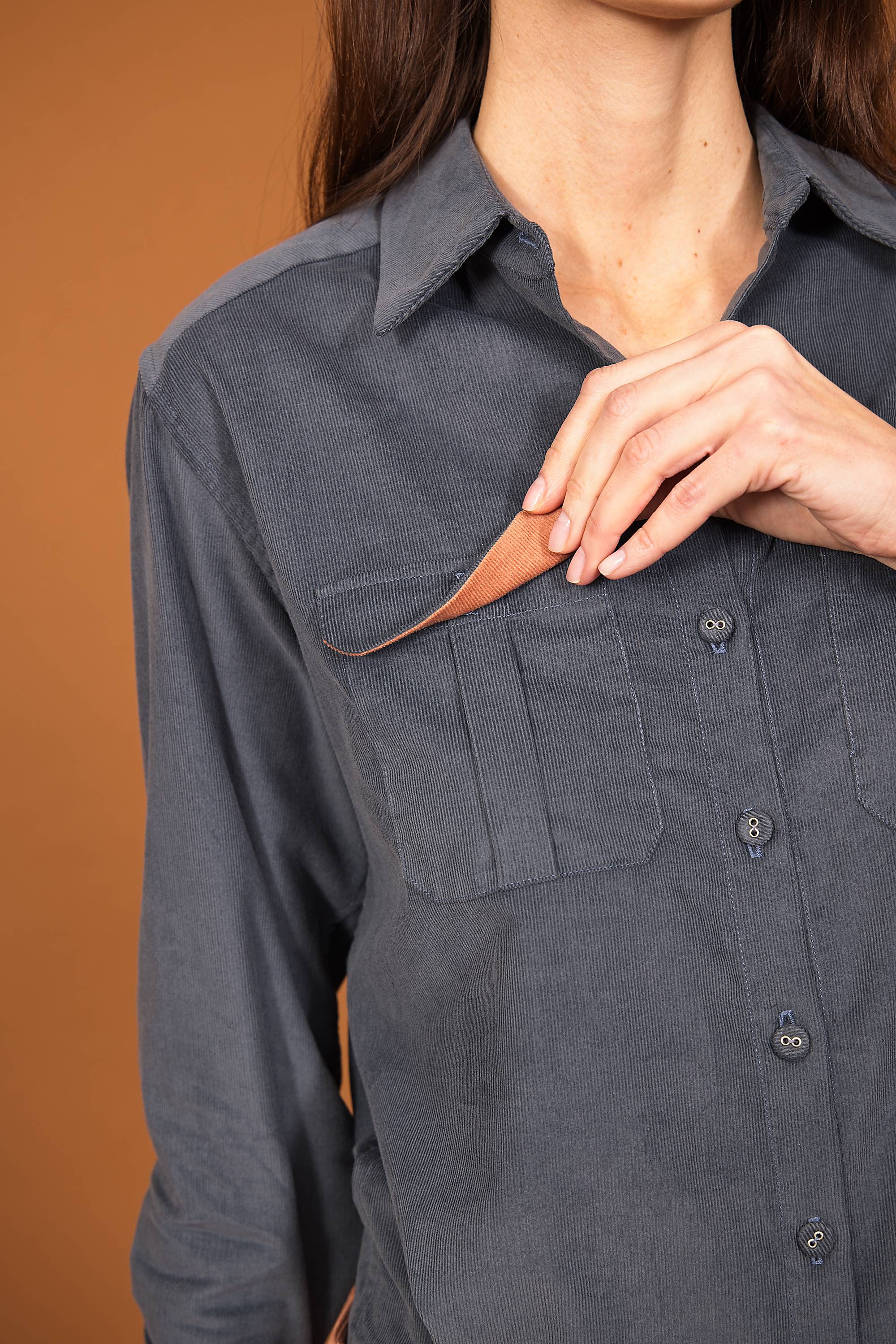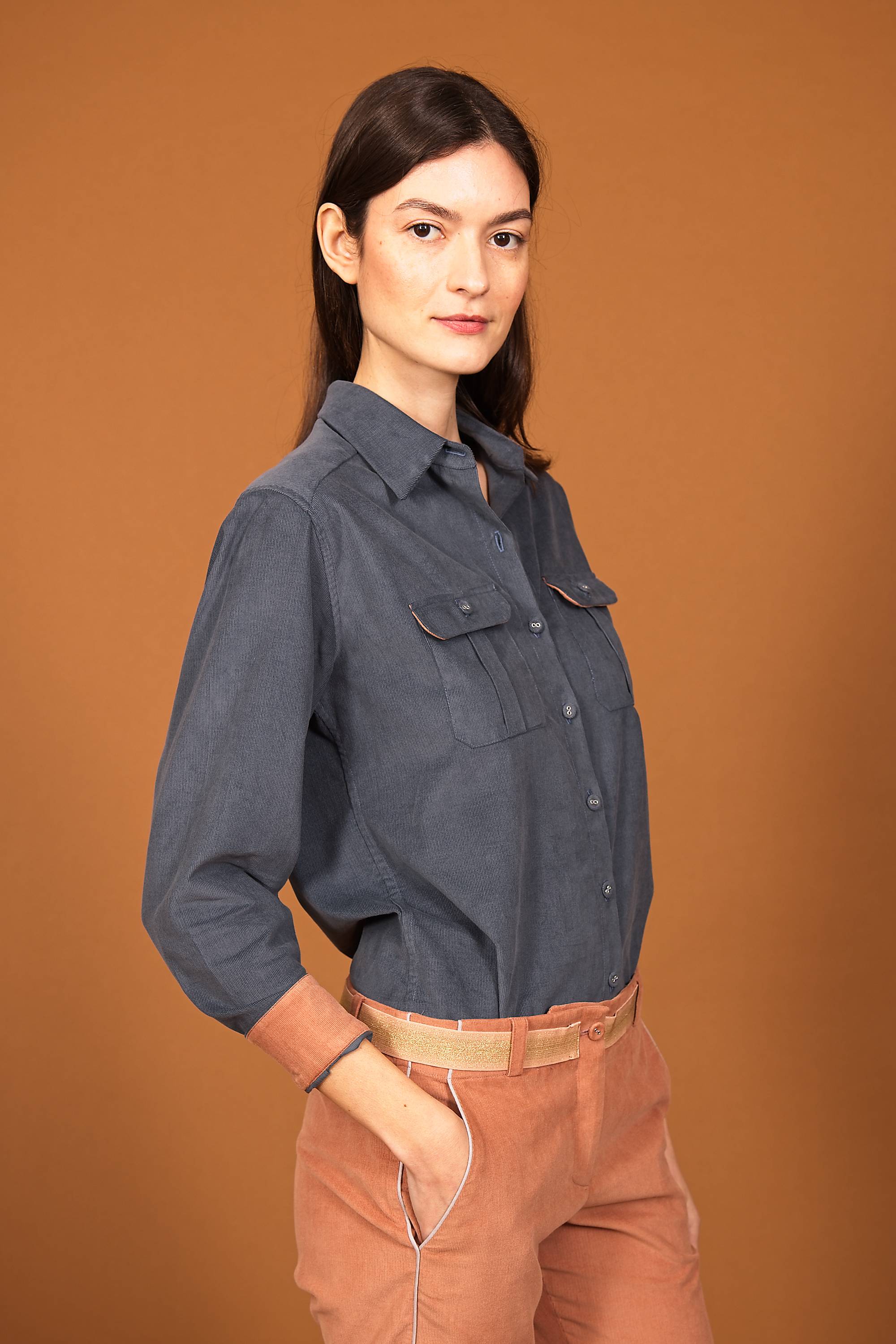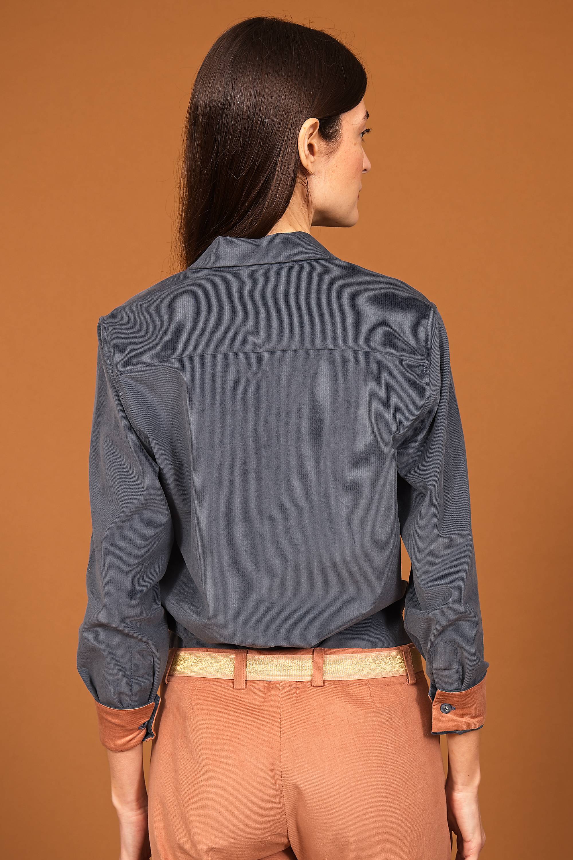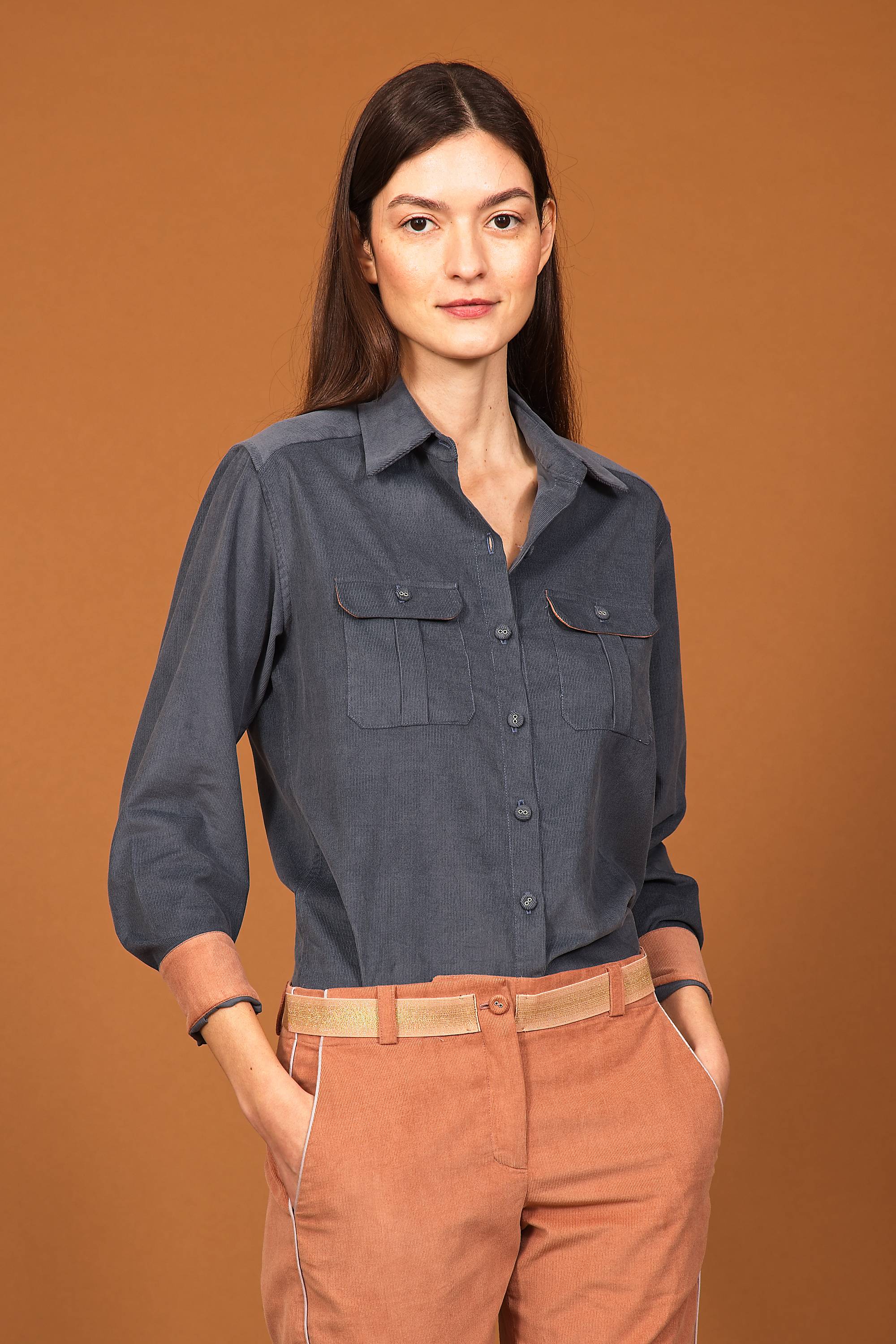 Chemise en coton de velours finement cotelé, 2 poches à rabats sur la poitrine, manches longues, poignets bicolores