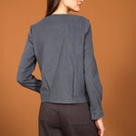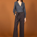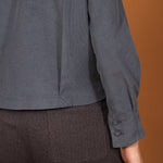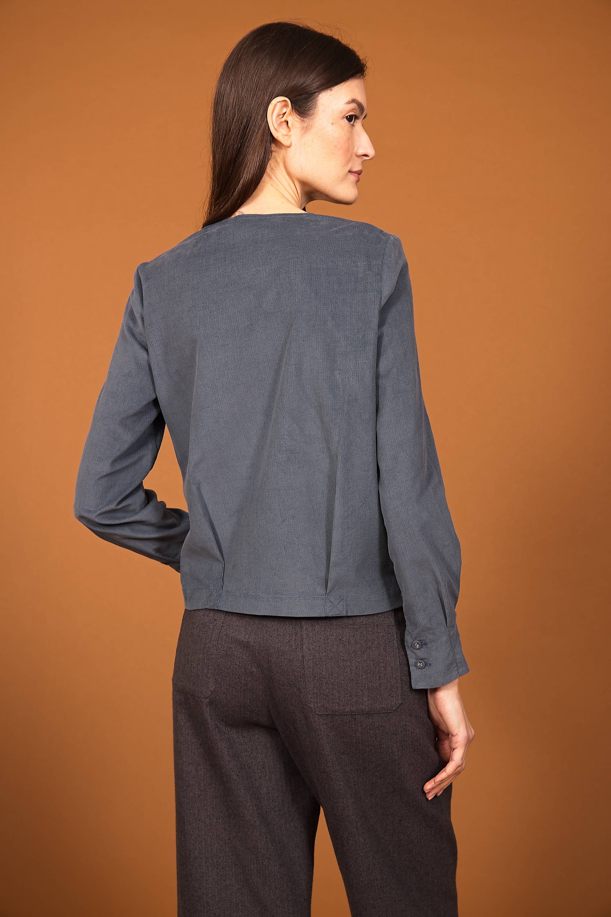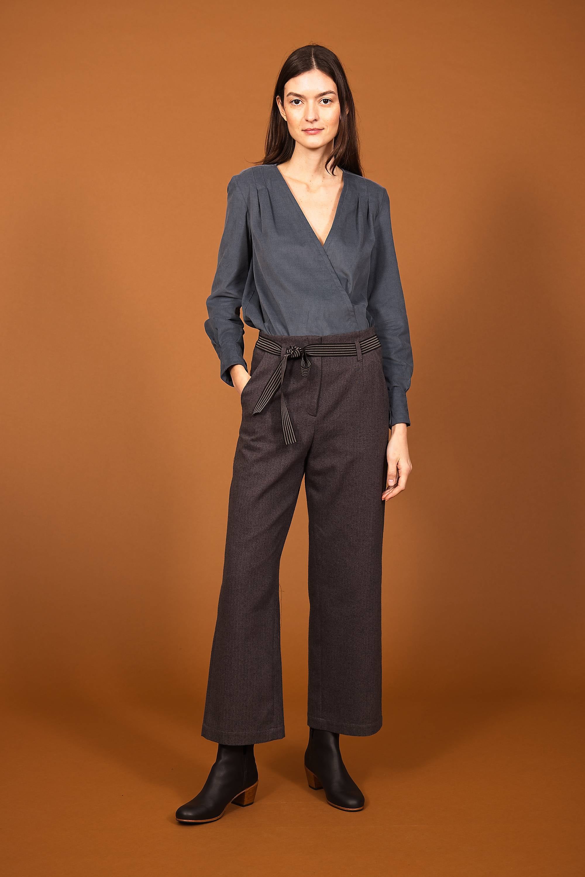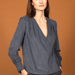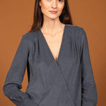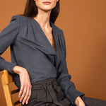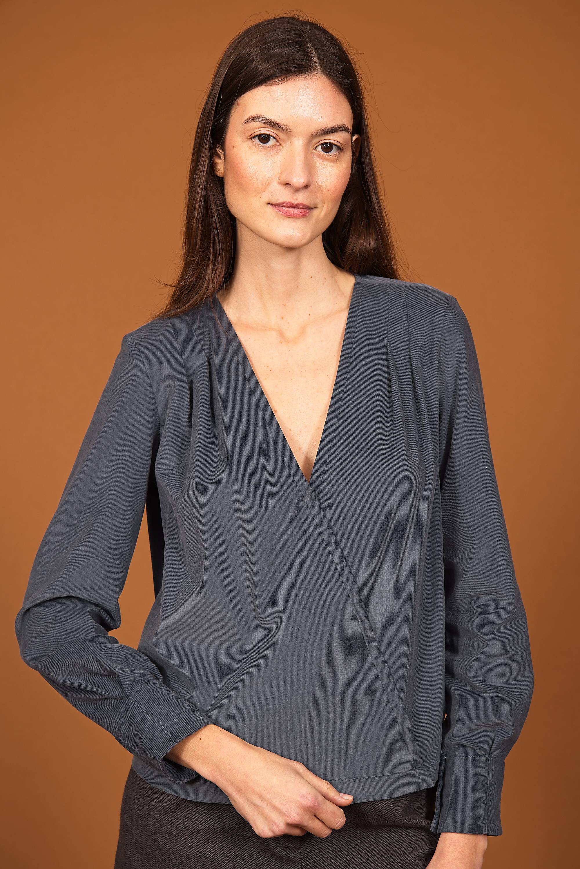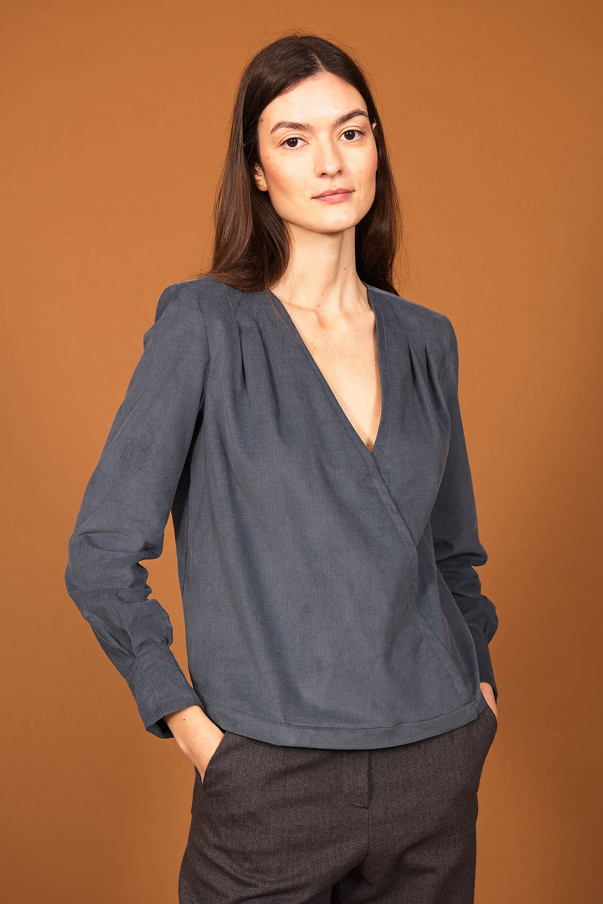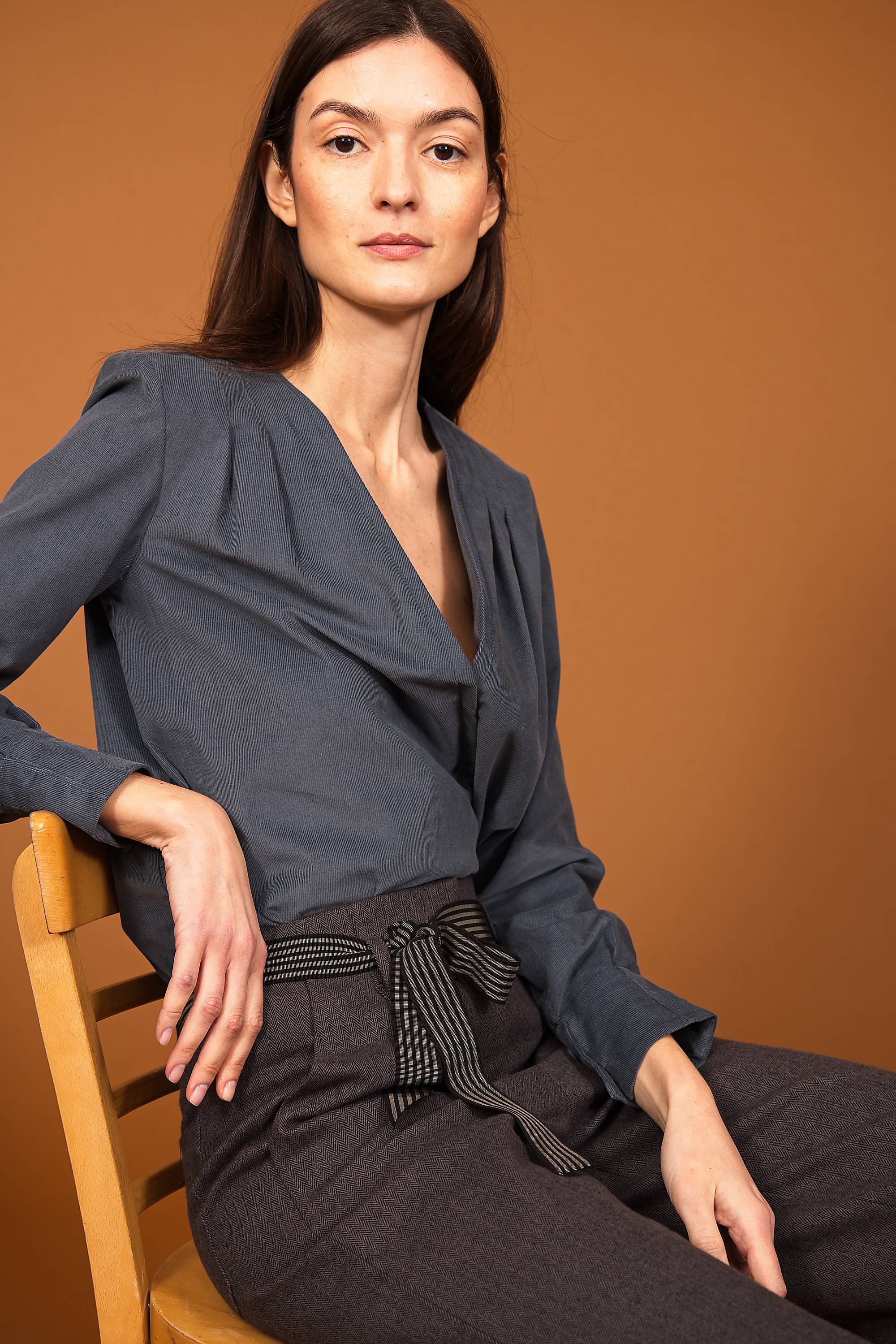 Blouse porte feuille trompe l’oeil. Plis sur l’épaule, manches longues, poignets fermés par 2 boutons, plis dos, longueur petites hanches.