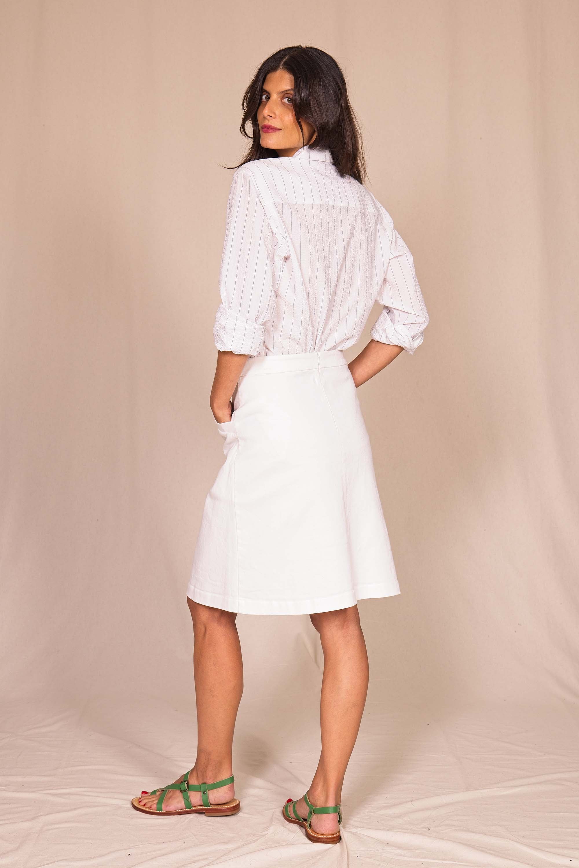 Julia porte ici la chemise MARCEAU blanche avec beaucoup d'élégance et de fraicheur.