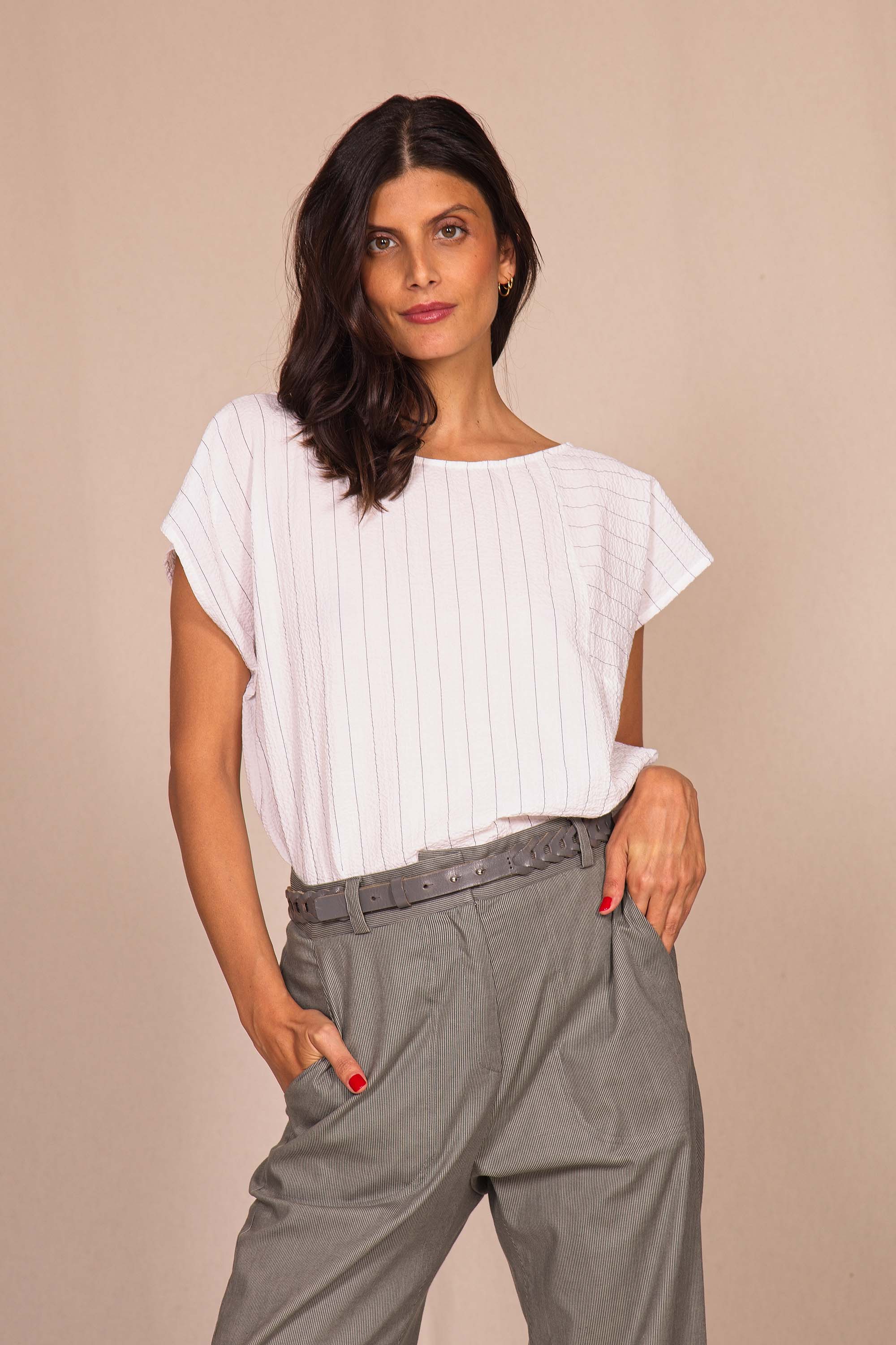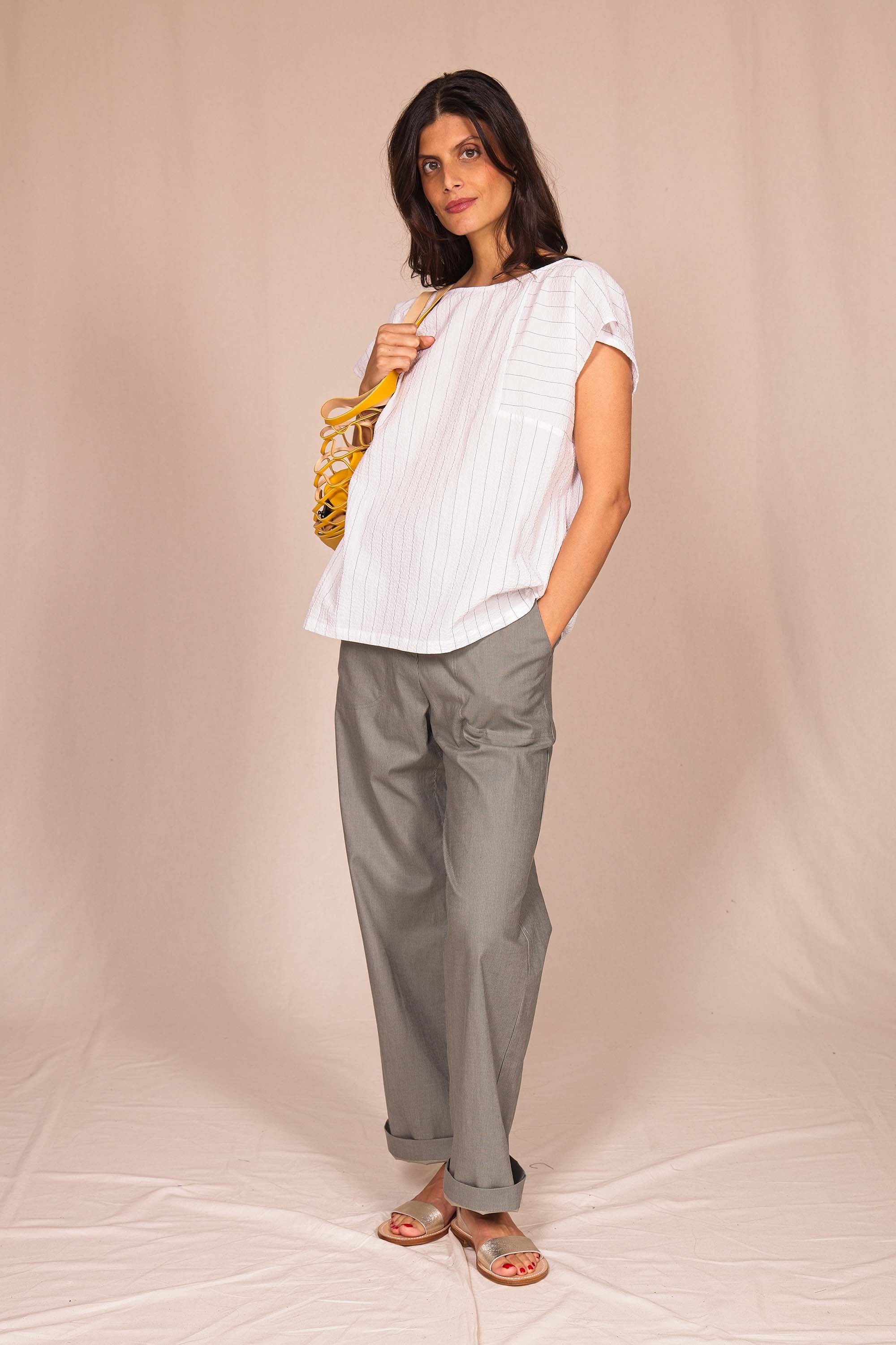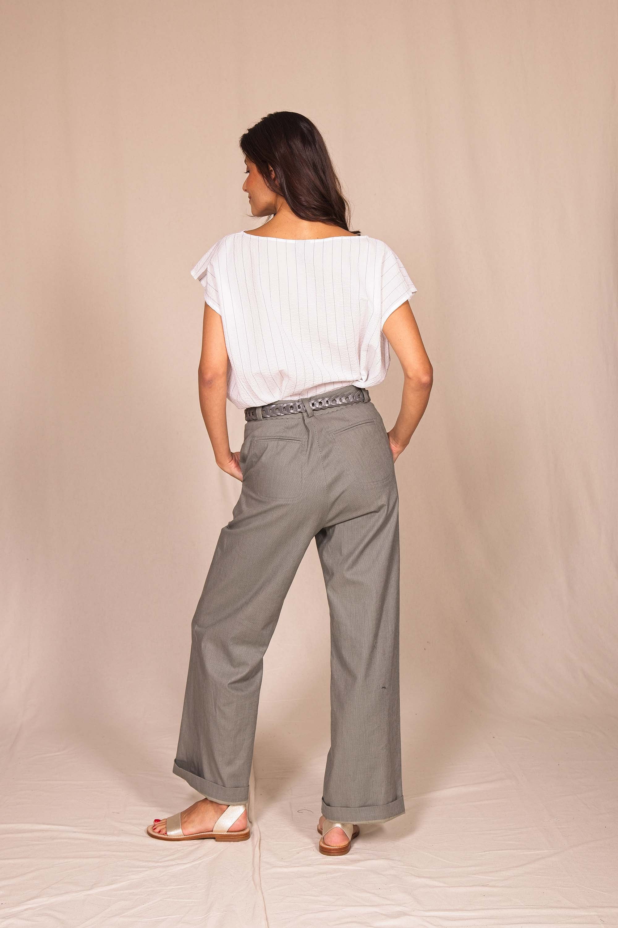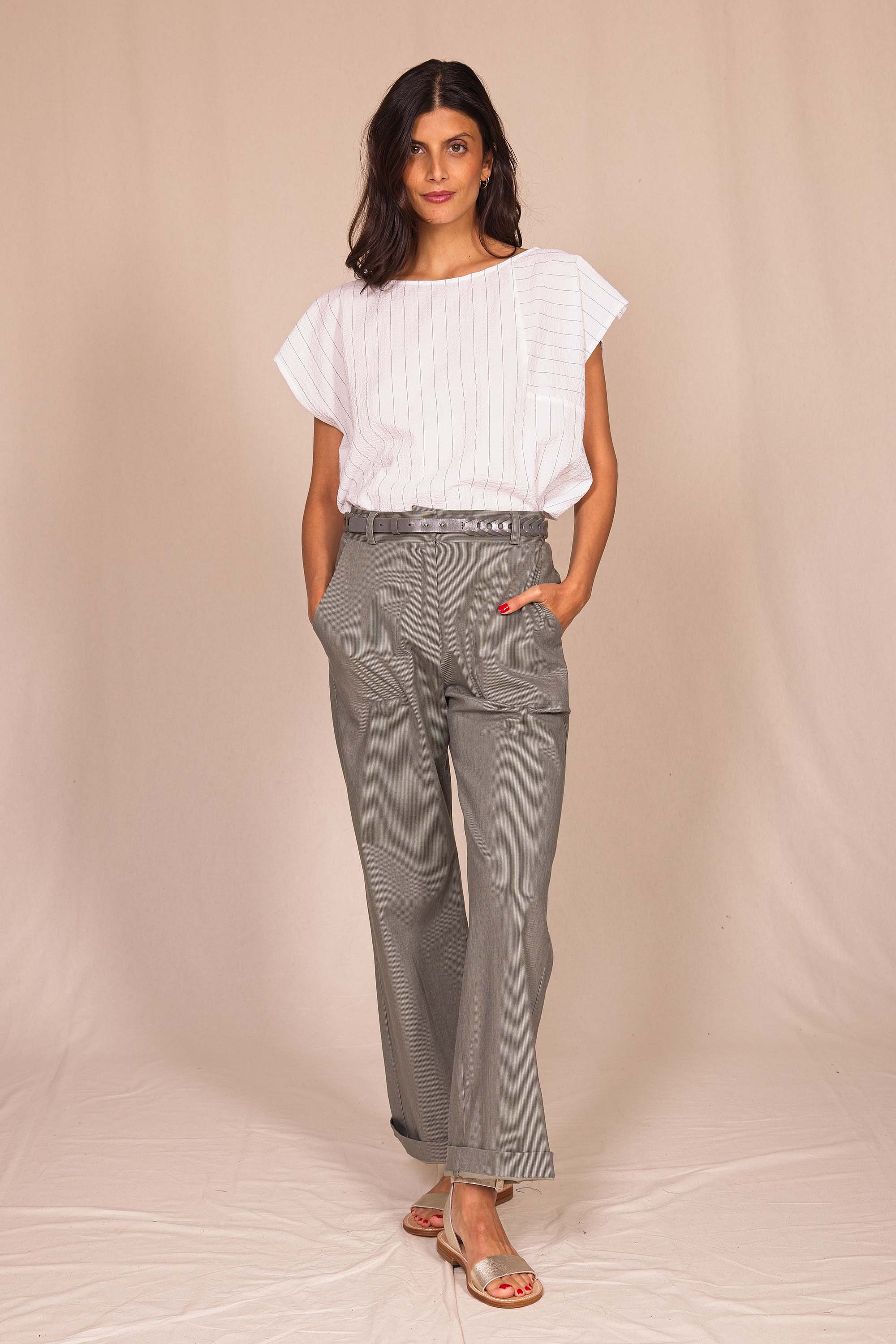 Elégant et confortable, ce pantalon gris se distingue par sa matière légère et sa coupe droite et structurée.