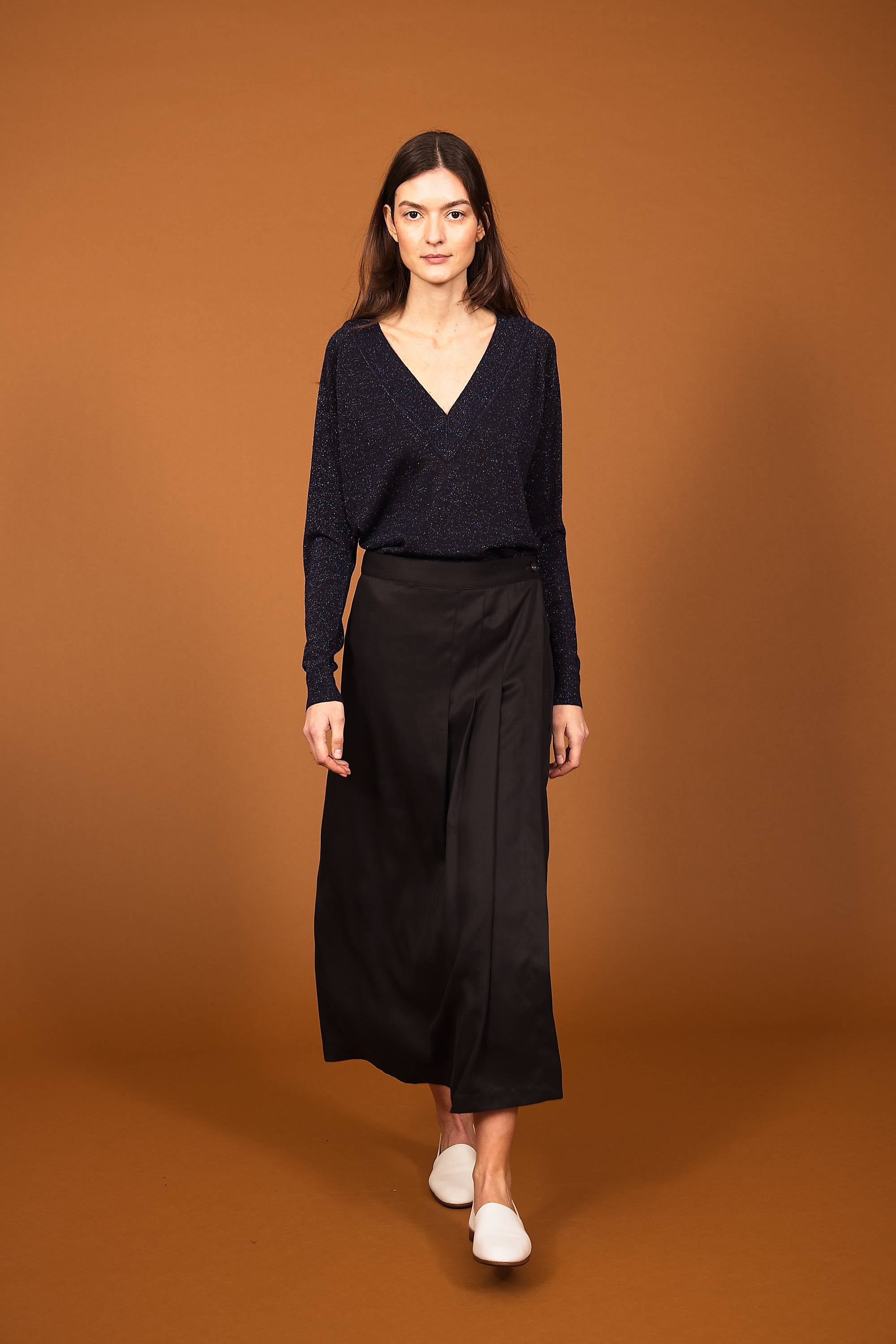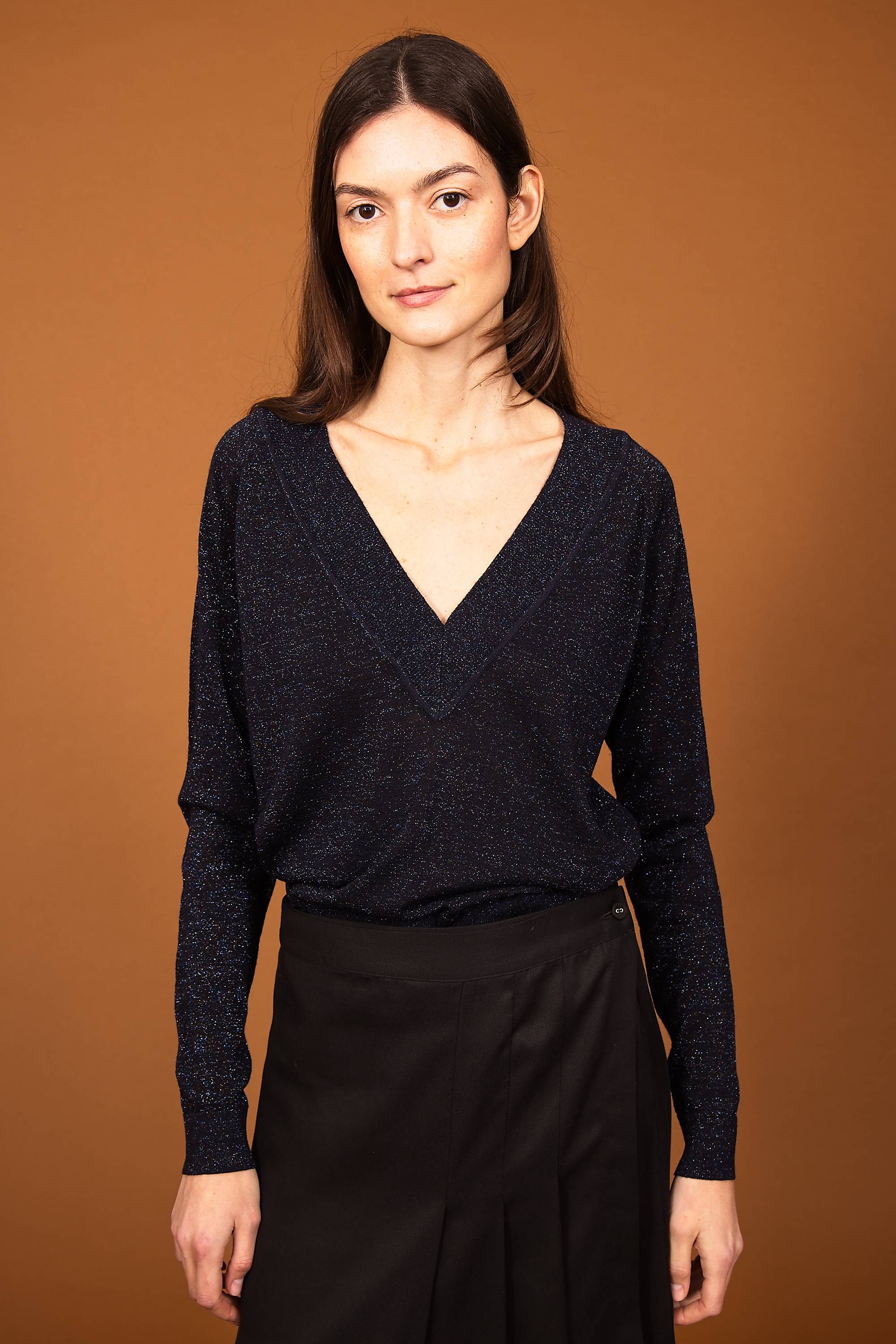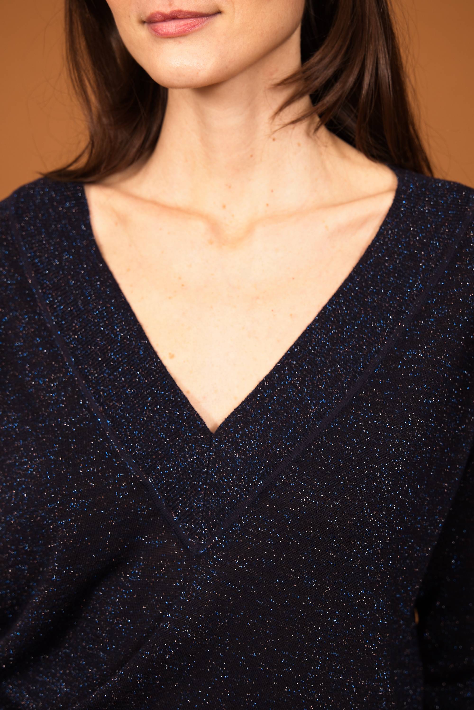 Pull en laine et lurex, grand col V fil italien, fabriqué au Portugal