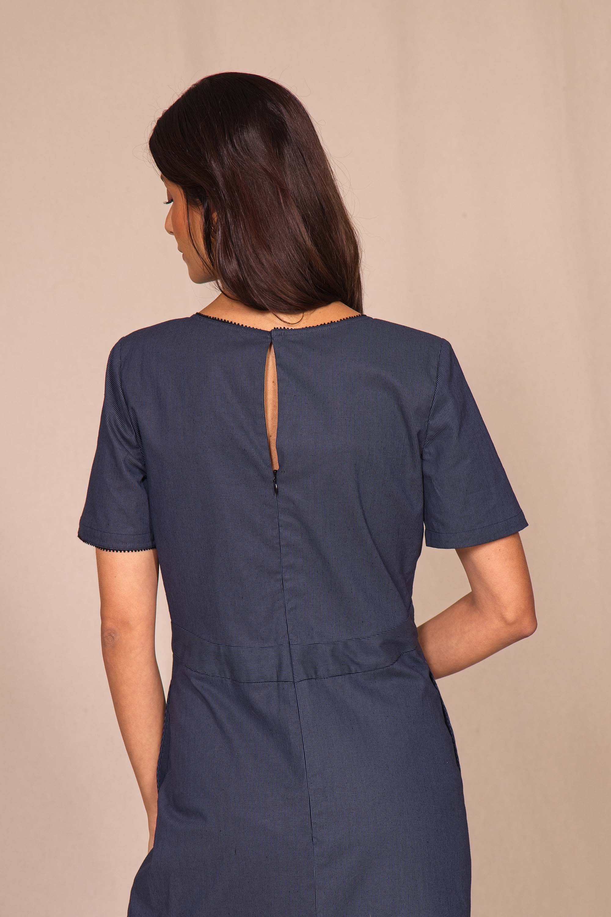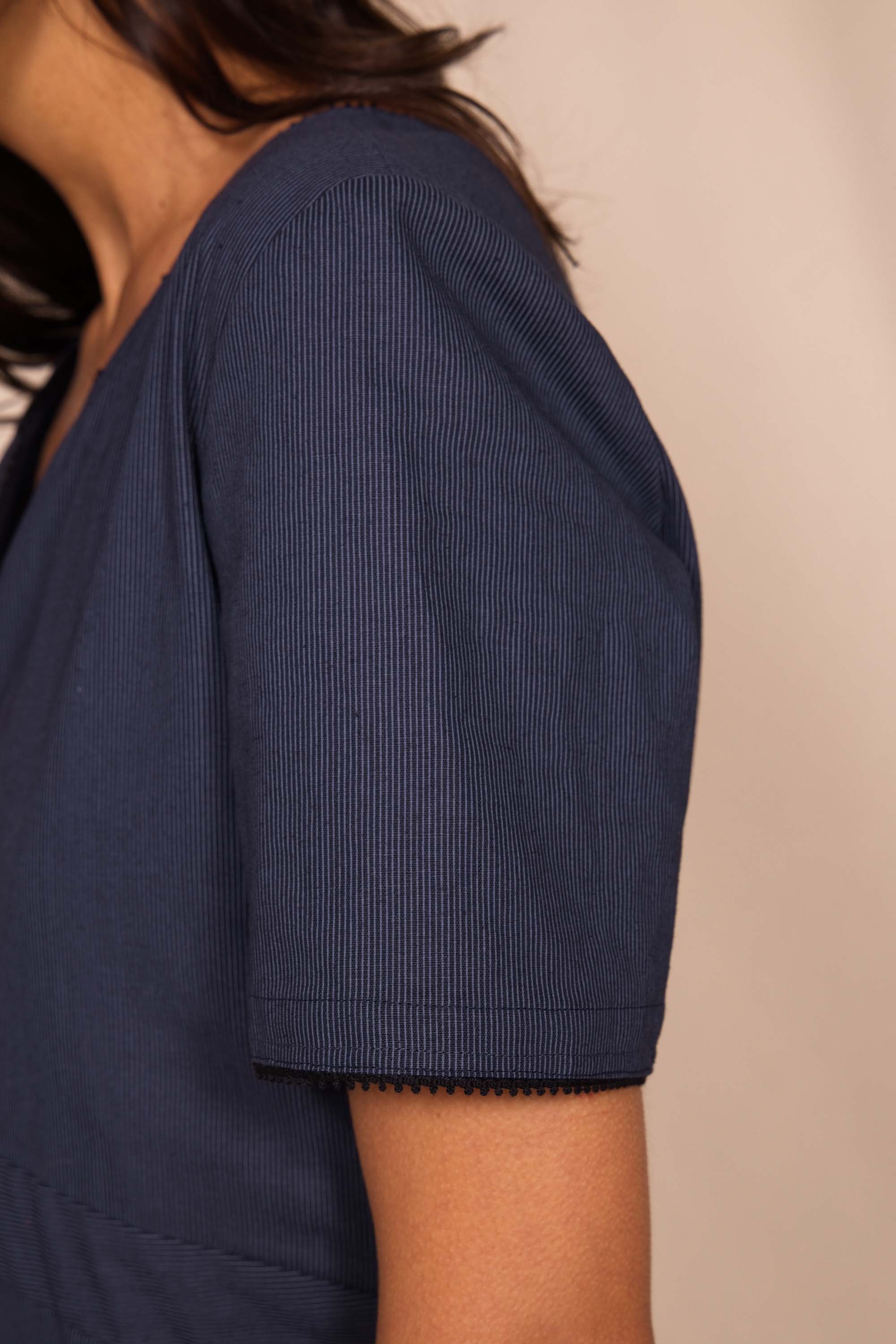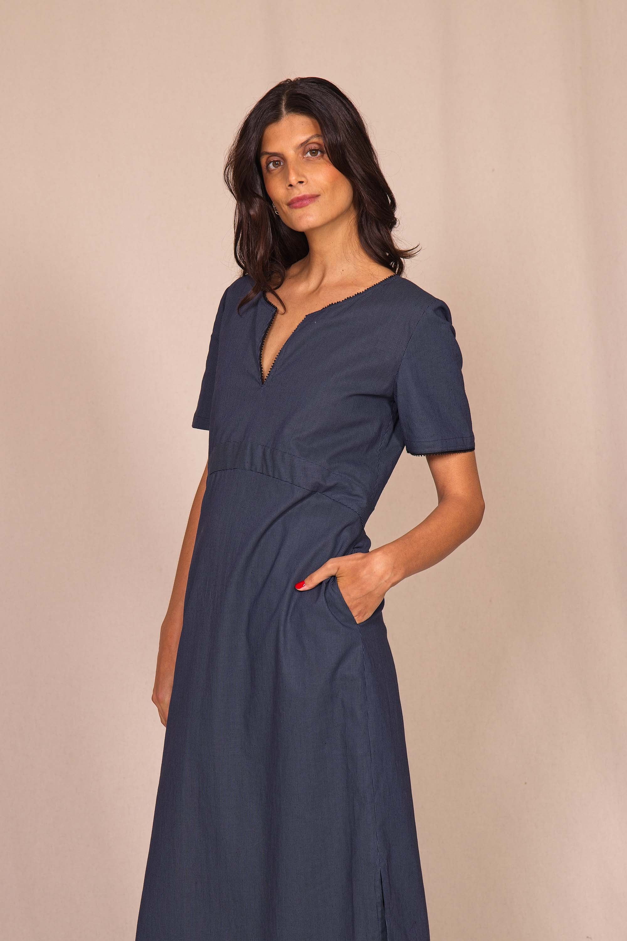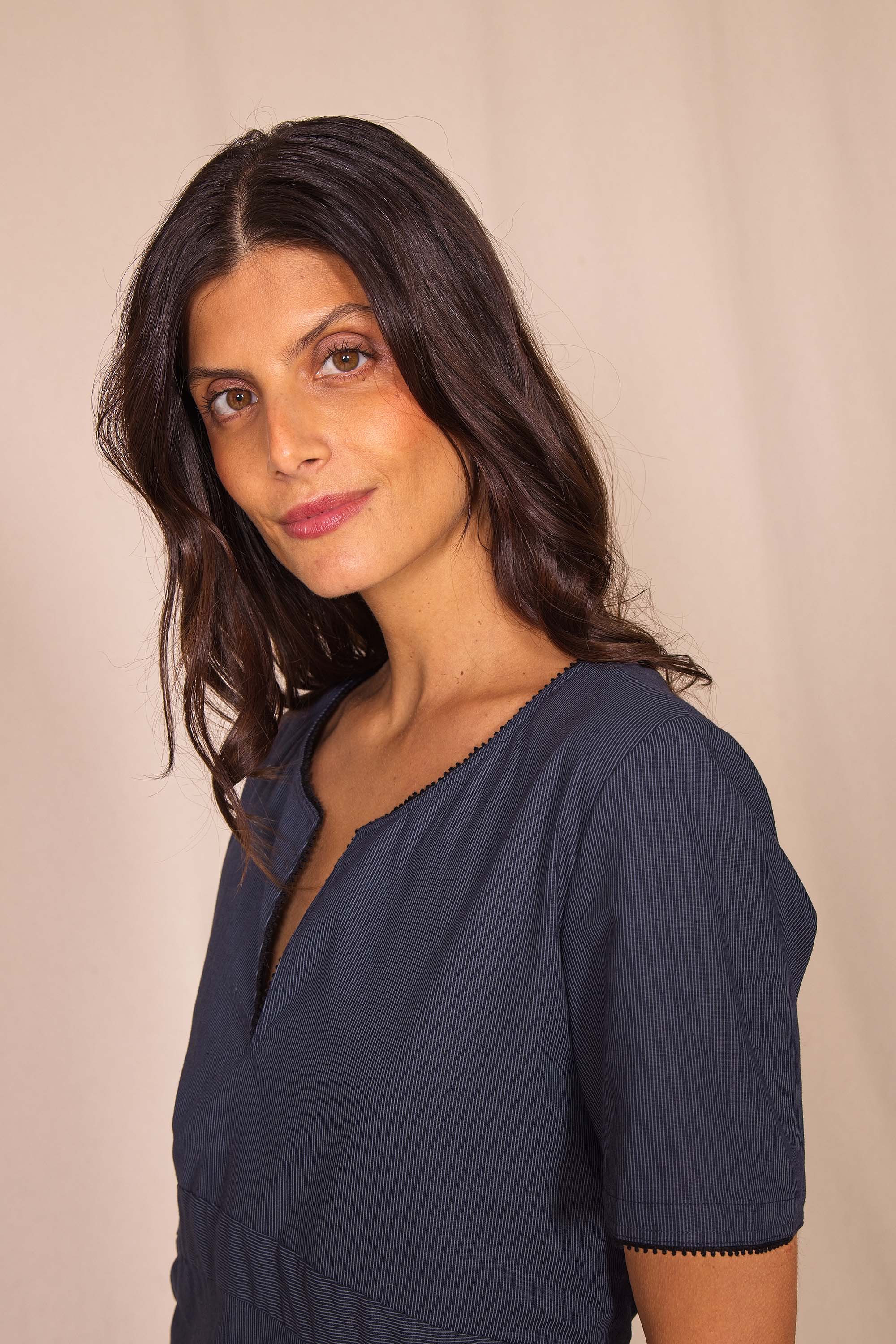 Bords soulignés par un passepoil noir, col tunisien au joli décolleté V, 2 poches invisibles, fermeture au dos par une goutte et 2 fentes pour plus d'aisance.