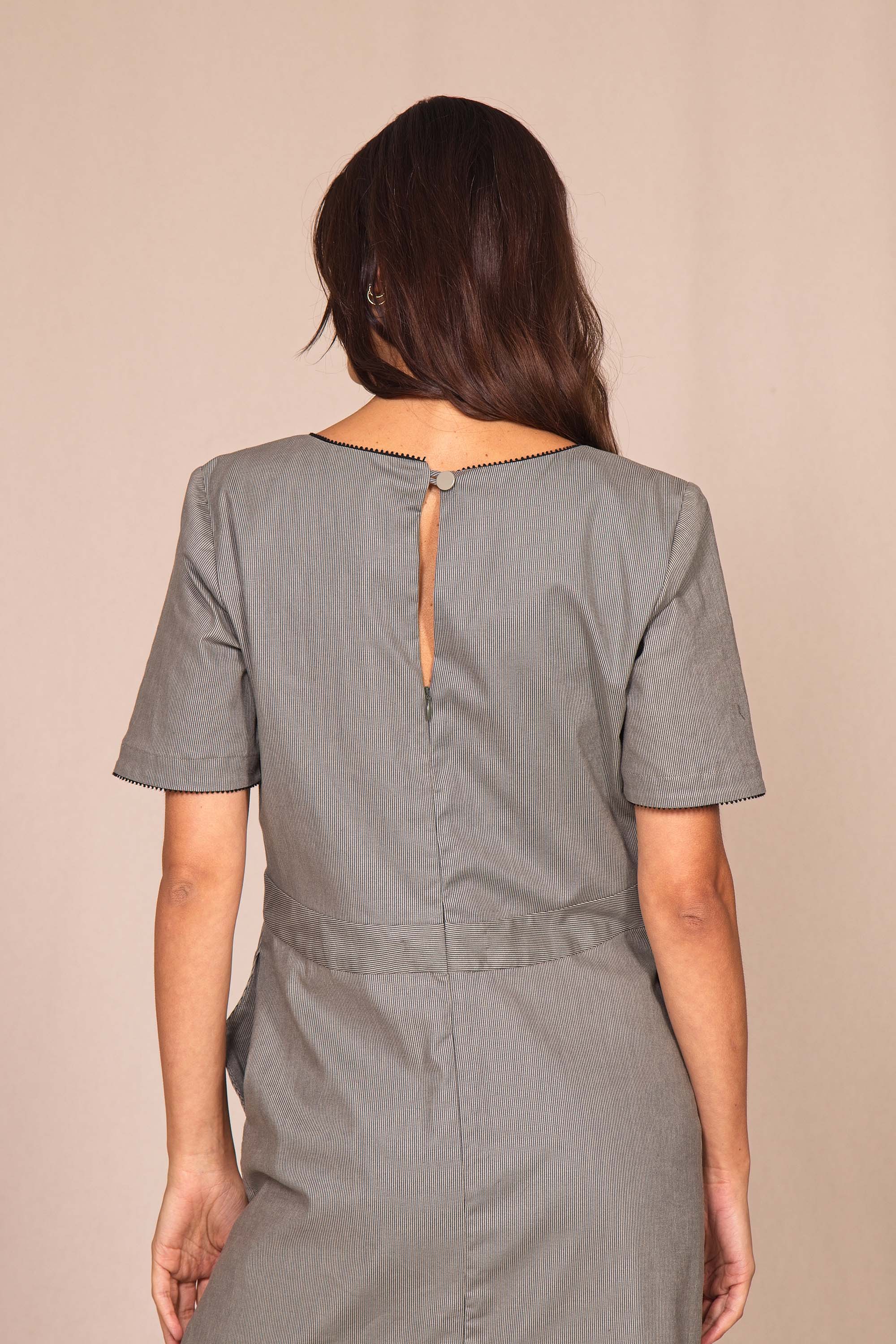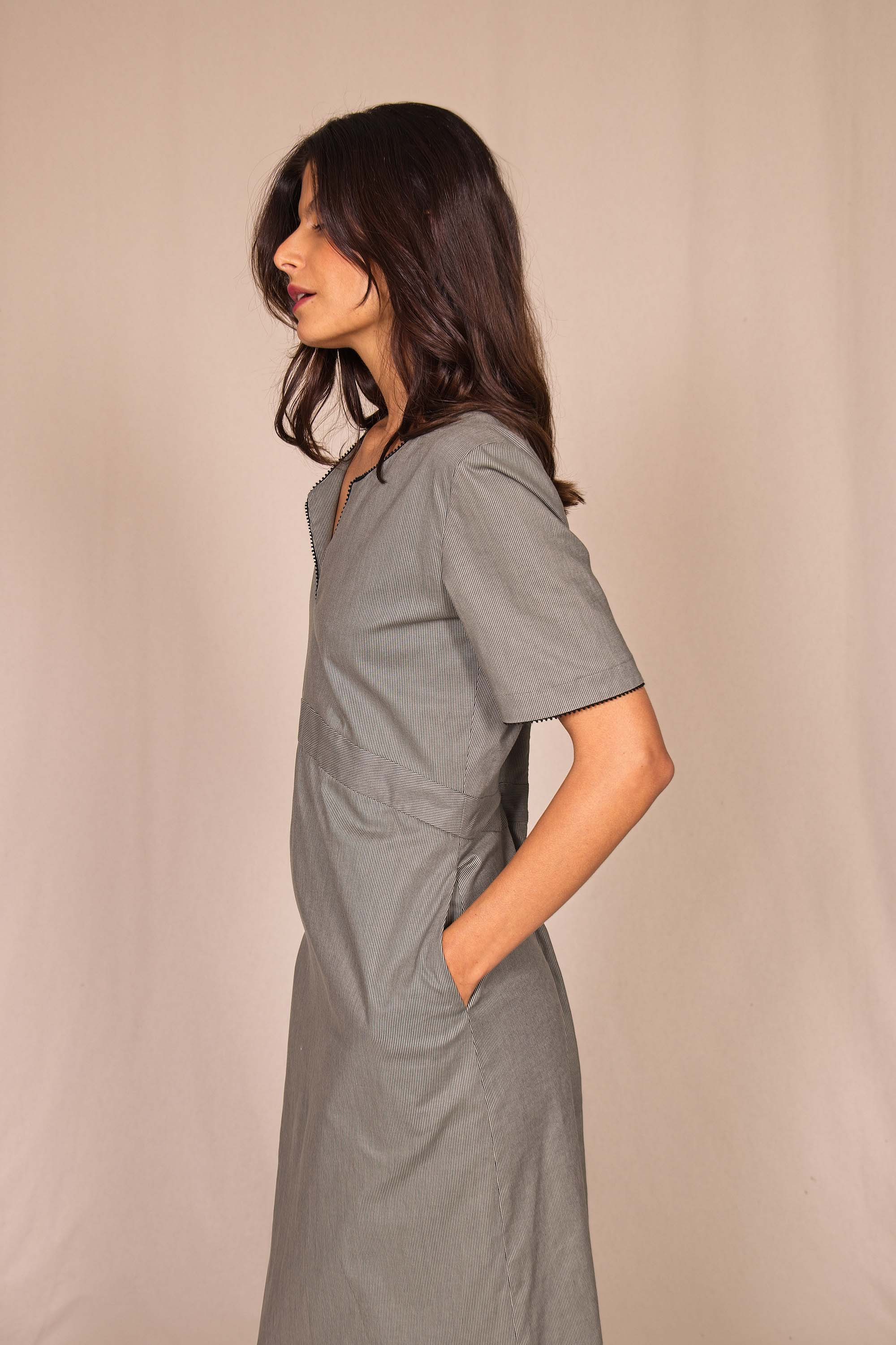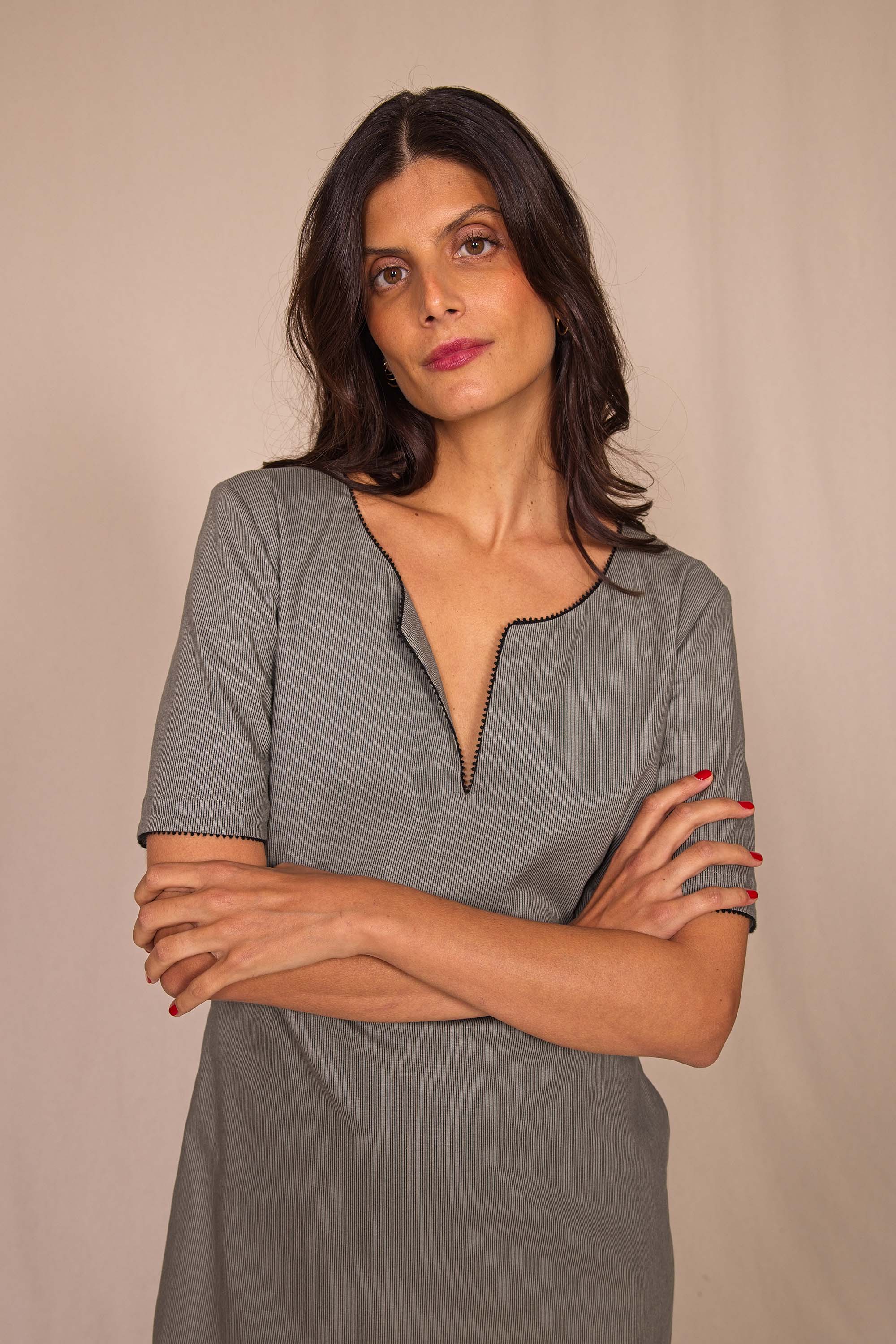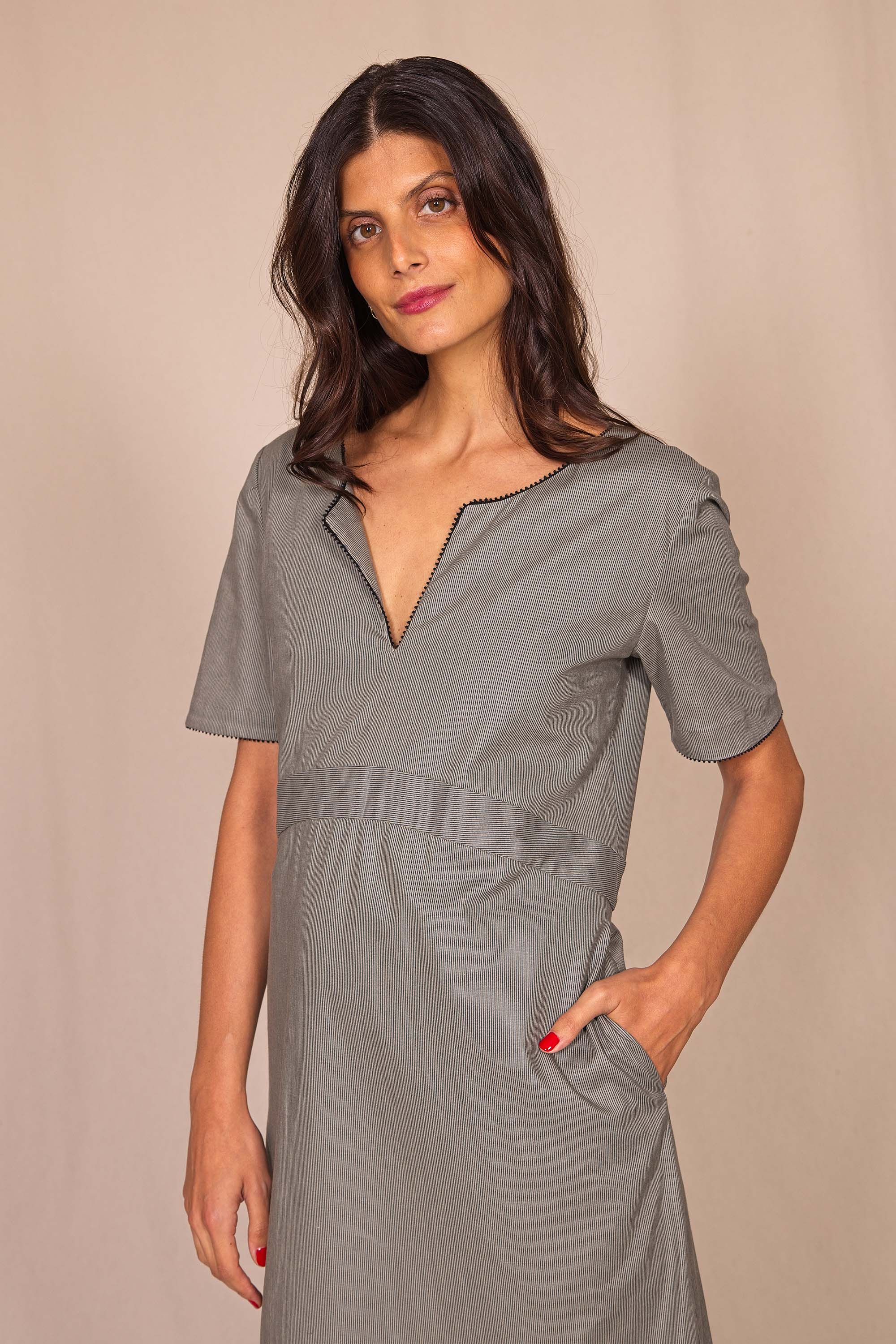 Bords soulignés par un passepoil noir, col tunisien au joli décolleté V, 2 poches invisibles, fermeture au dos par une goutte et 2 fentes pour plus d'aisance.