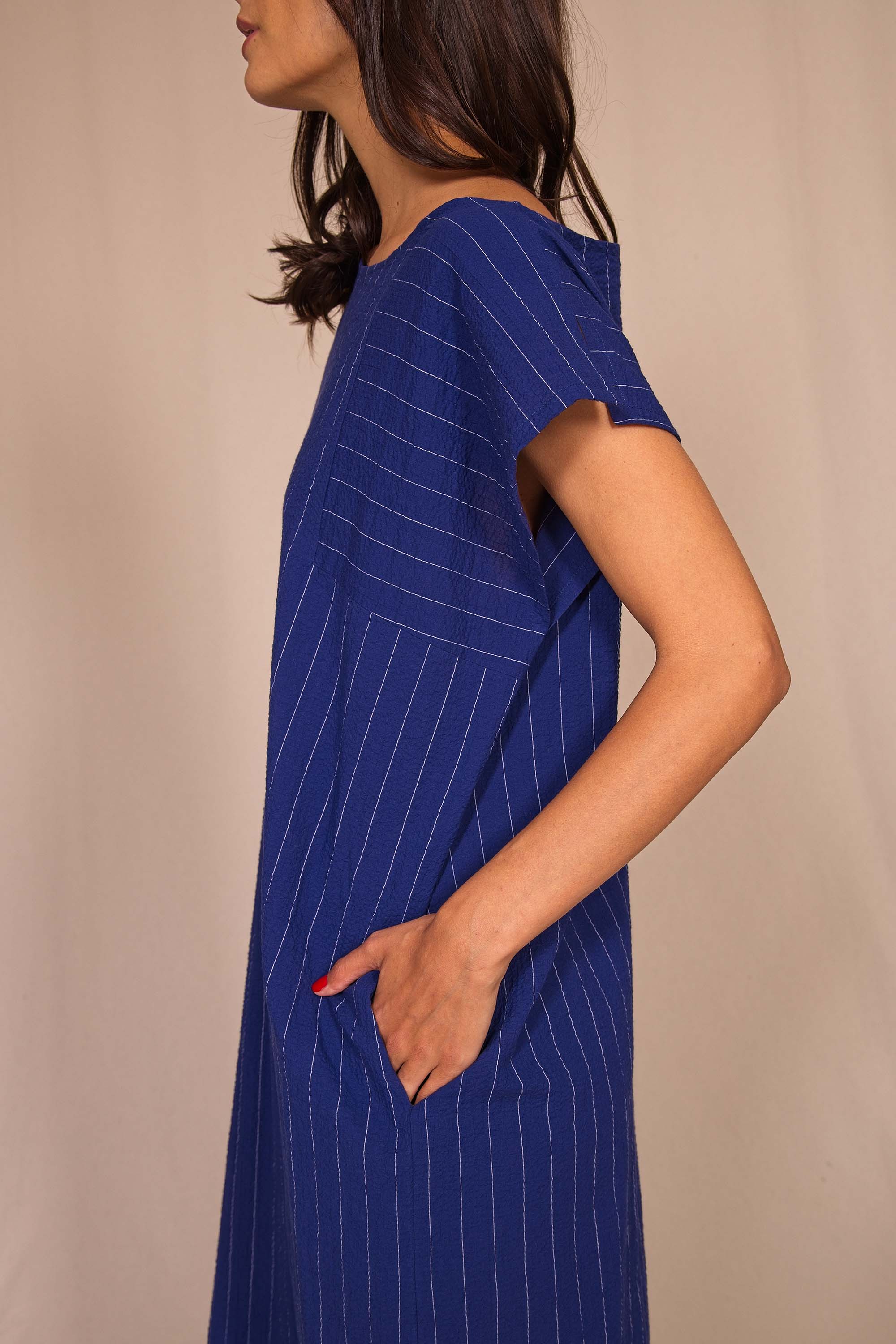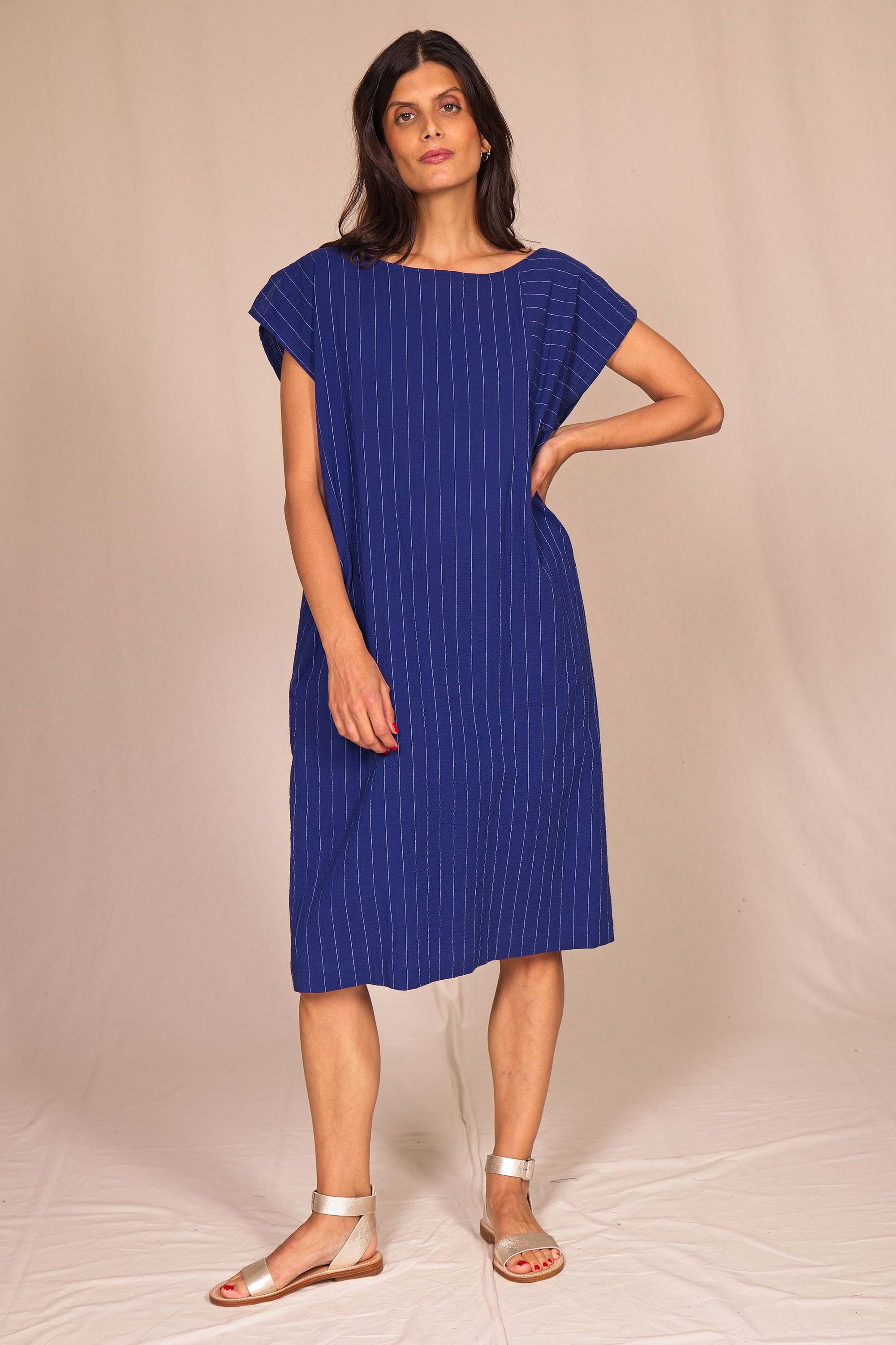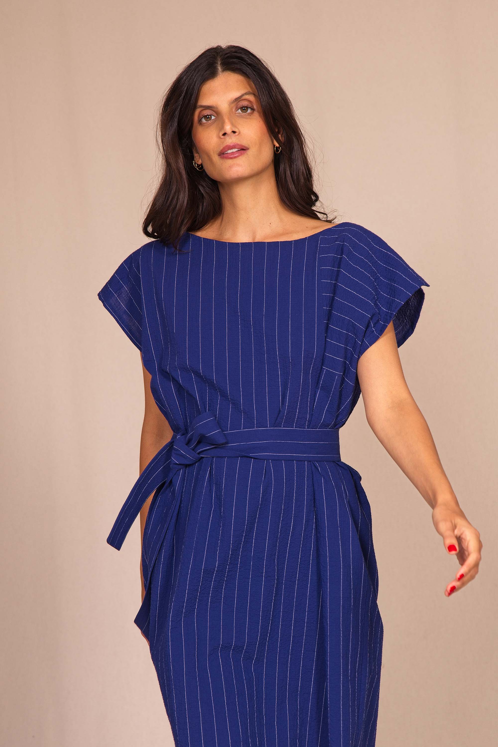 Jolie robe estivale qui se distingue par sa coupe graphique. Légère et très confortable, portez-la avec ou sans ceinture et des sandales pour un look très féminin. Colori bleu.