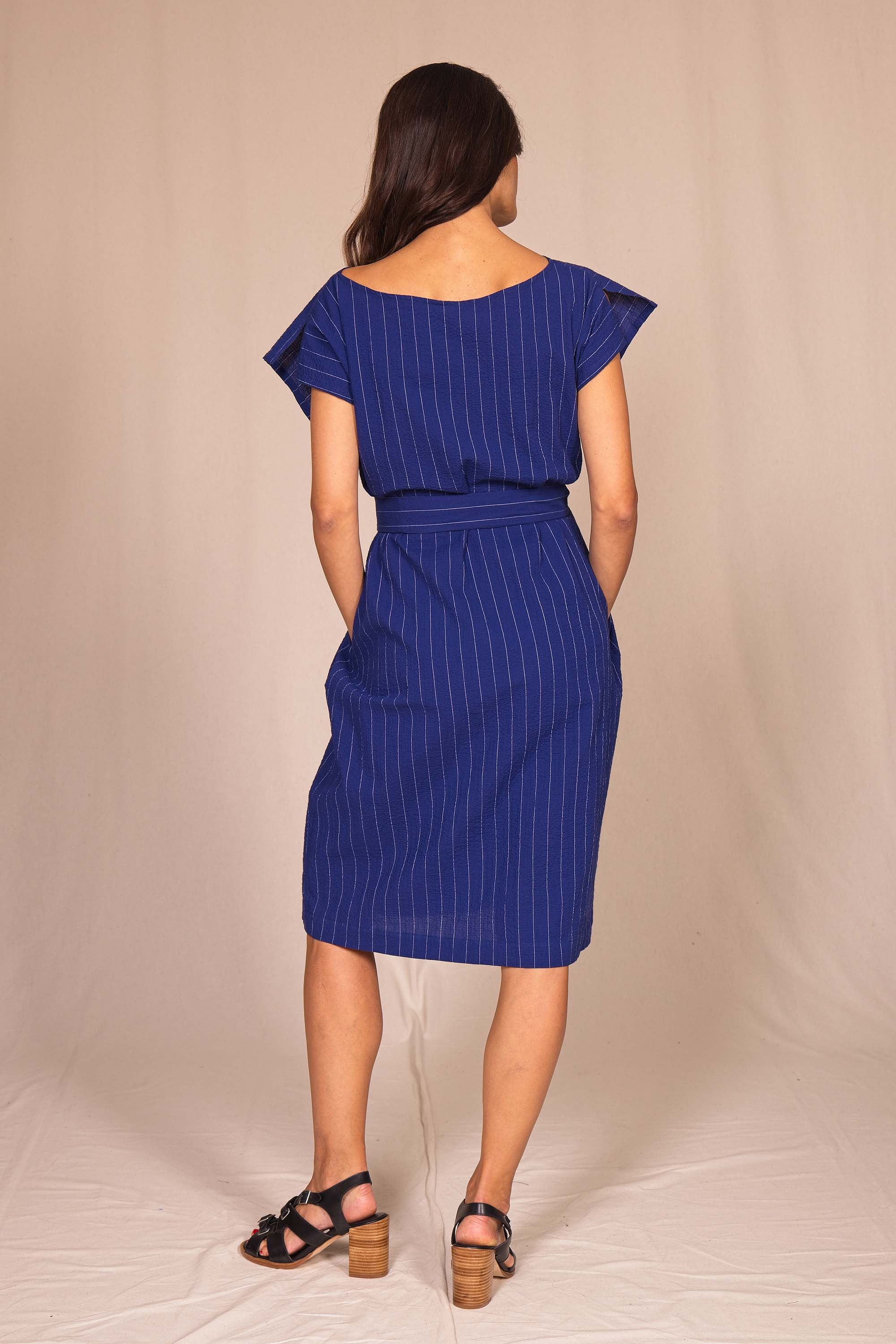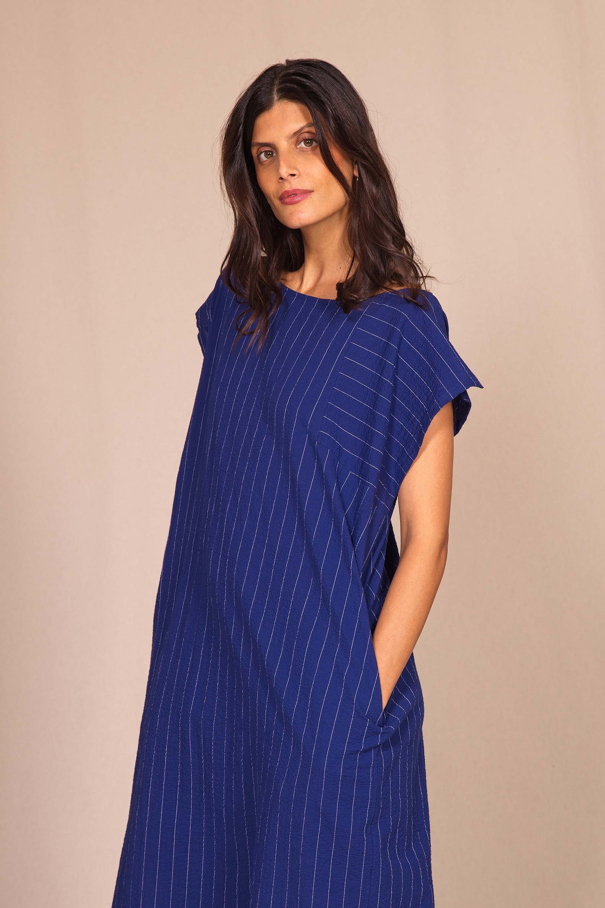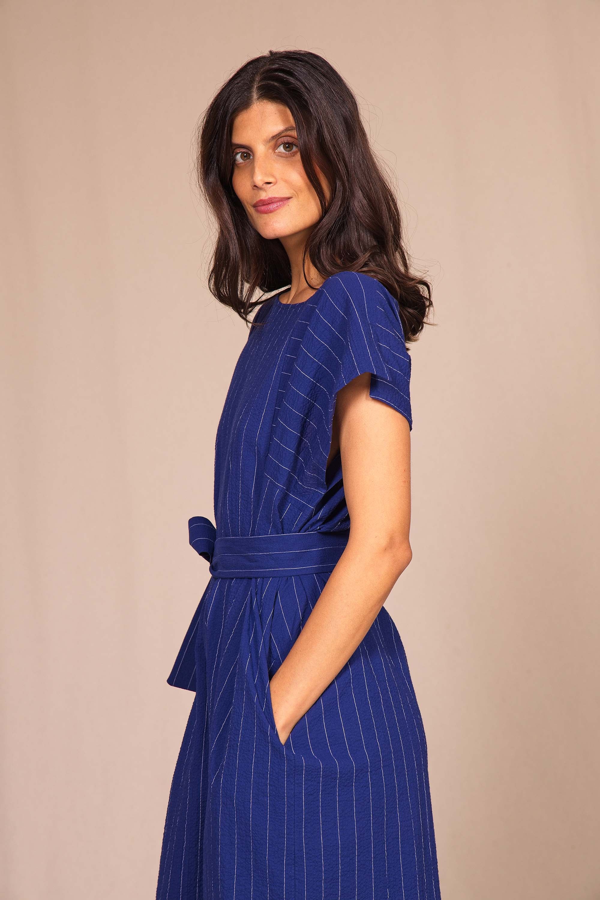 Jolie robe estivale qui se distingue par sa coupe graphique. Légère et très confortable, portez-la avec ou sans ceinture et des sandales pour un look très féminin. Colori bleu.