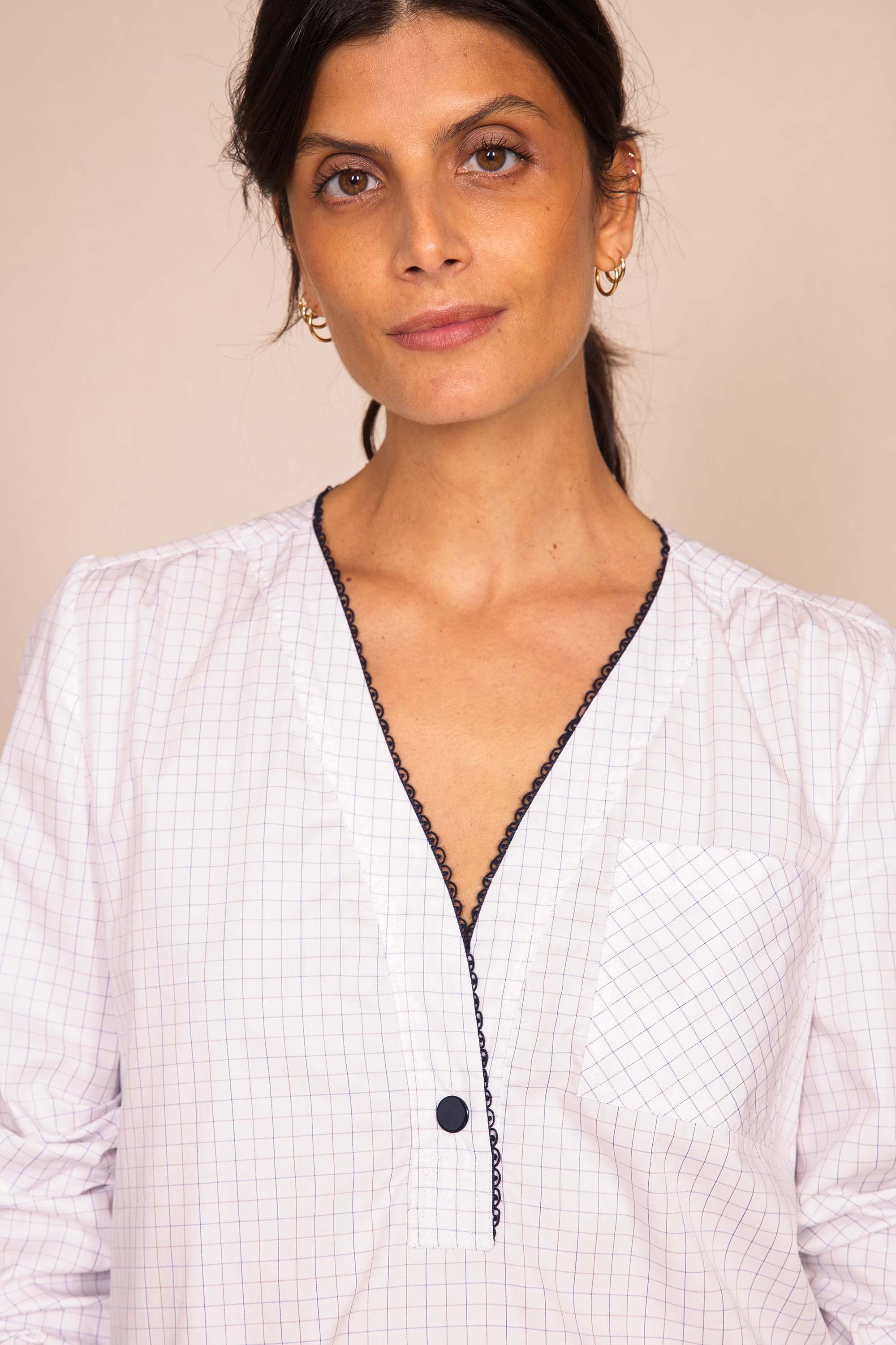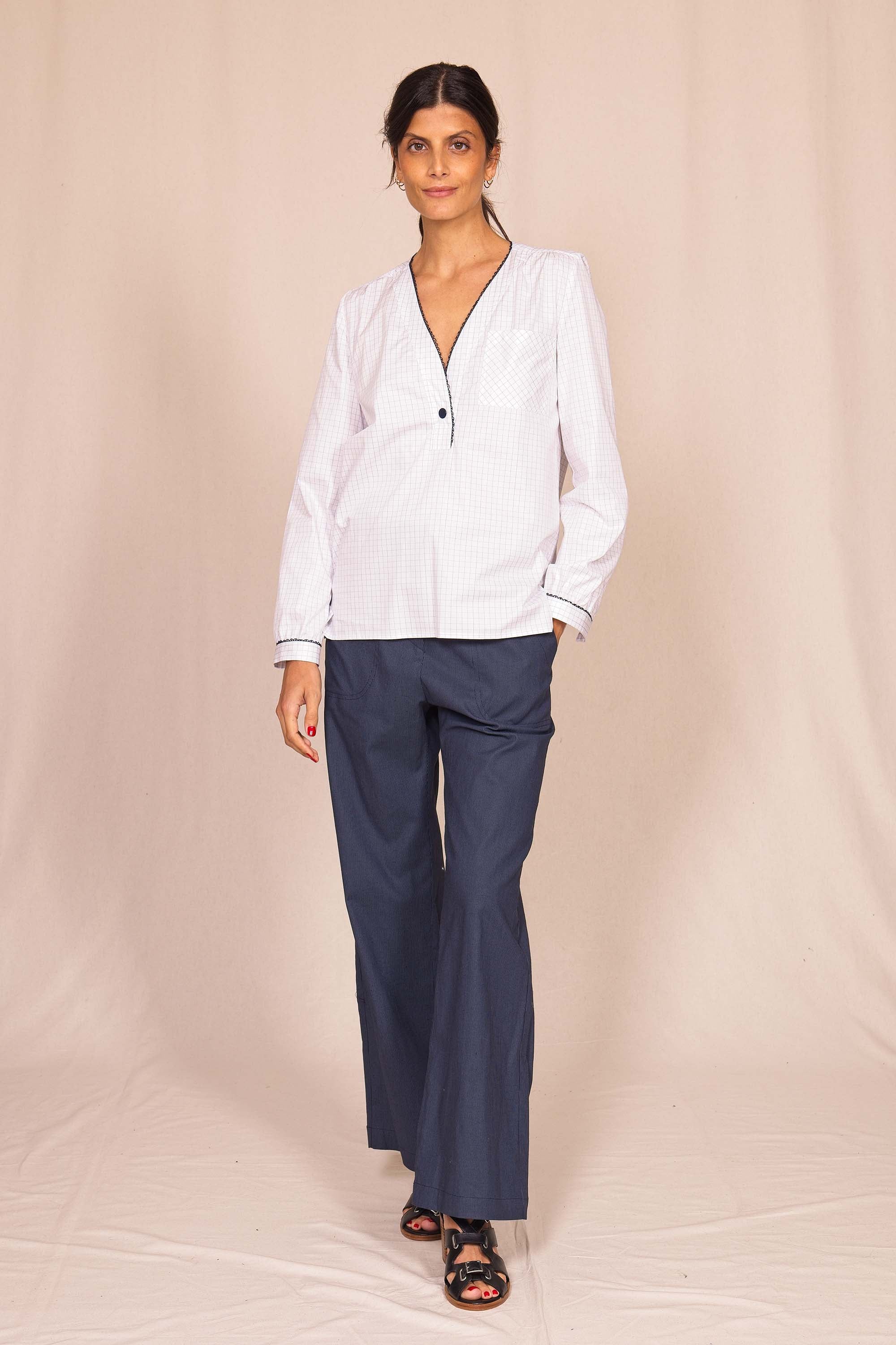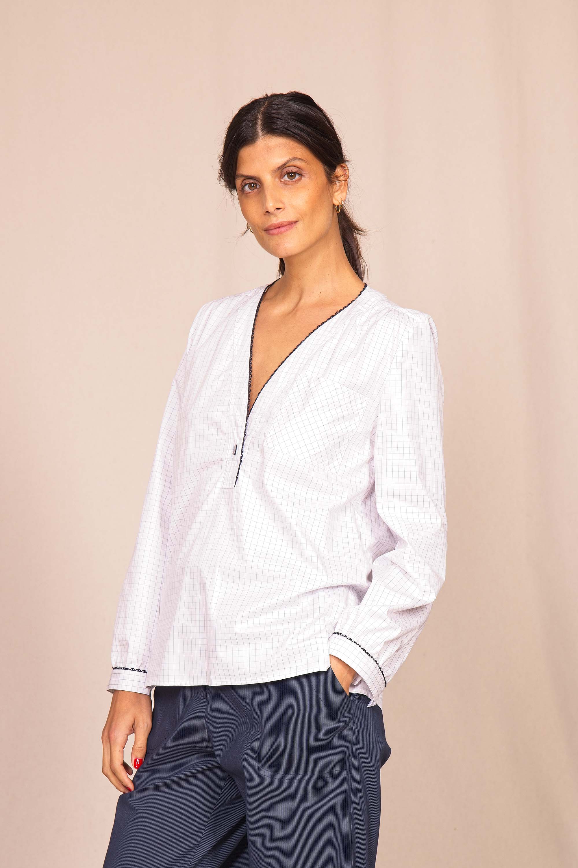 Misez sur la chemise CRUISE qui se distingue par ses courbes soulignées d'un passepoil noir et d'un joli bouton qui vient joliment fermer son encolure en V.