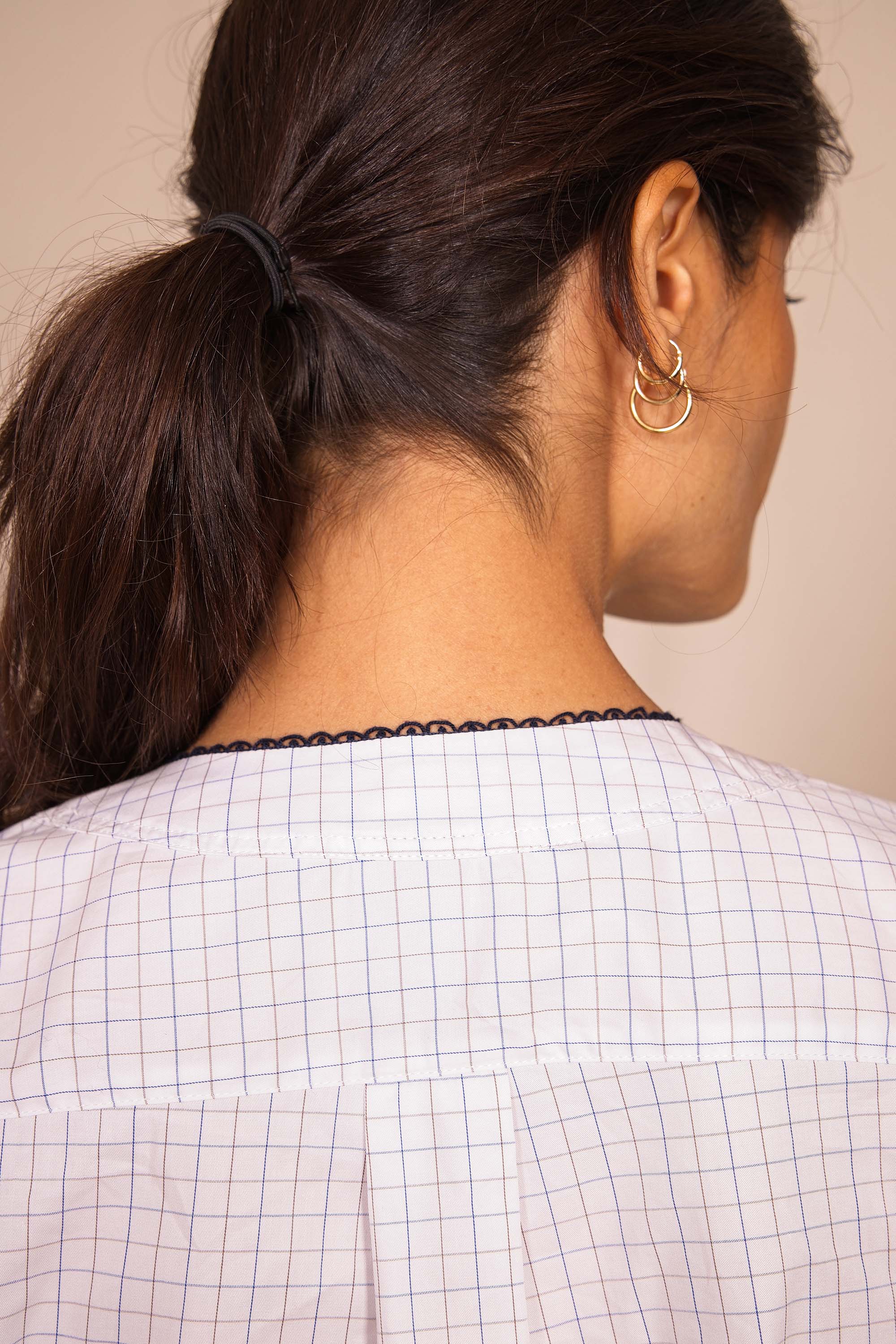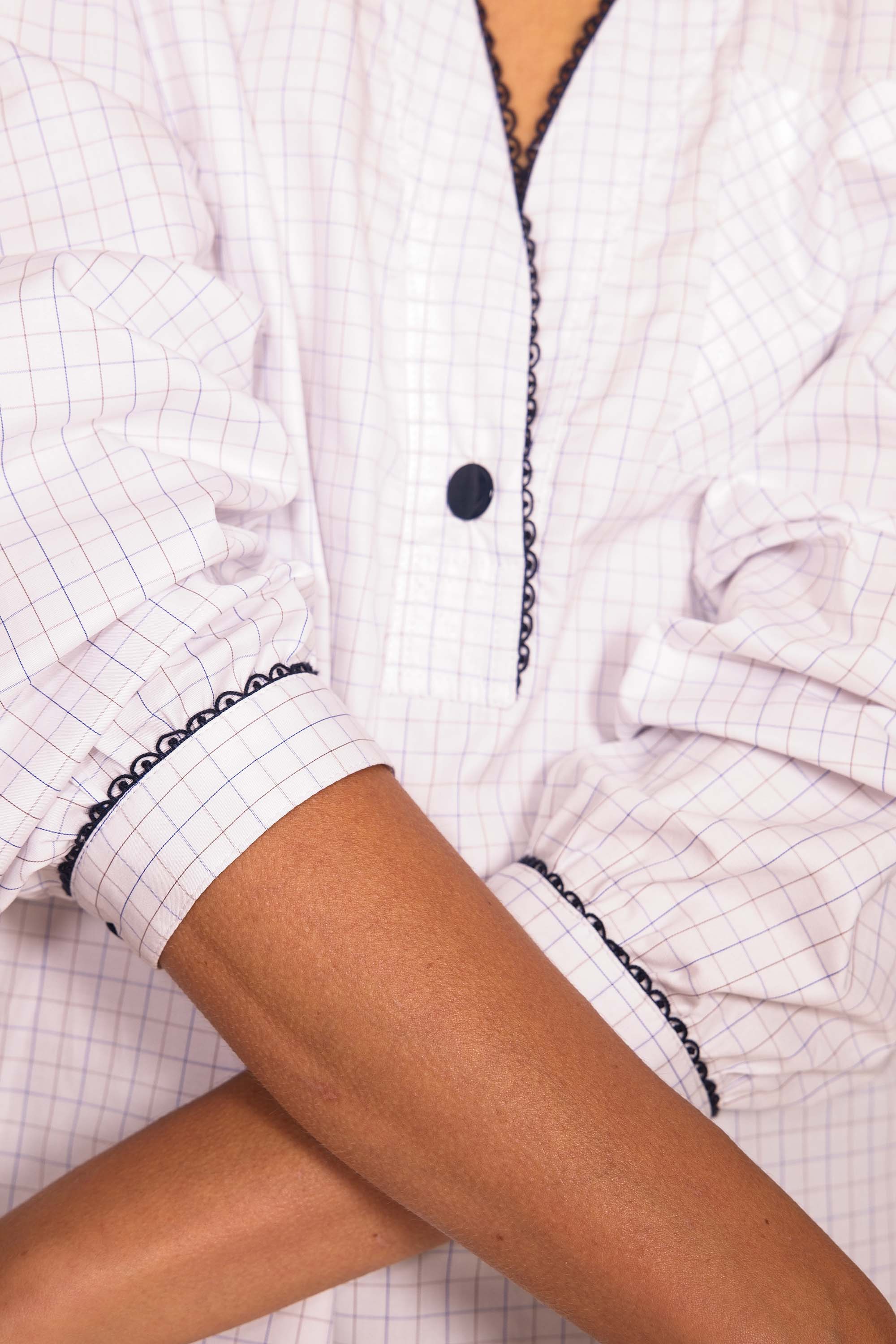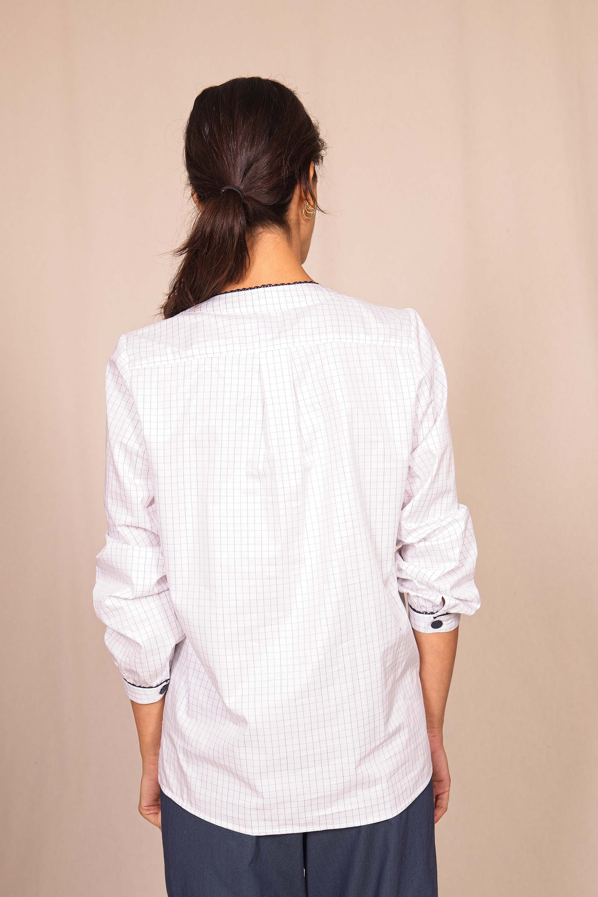 Misez sur la chemise CRUISE qui se distingue par ses courbes soulignées d'un passepoil noir et d'un joli bouton qui vient joliment fermer son encolure en V.
