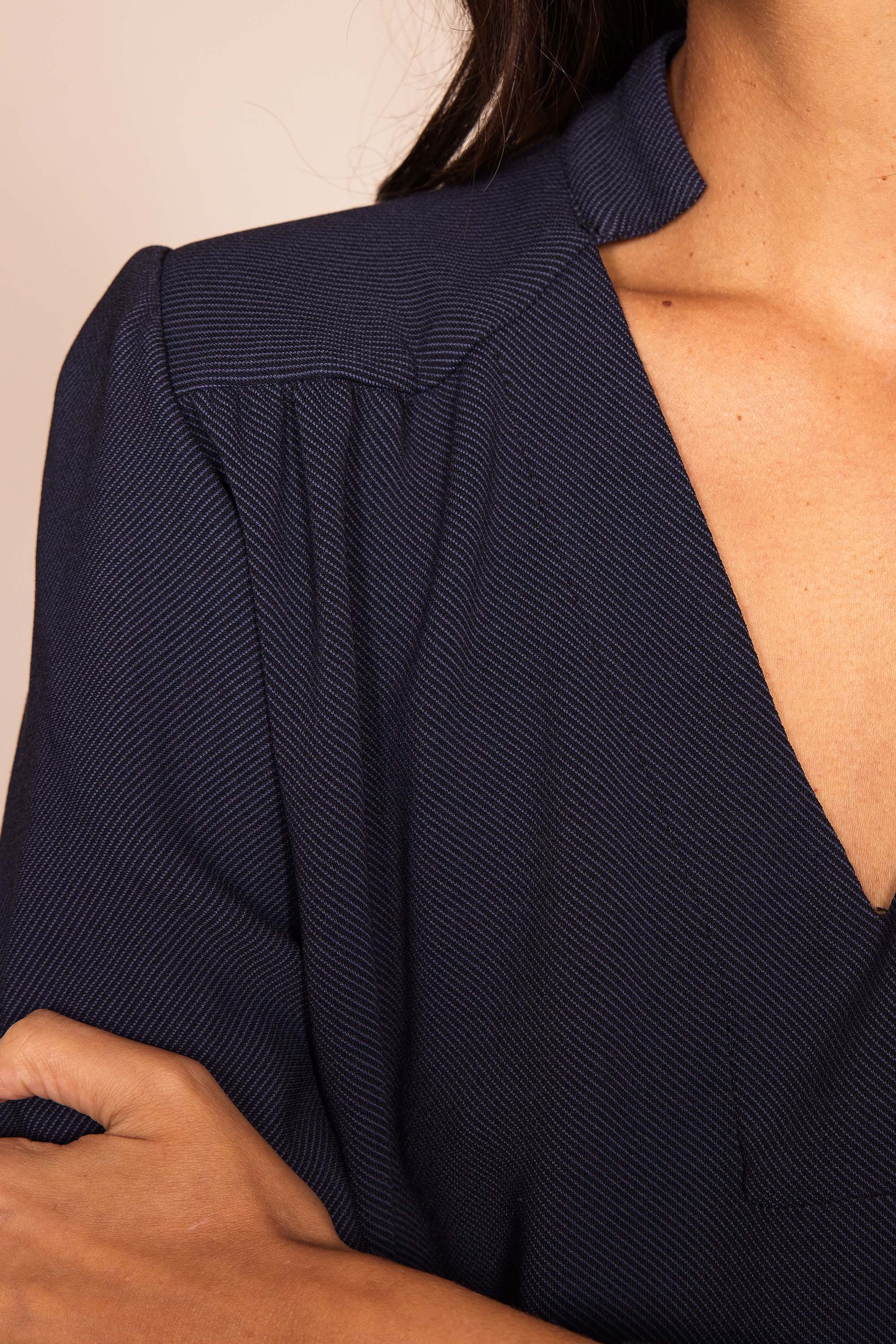 Blouse à manches longues, iconique de la maison Anne Willi. Décolleté V et petit col tunisien, poignets resserrés par un bouton.