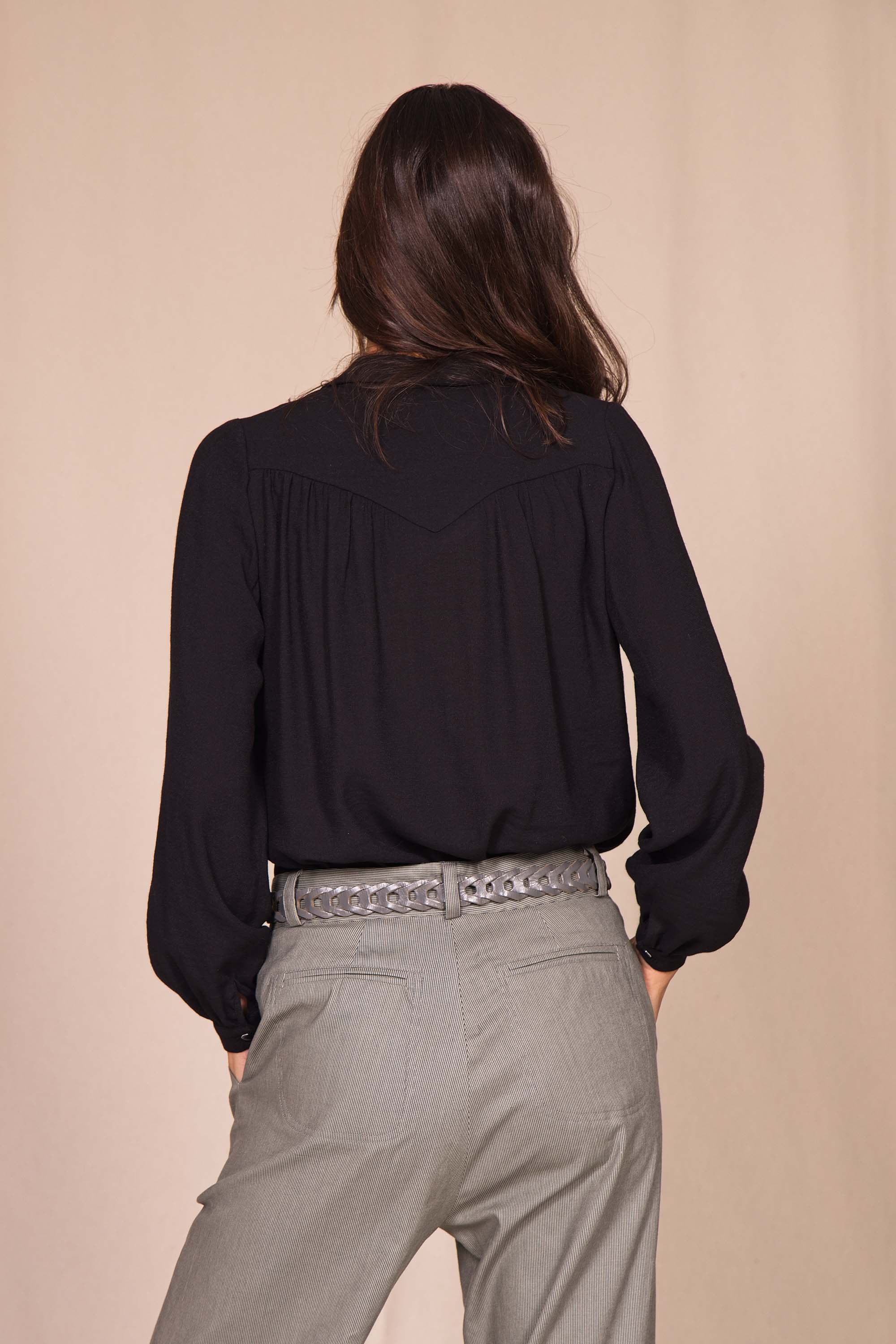 La pièce à avoir dans son dressing ! Jolie blouse noire fluide à manches longues, très facile à assortir avec un bas chic ou décontracté, elle fera forcément son petit effet !
