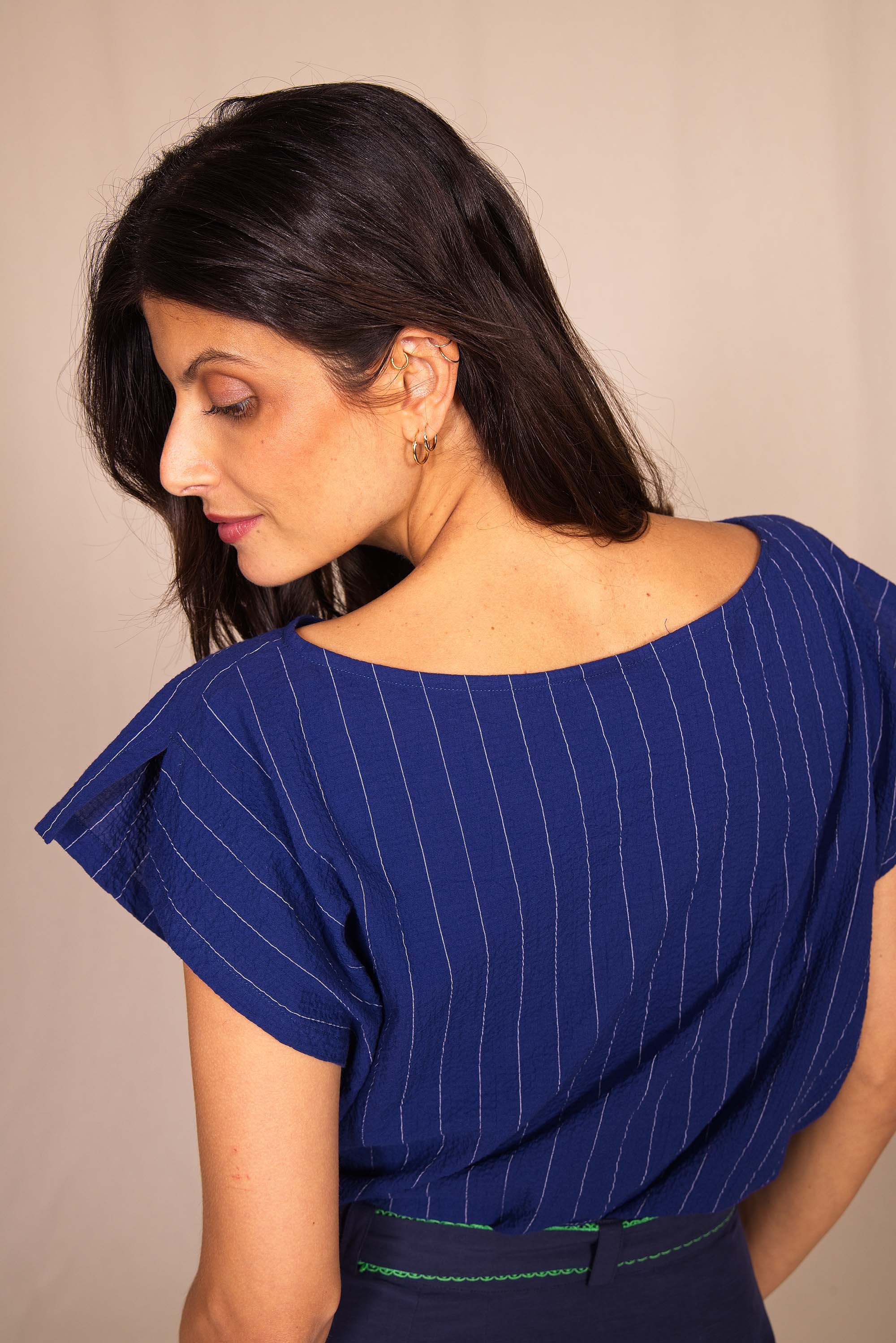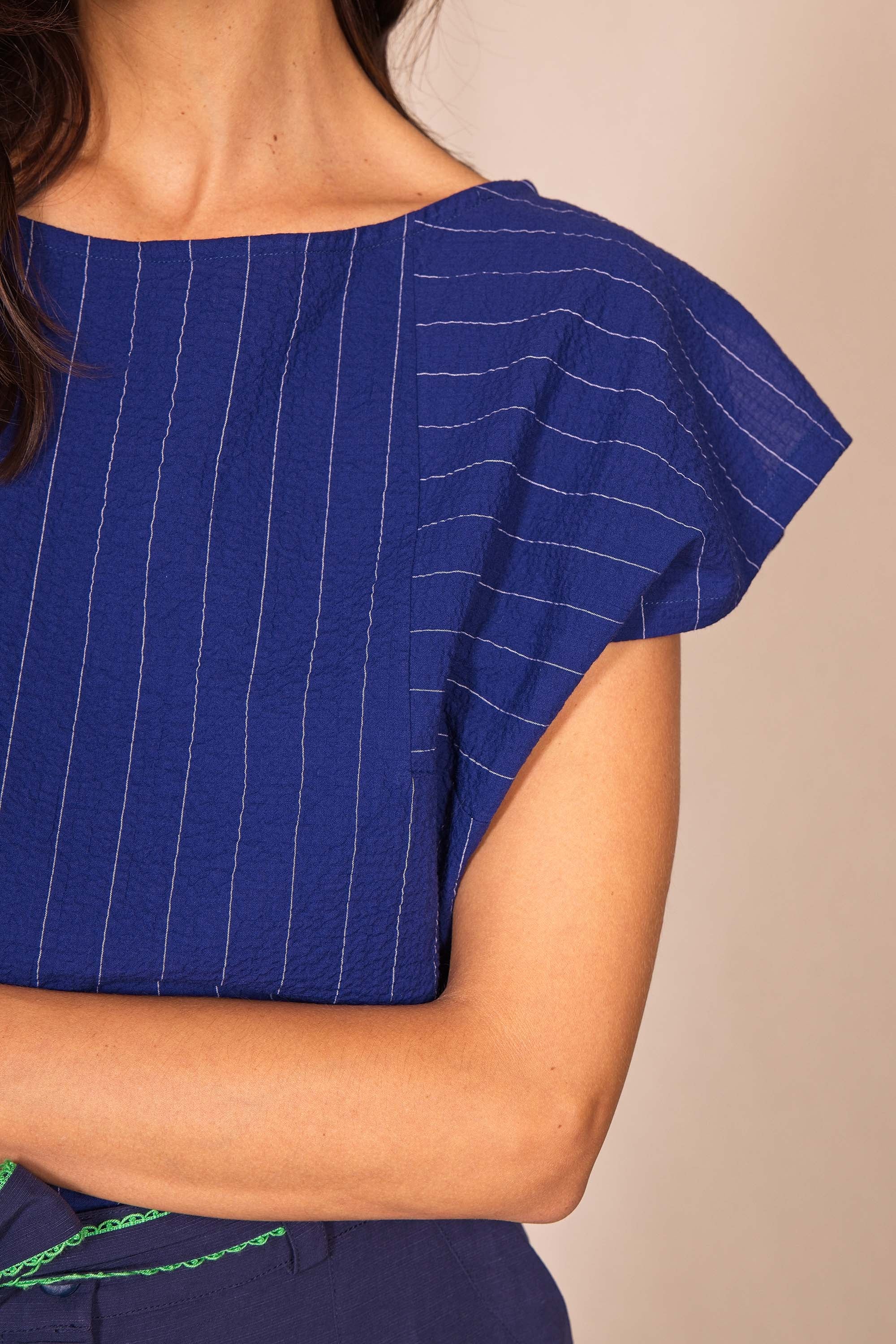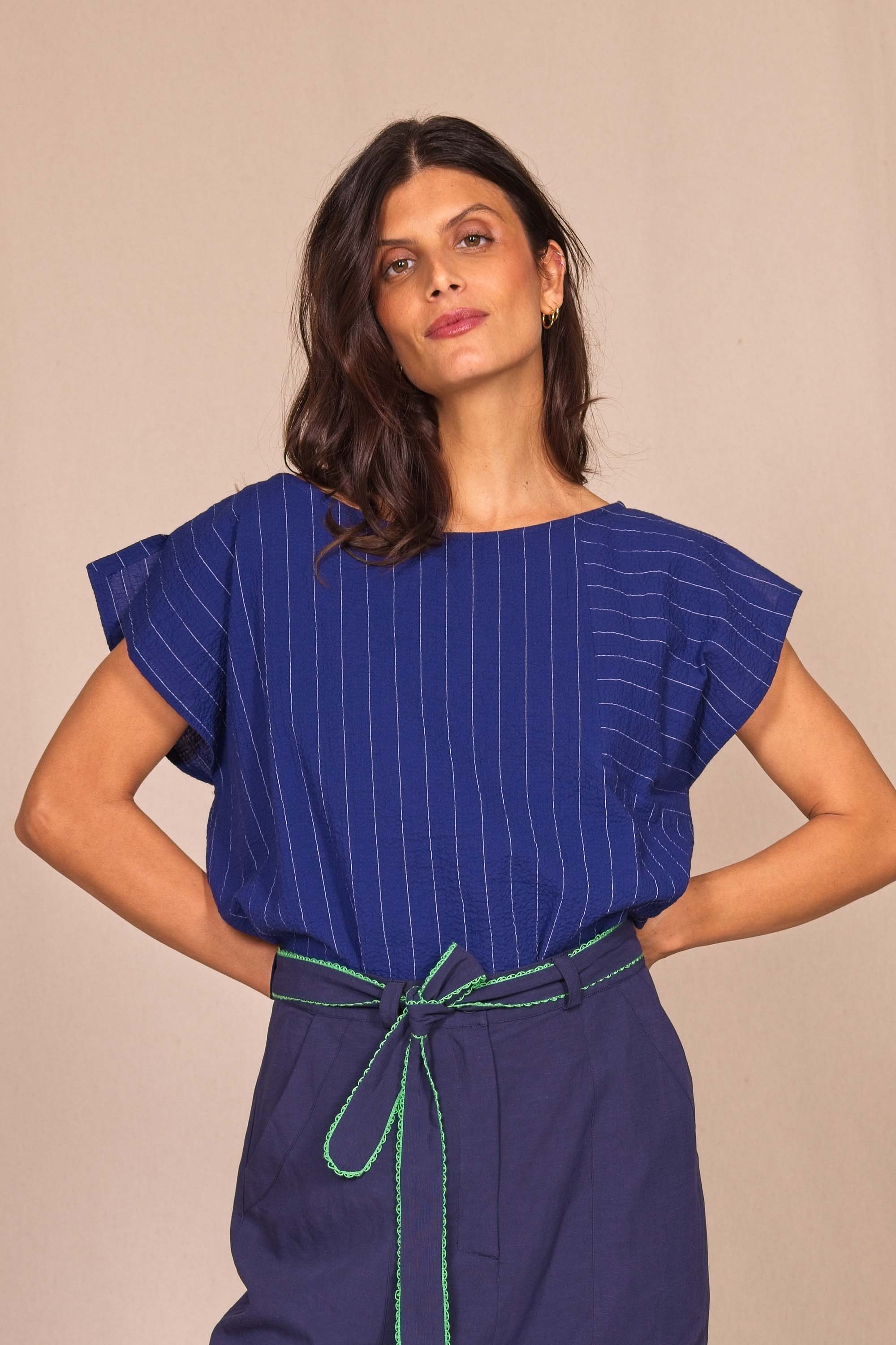 Top bleu manches courtes au volume carré et graphique. Petite fente sur les manches.