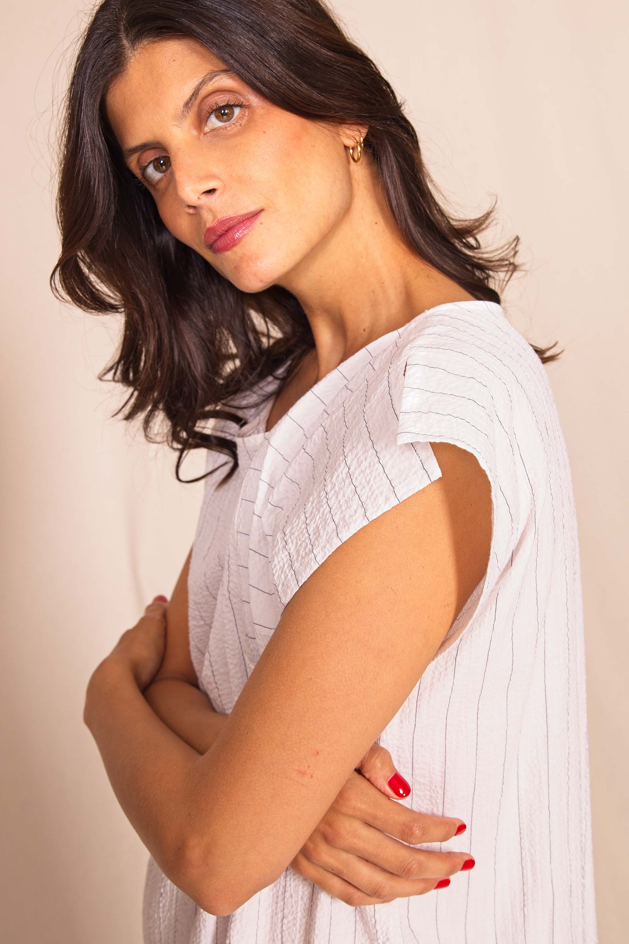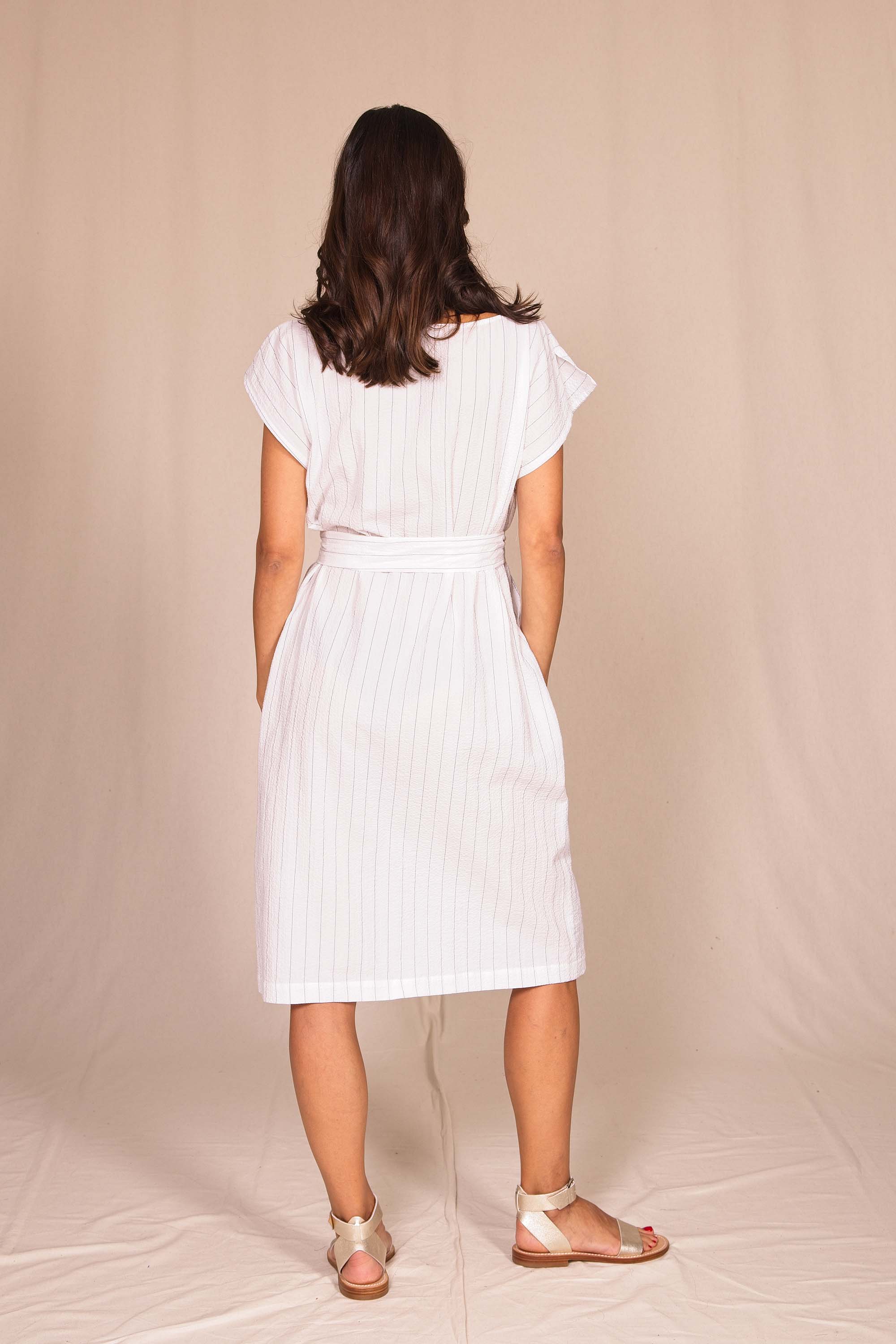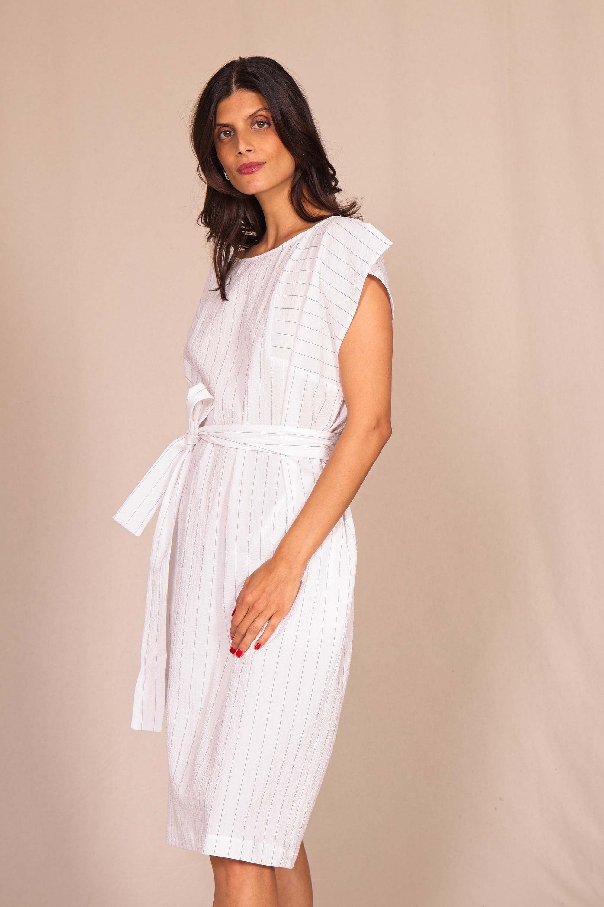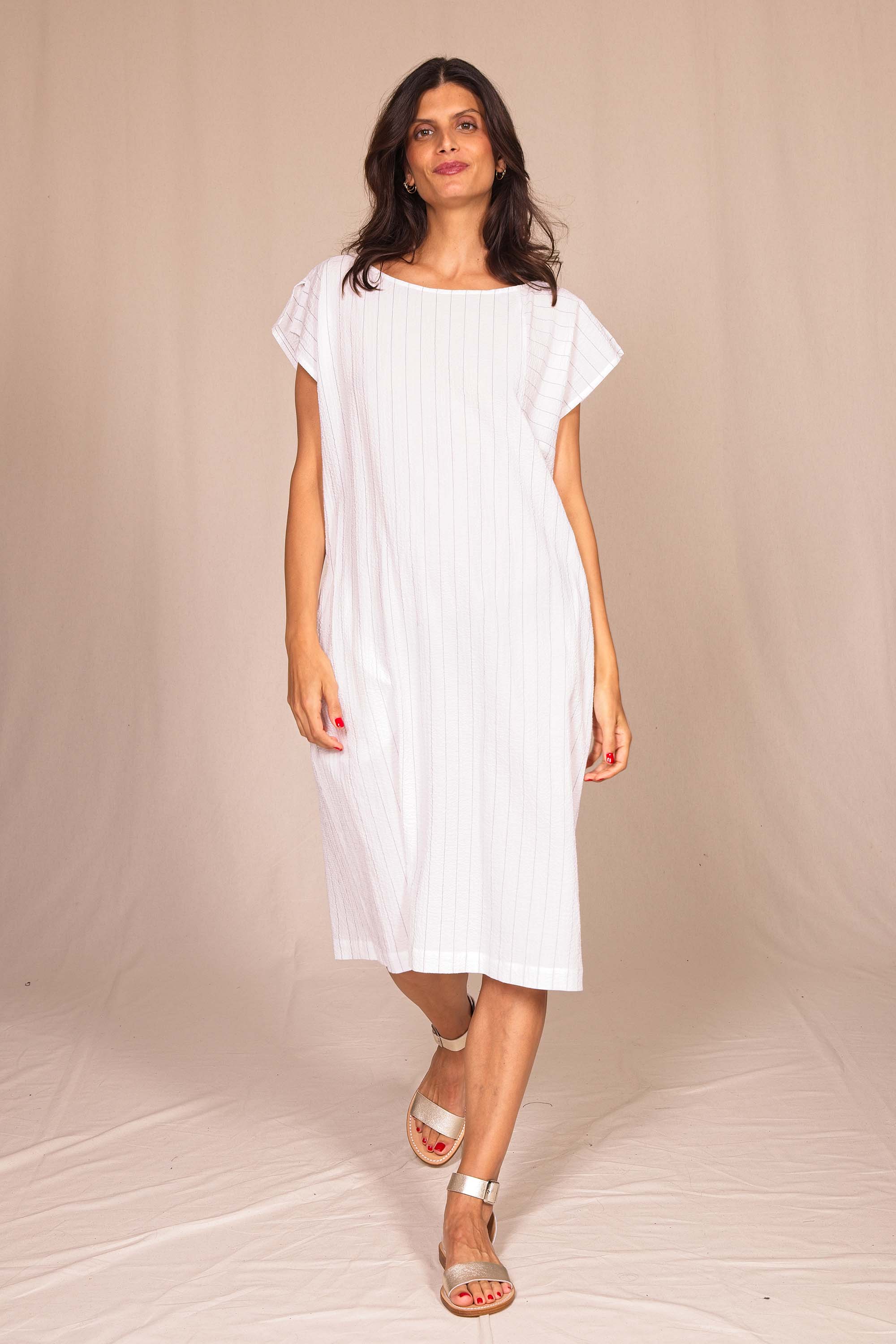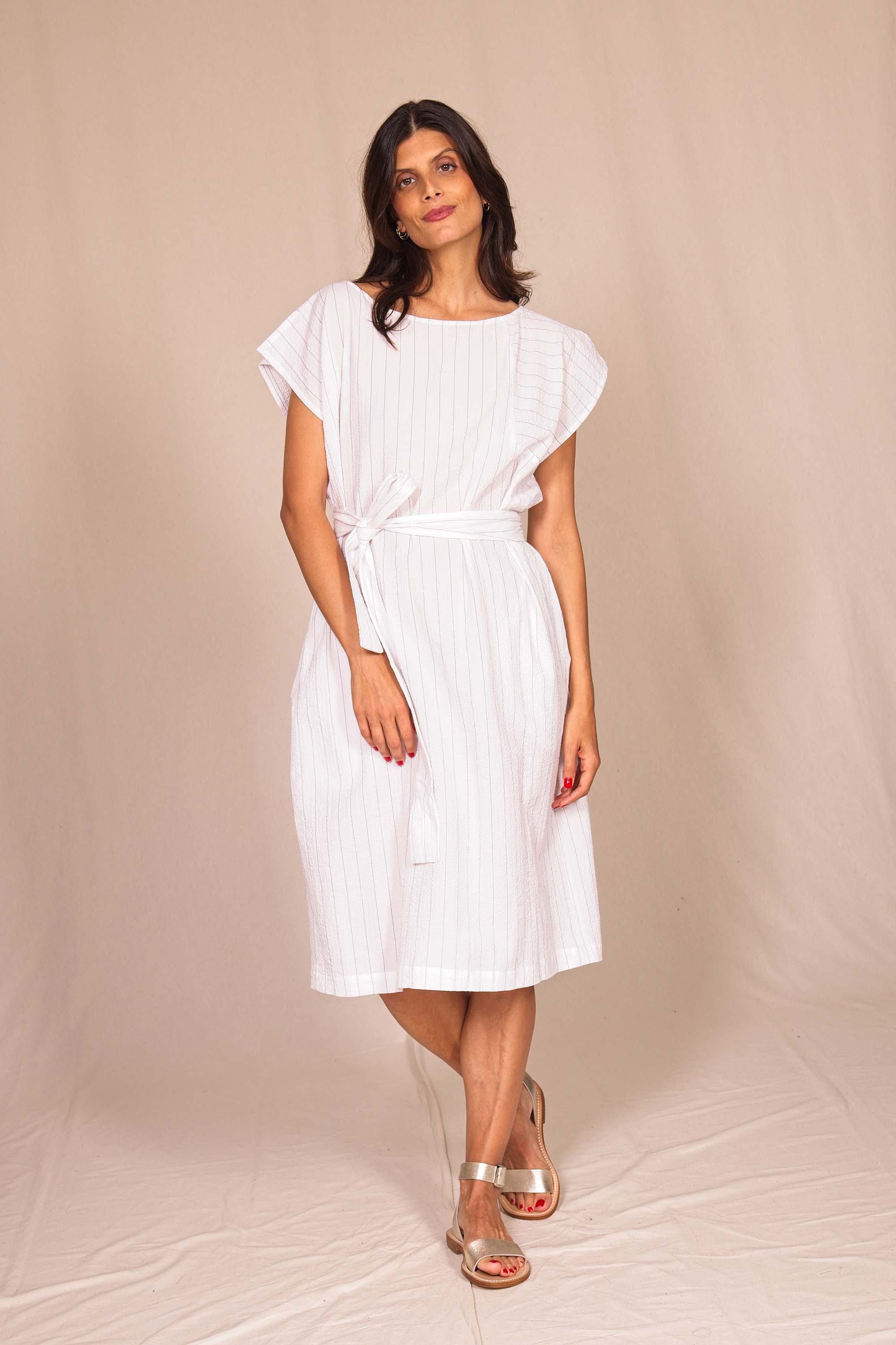 Jolie robe estivale qui se distingue par sa coupe graphique. Légère et très confortable, portez-la avec ou sans ceinture et des sandales pour un look très féminin. Colori blanc.