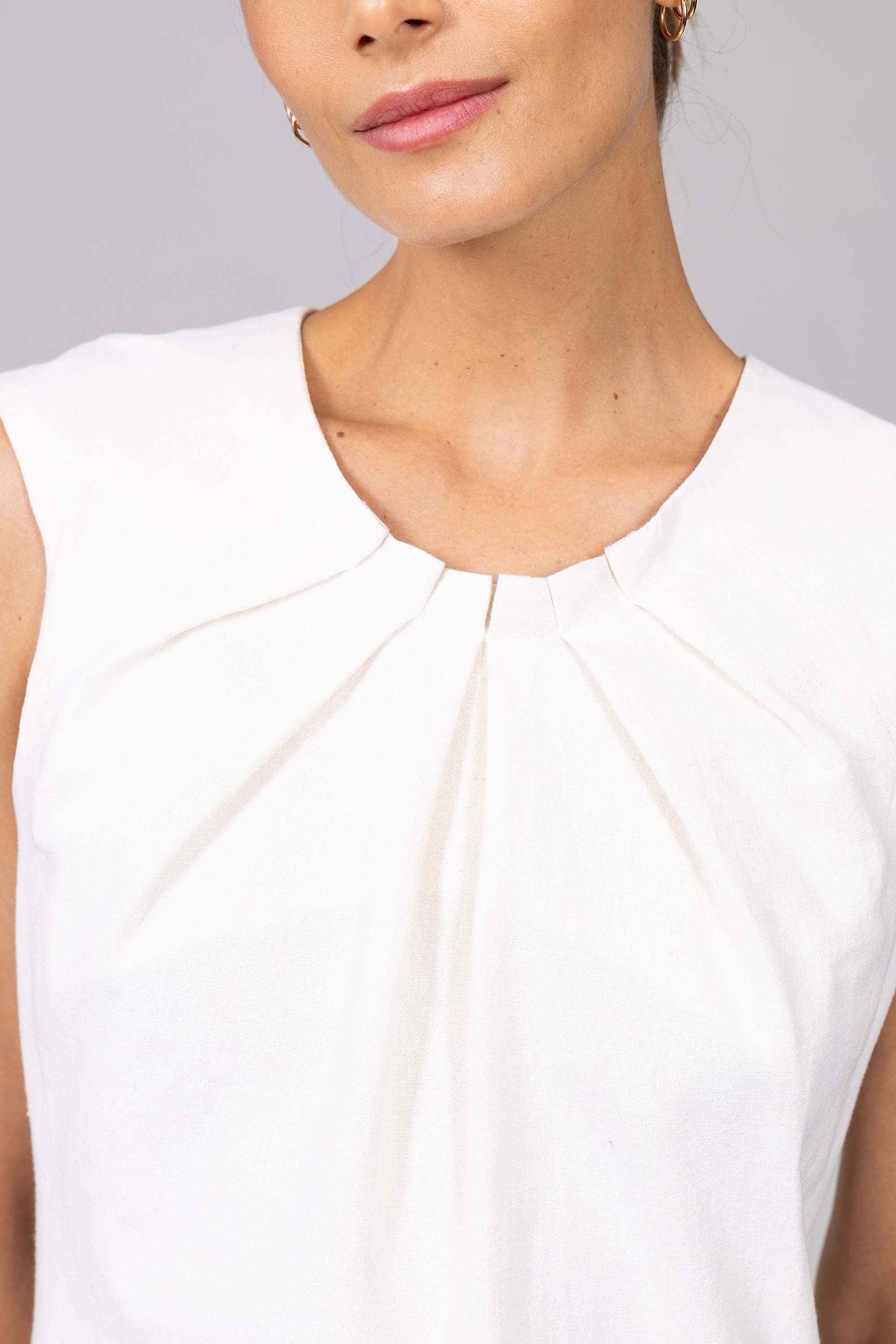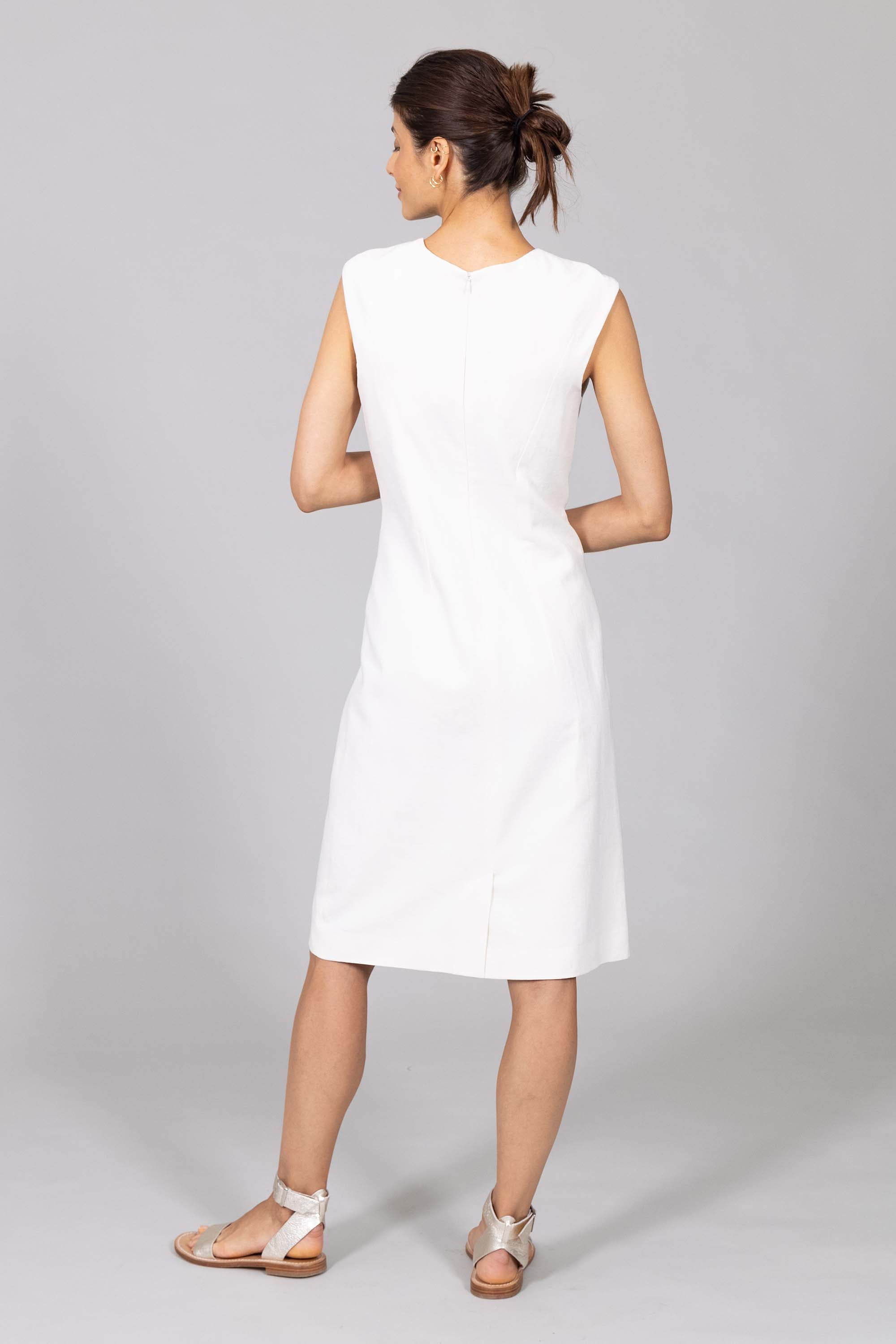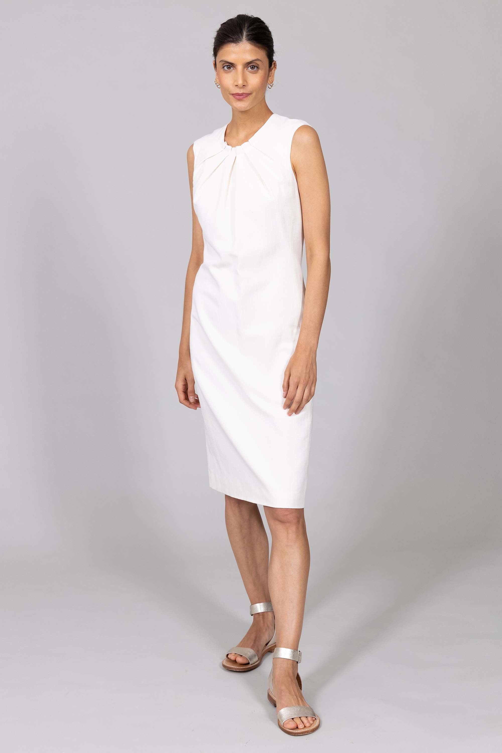 Robe droite sans manches, cintrée à la taille.