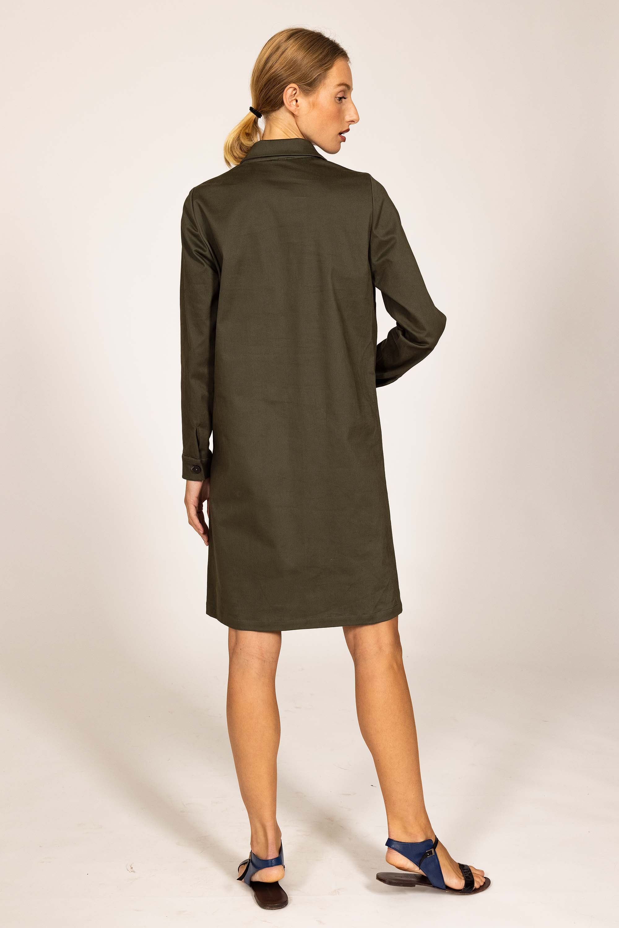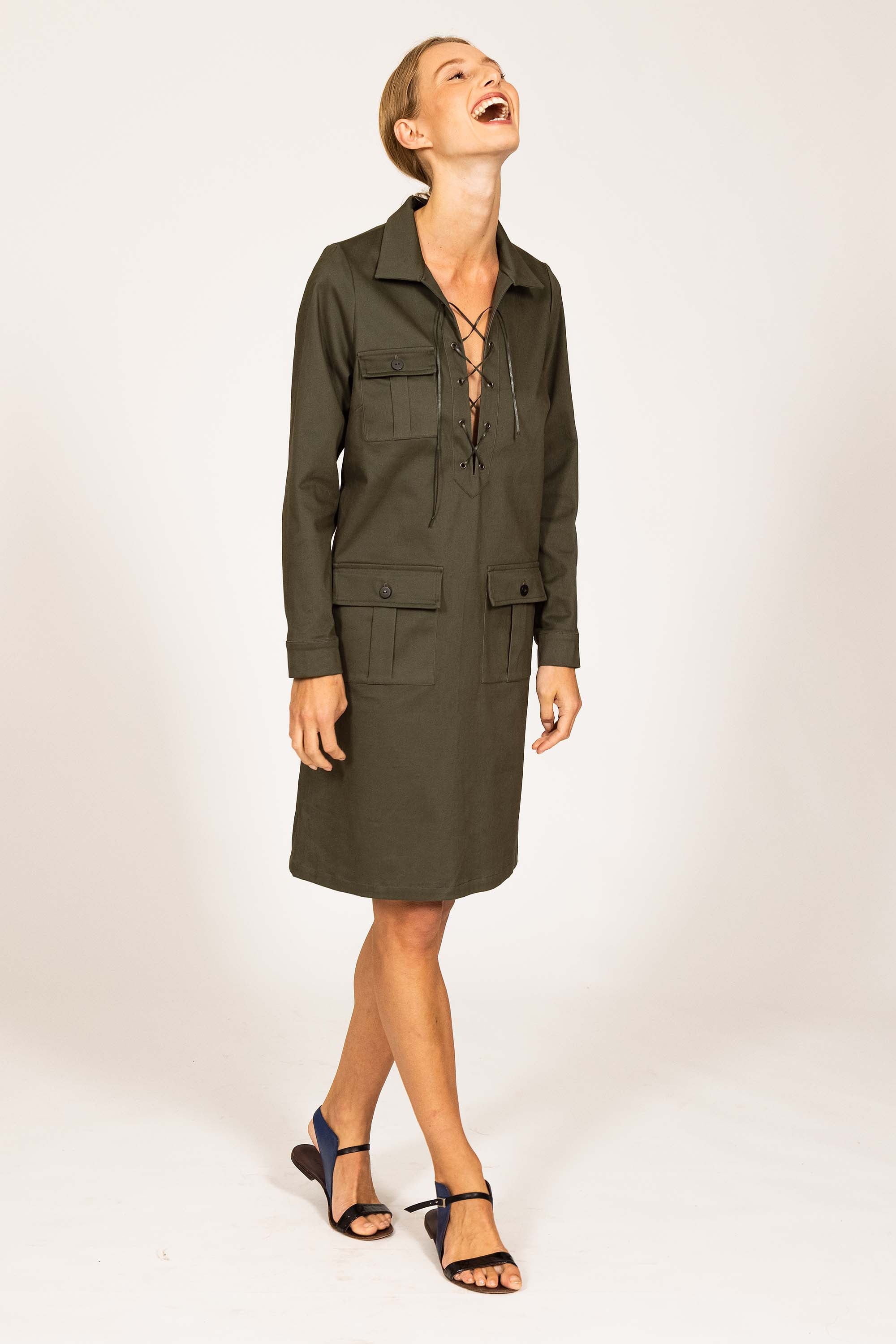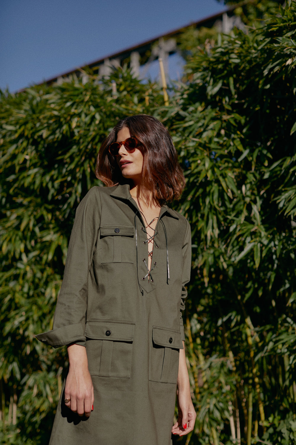 Robe saharienne, hommage au grand Yves Saint Laurent. Portée soit directement sur la peu avec le décolleté lacé, ou sur un t shirt léger afin d’être plus couverte.