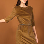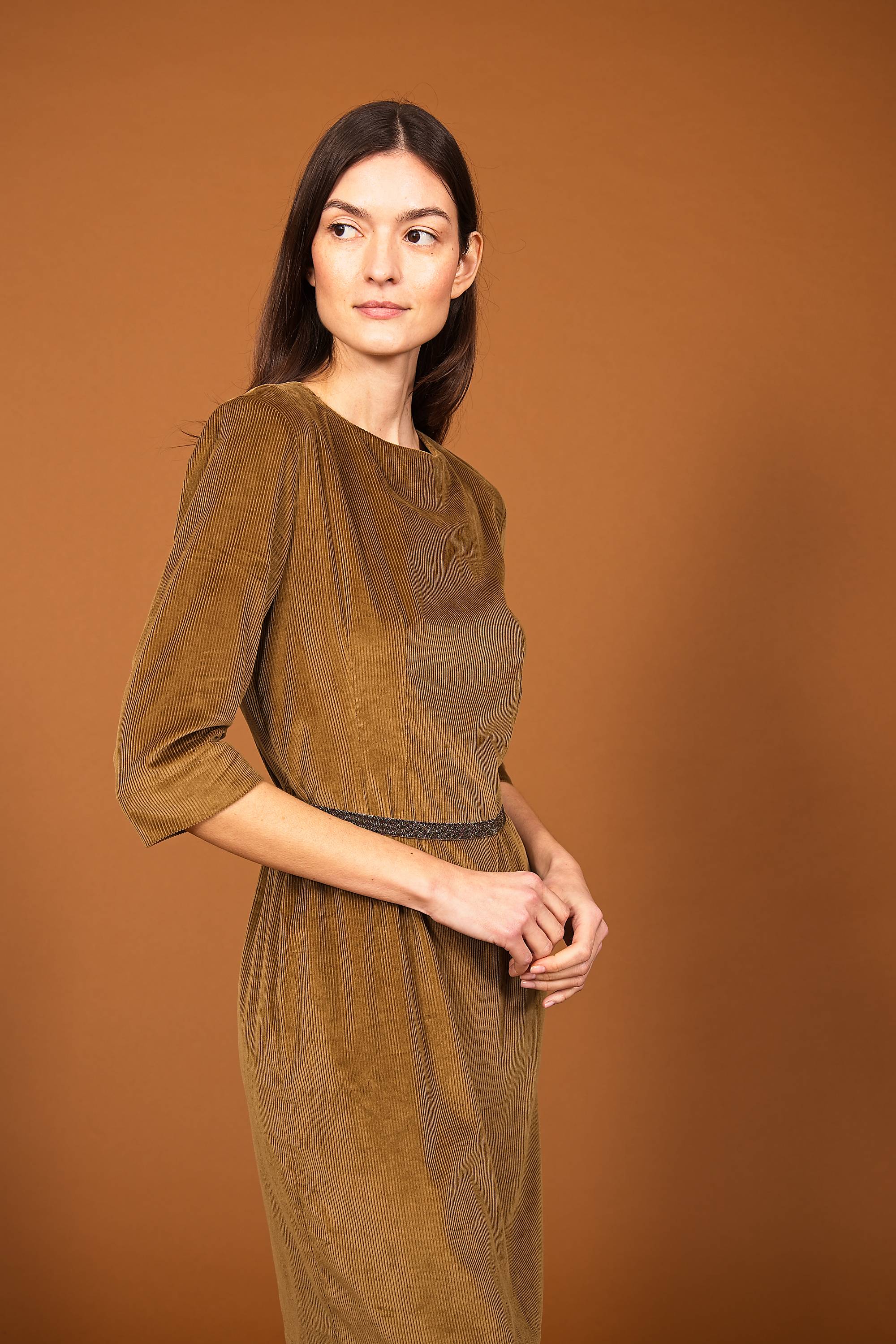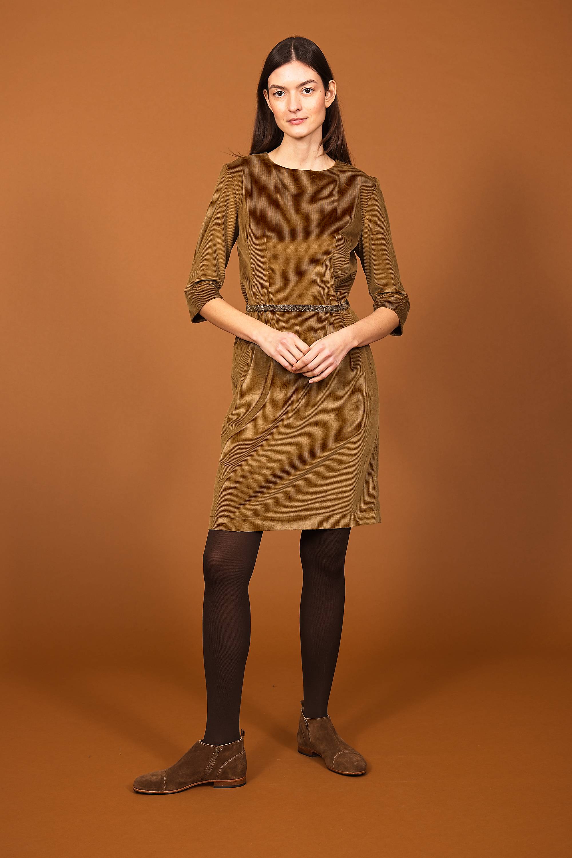 Taille soulignée par des pinces à la taille, encolure légèrement bateau, manches ¾ coudées par des pinces au coude, ceinturée par un joli galon élastiqué.