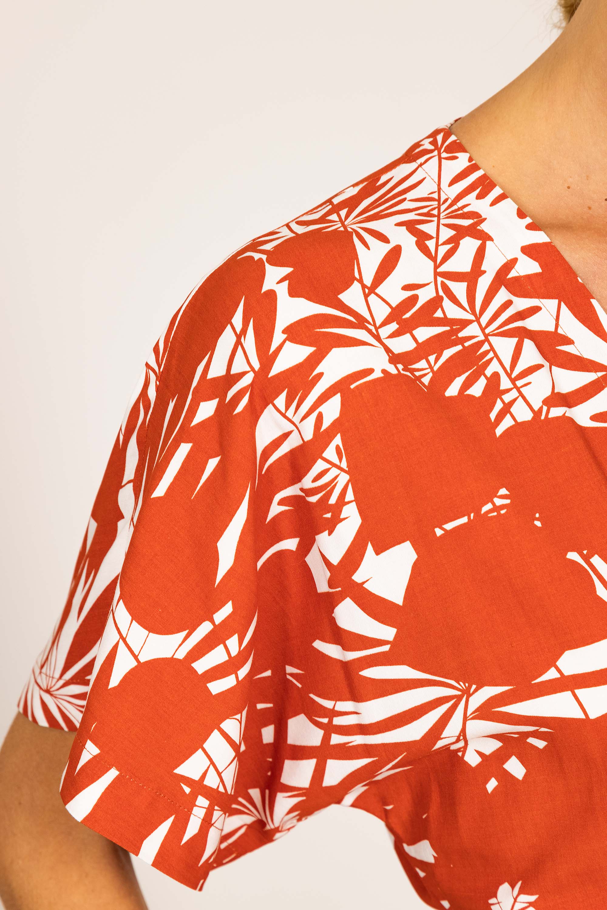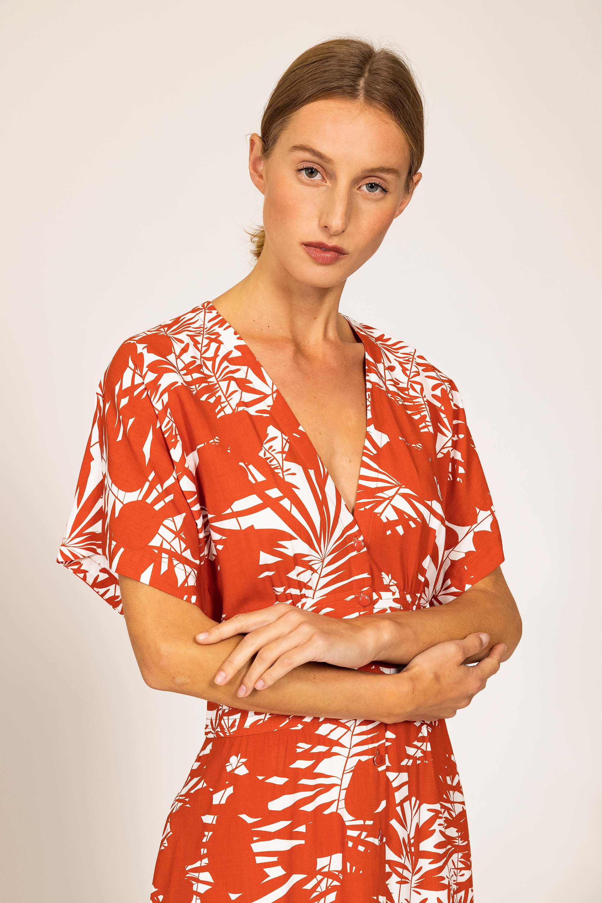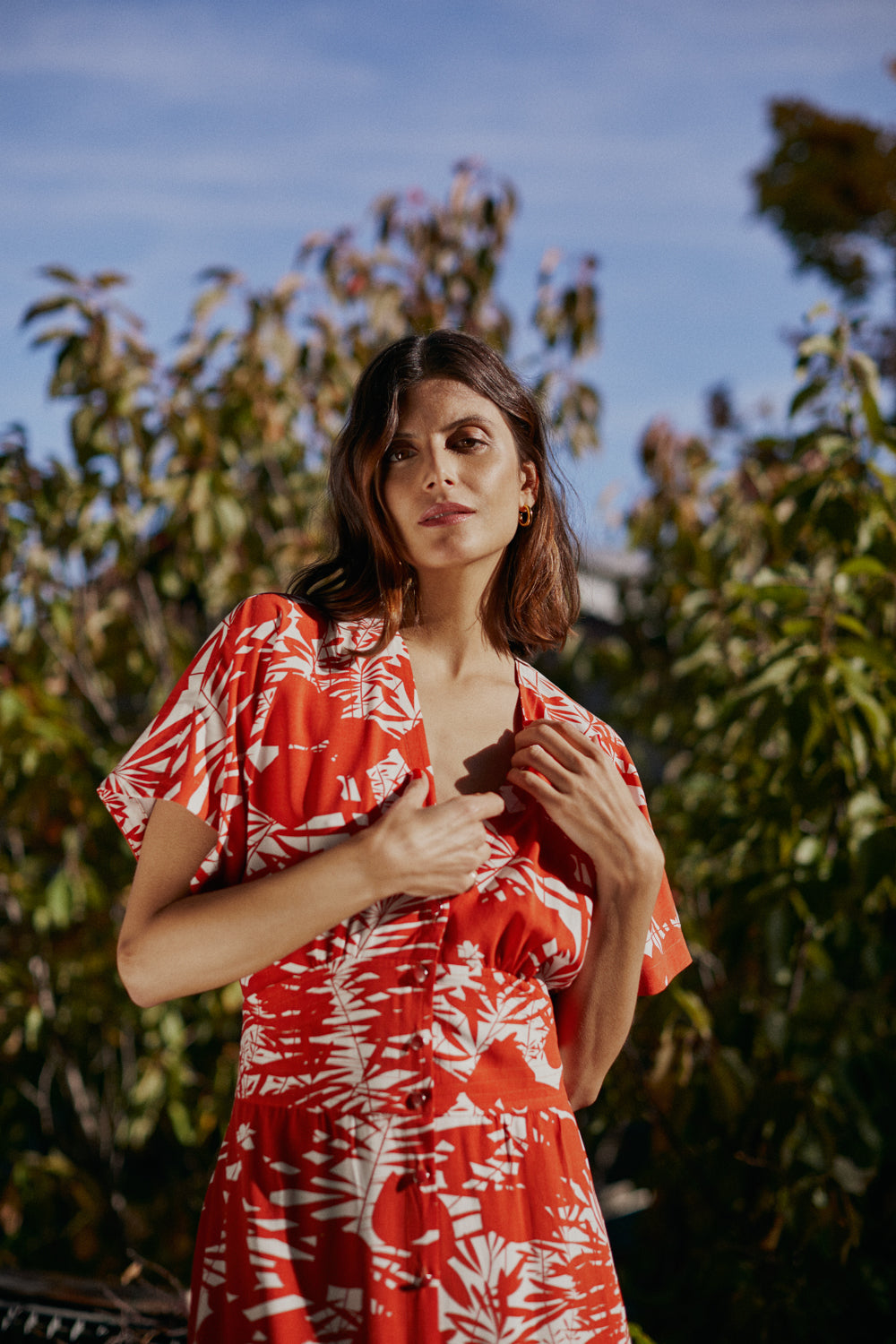 Coupée dans une viscose tissée dans les Vosges et imprimée à Avignon ; cet imprimé" feuillage bicolore" exclusif a été dessiné par Laure Girardin pour la collection printemps été 22.