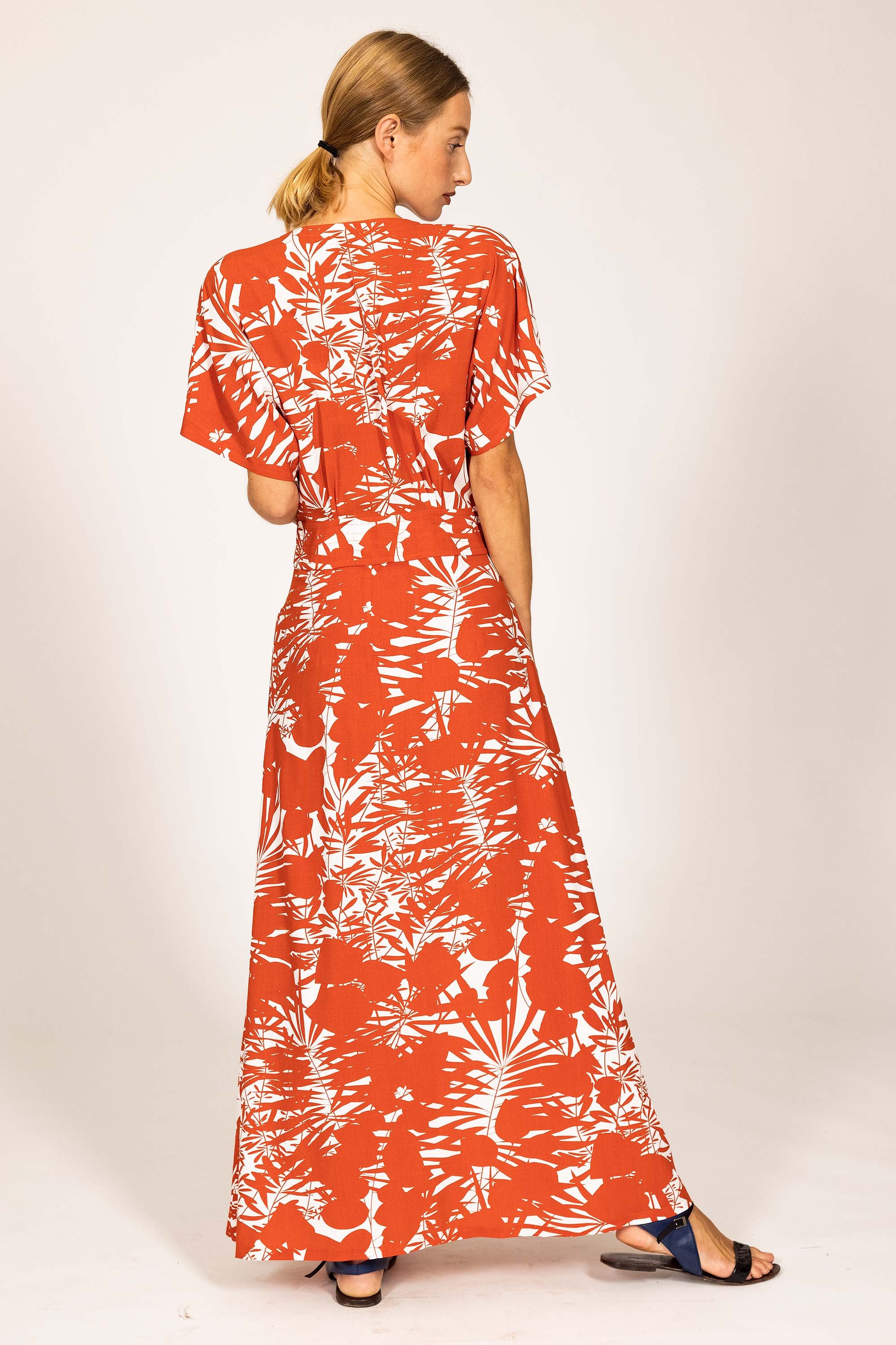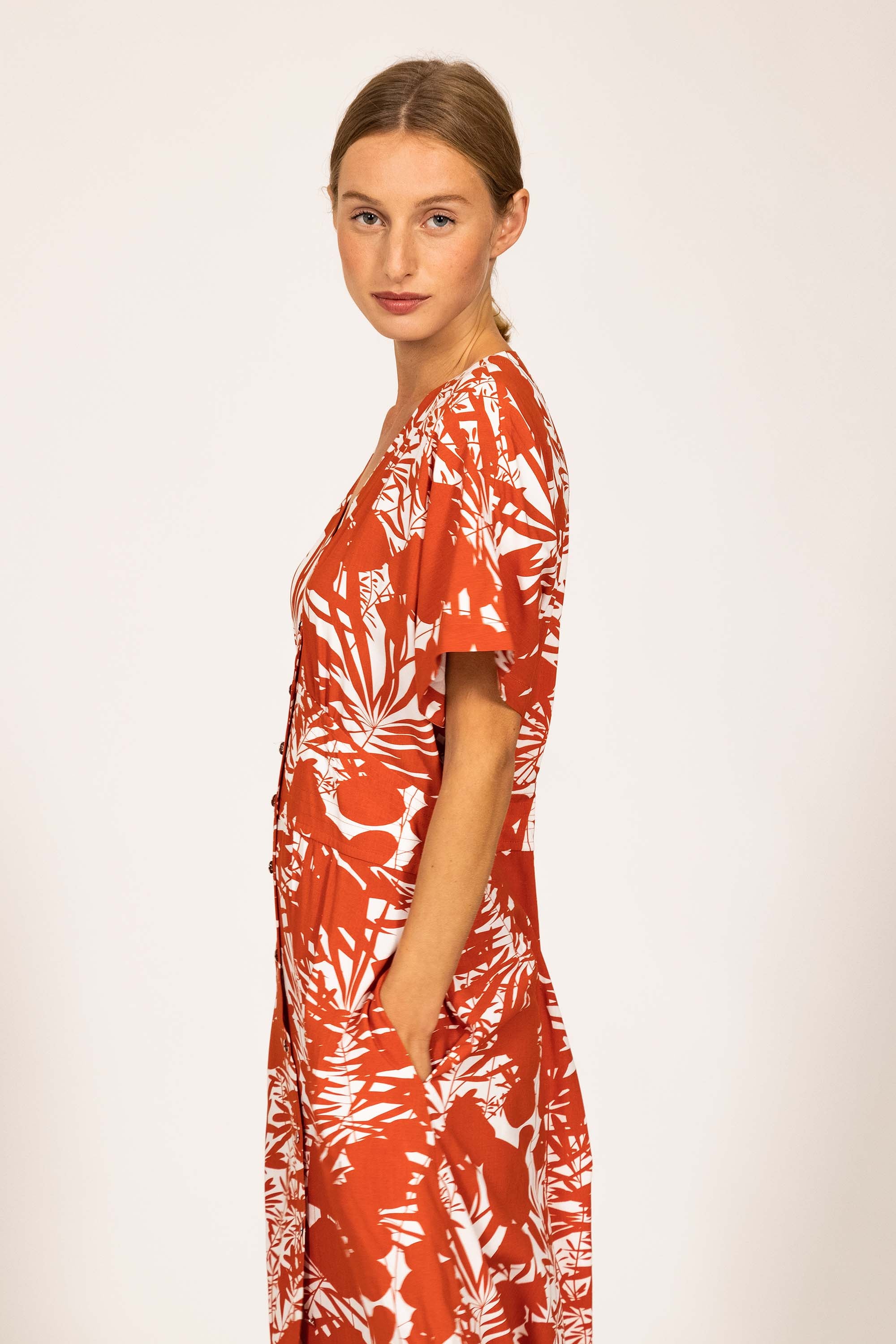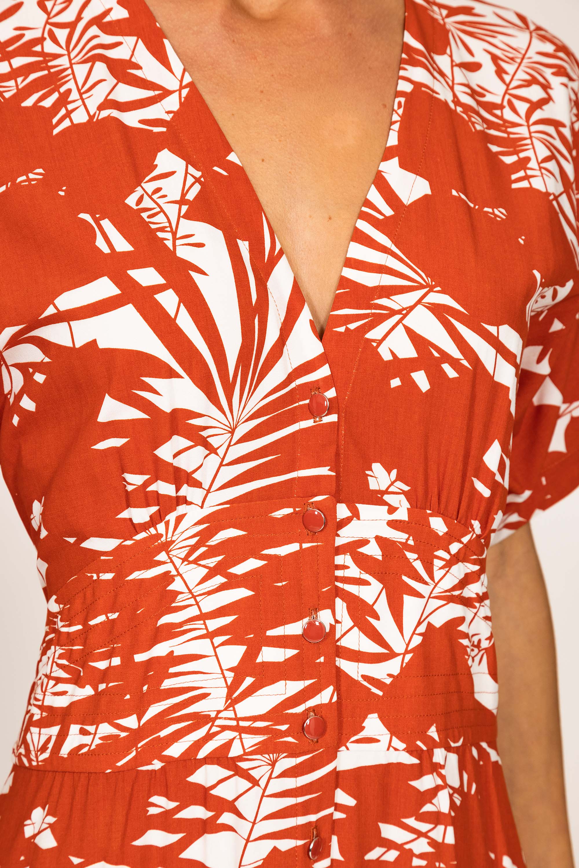 Coupée dans une viscose tissée dans les Vosges et imprimée à Avignon ; cet imprimé" feuillage bicolore" exclusif a été dessiné par Laure Girardin pour la collection printemps été 22.
