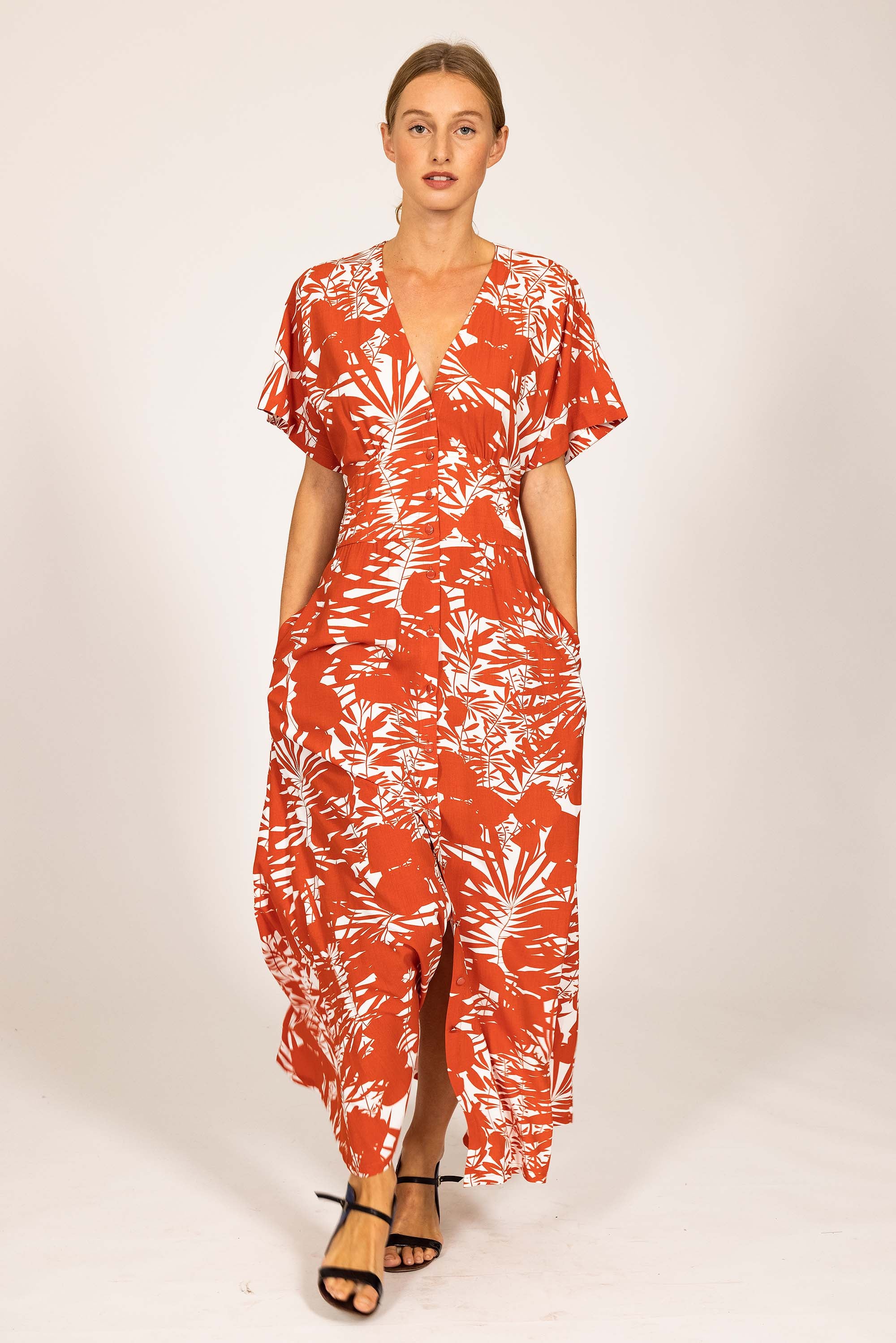 Robe longue boutonnée devant et fermée par des petits boutons ton sur ton en émail. Col v petites manches papillon et taille marquée par un empiècement surpiqué.