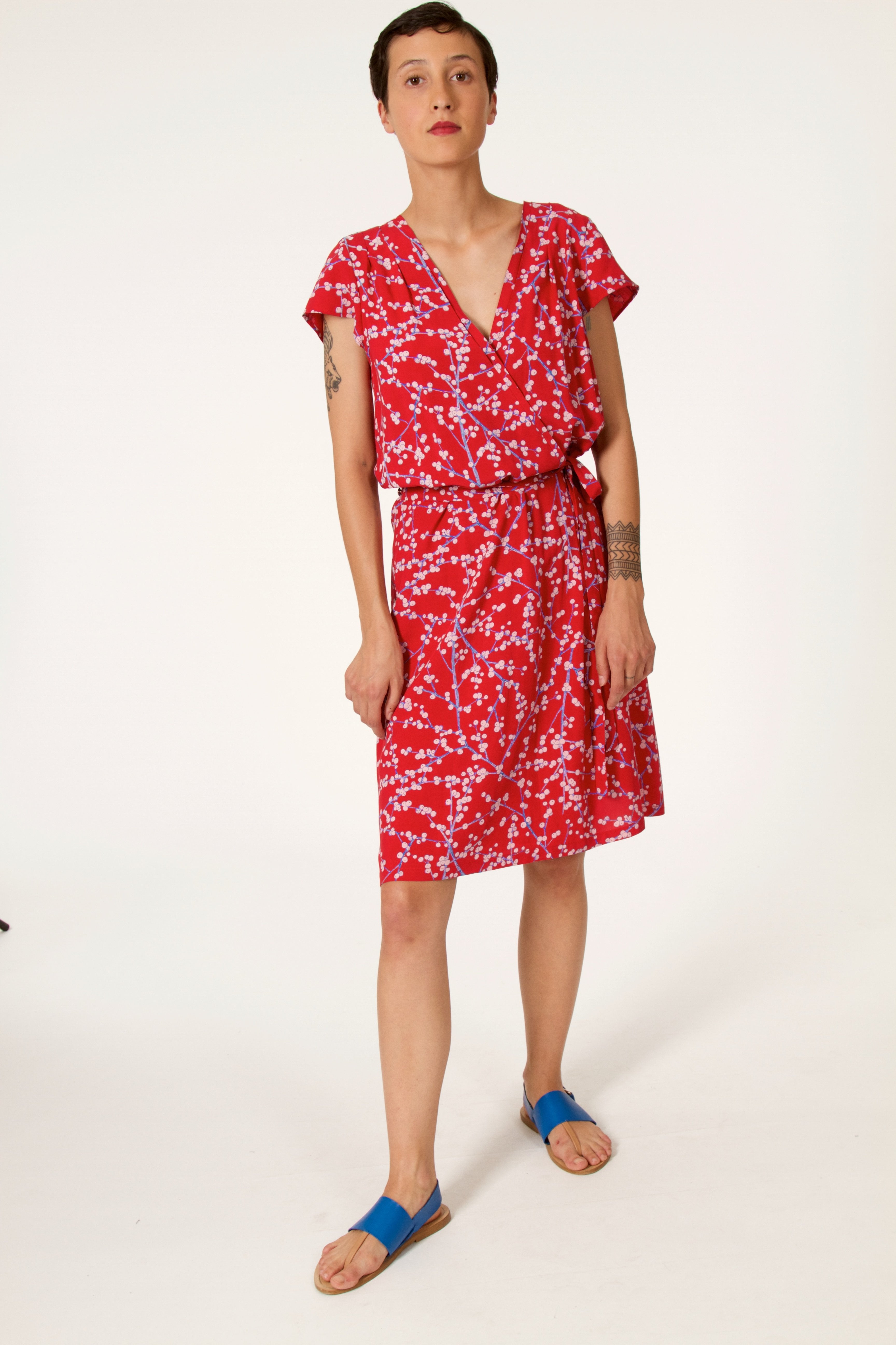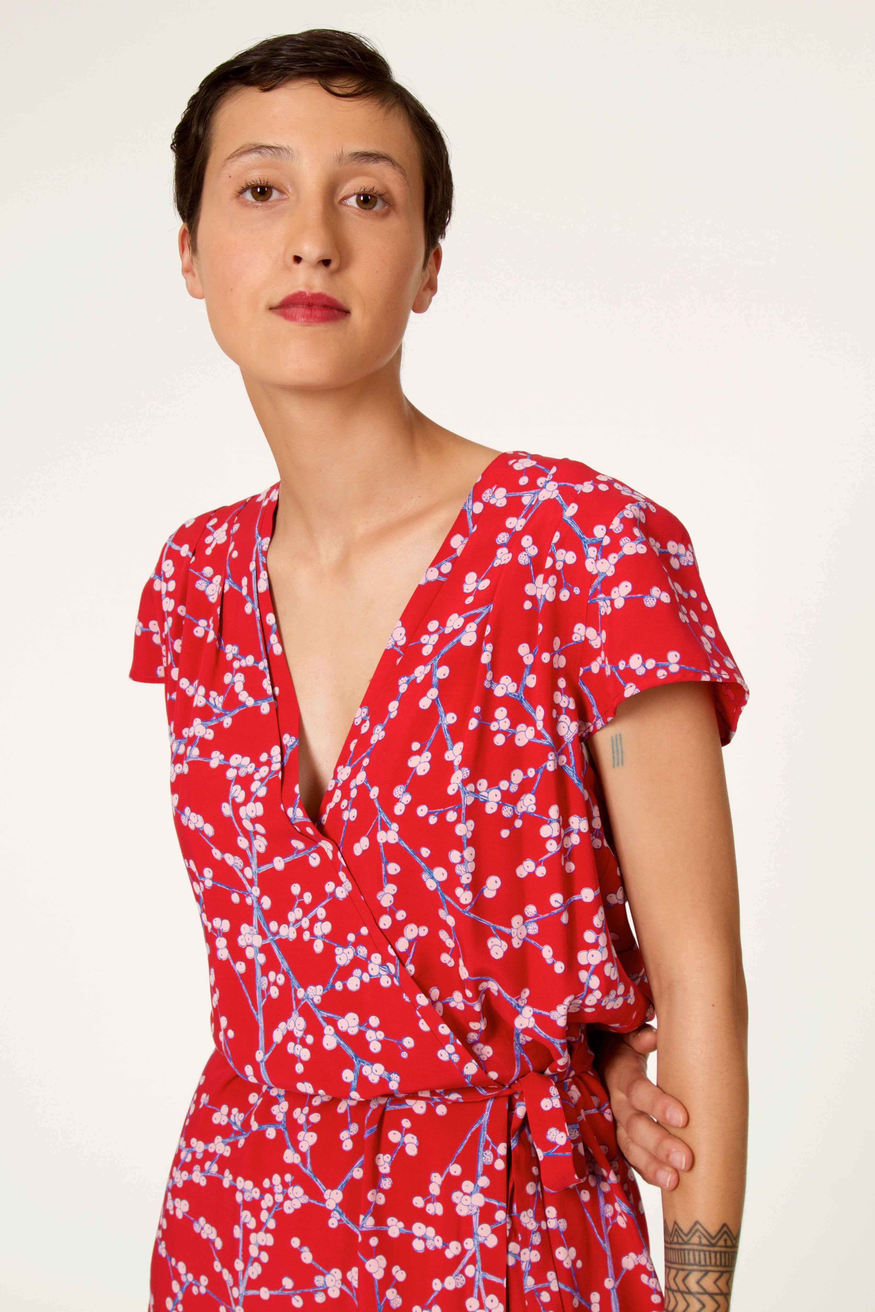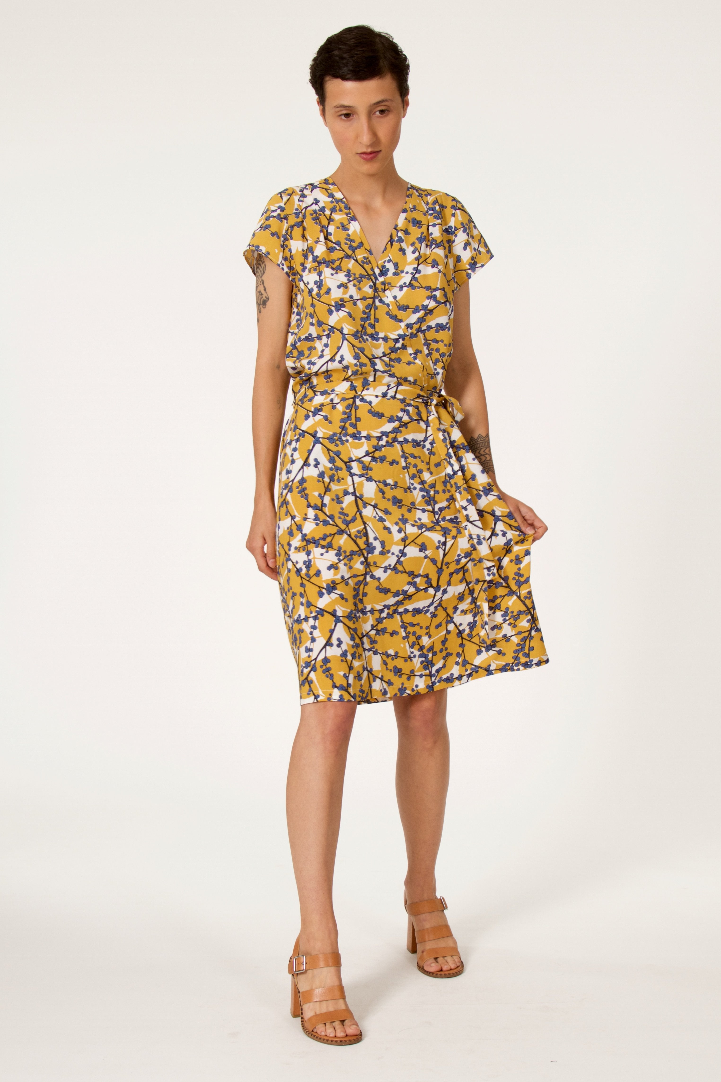 Robe « fausse-portefeuille » longueur genoux à manches courtes en viscose imprimé exclusif. Col V.