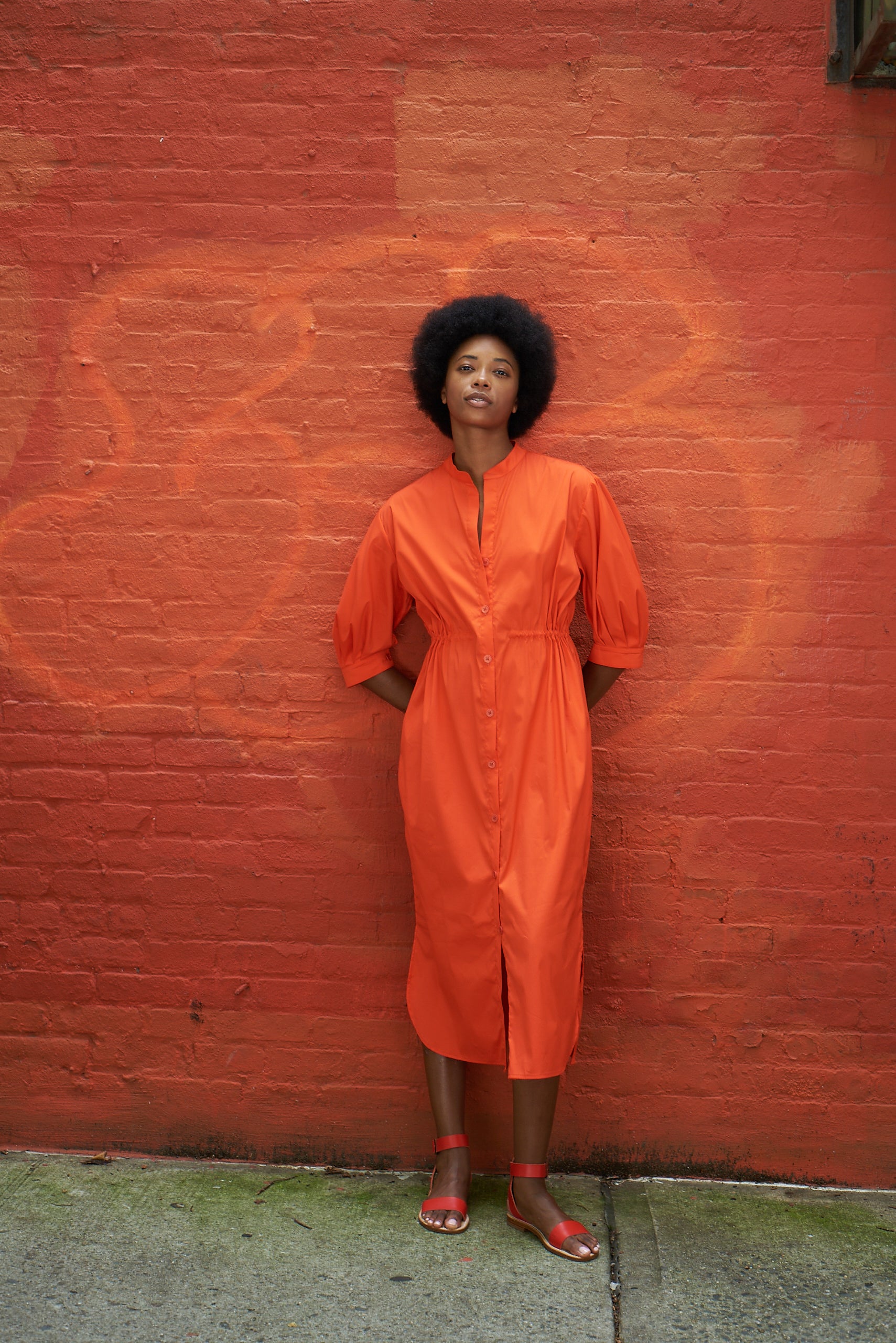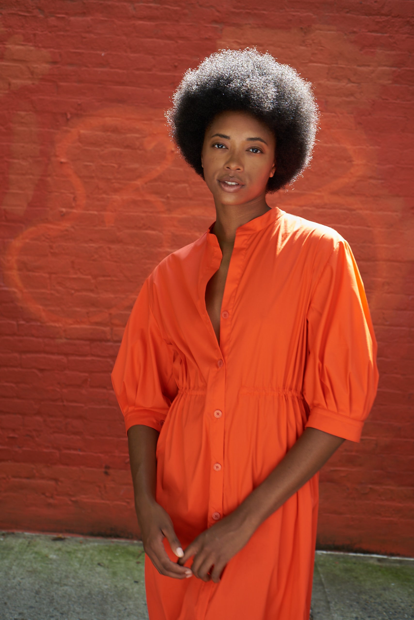 Robe longue à fermeture boutons sur le devant et manches bouffantes 3/4.