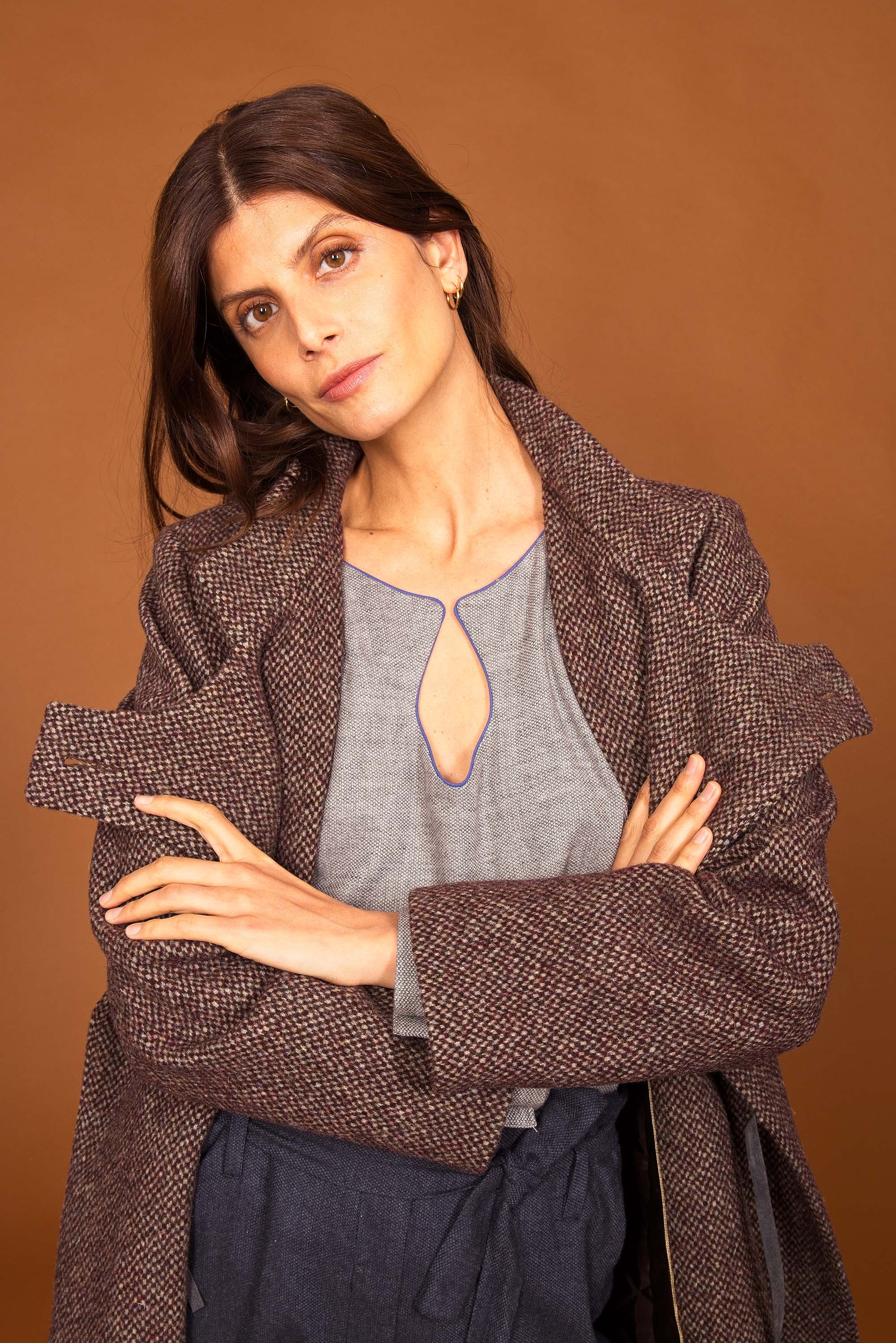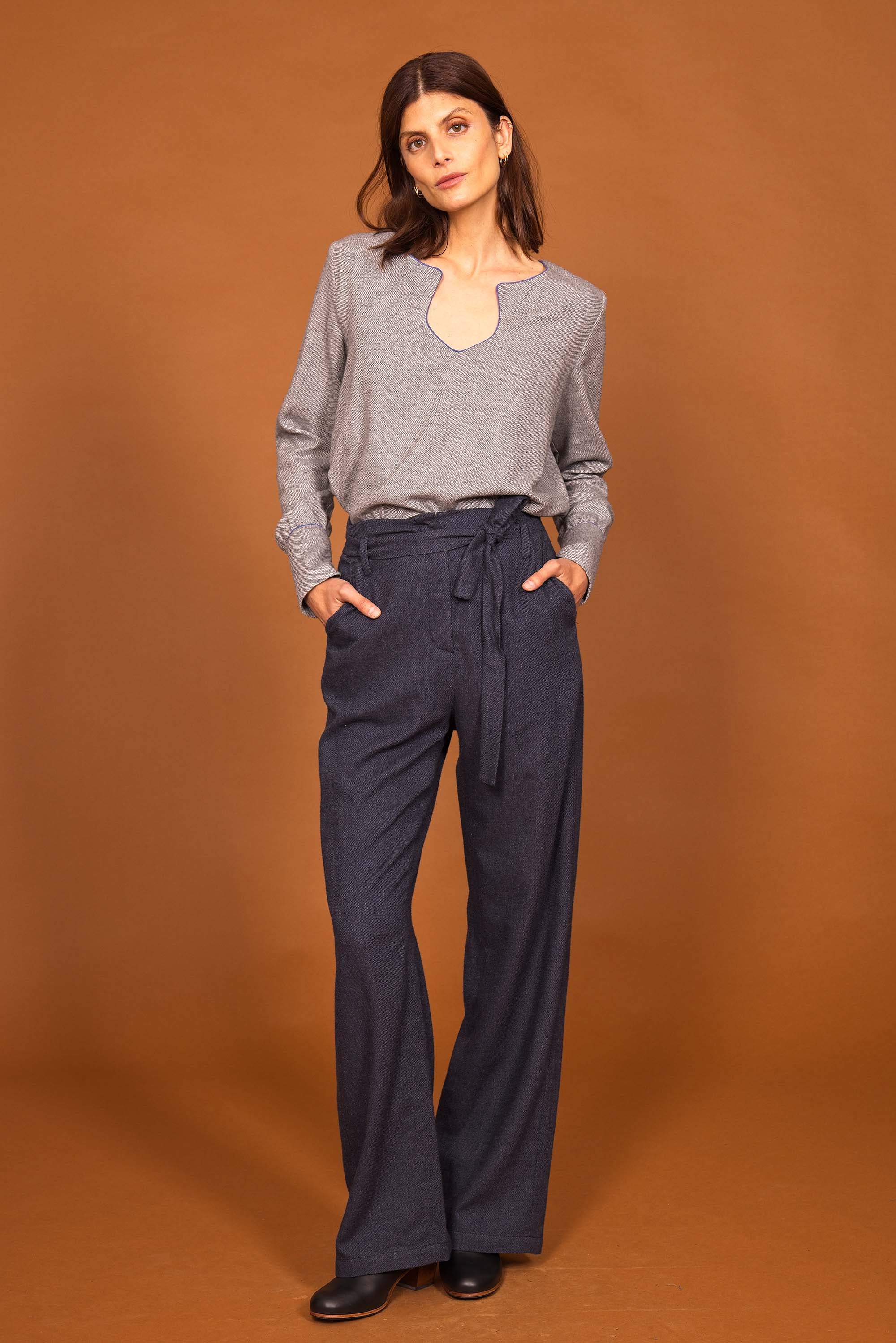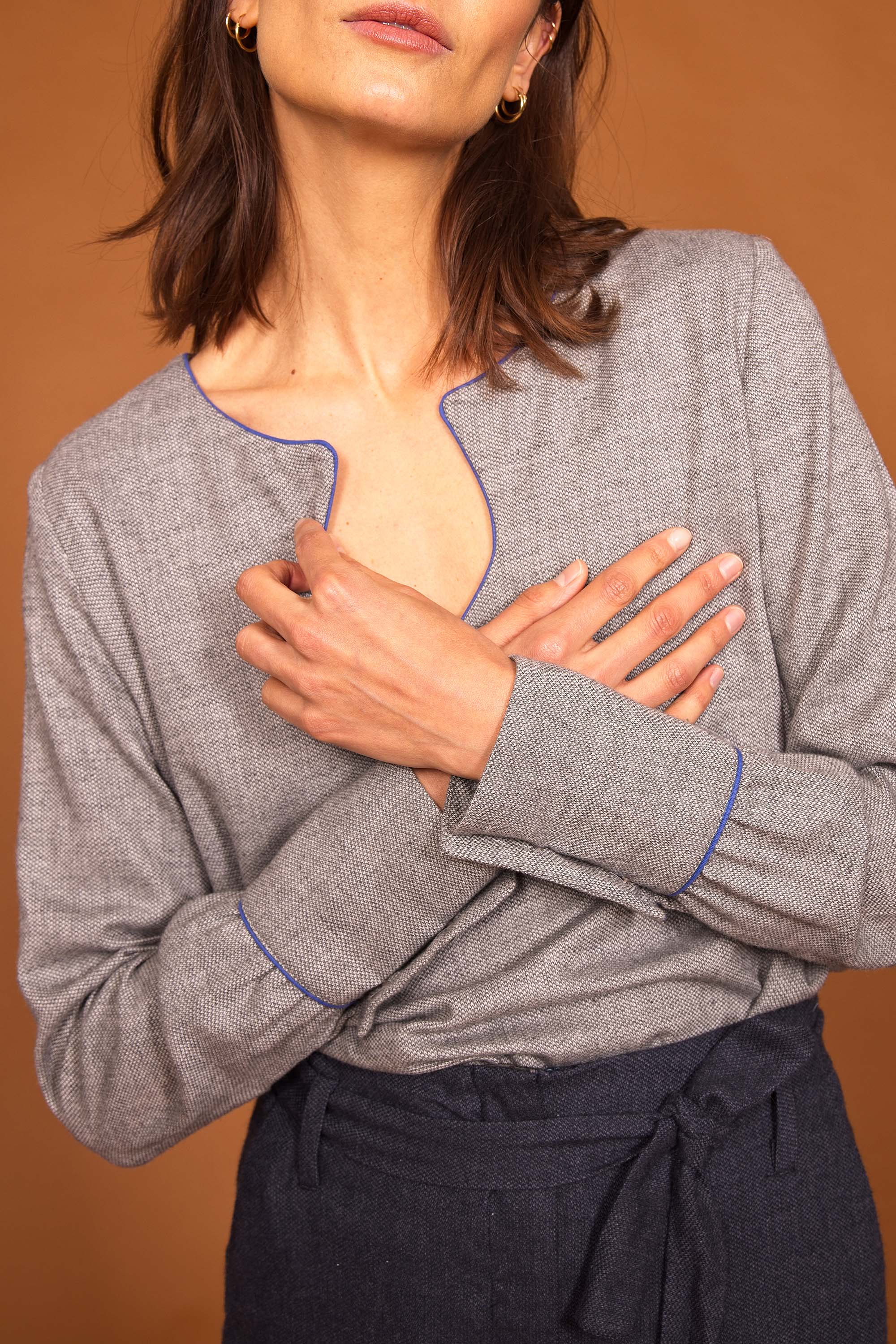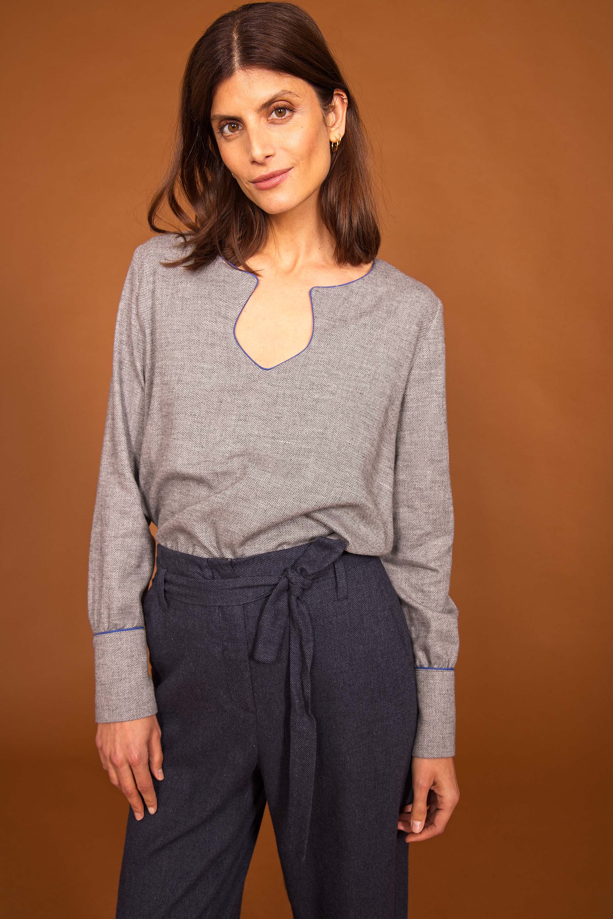 Le top MERTZ incarne l'élégance minimaliste. Col goutte délicat et poignets surlignés d'un passepoil bleu, coupe fluide et intemporelle. Confectionné dans une flanelle de coton, il offre une silhouette moderne et raffinée. Une pièce essentielle du vestiaire féminin, signée Anne Willi, pour une allure chic au quotidien.
