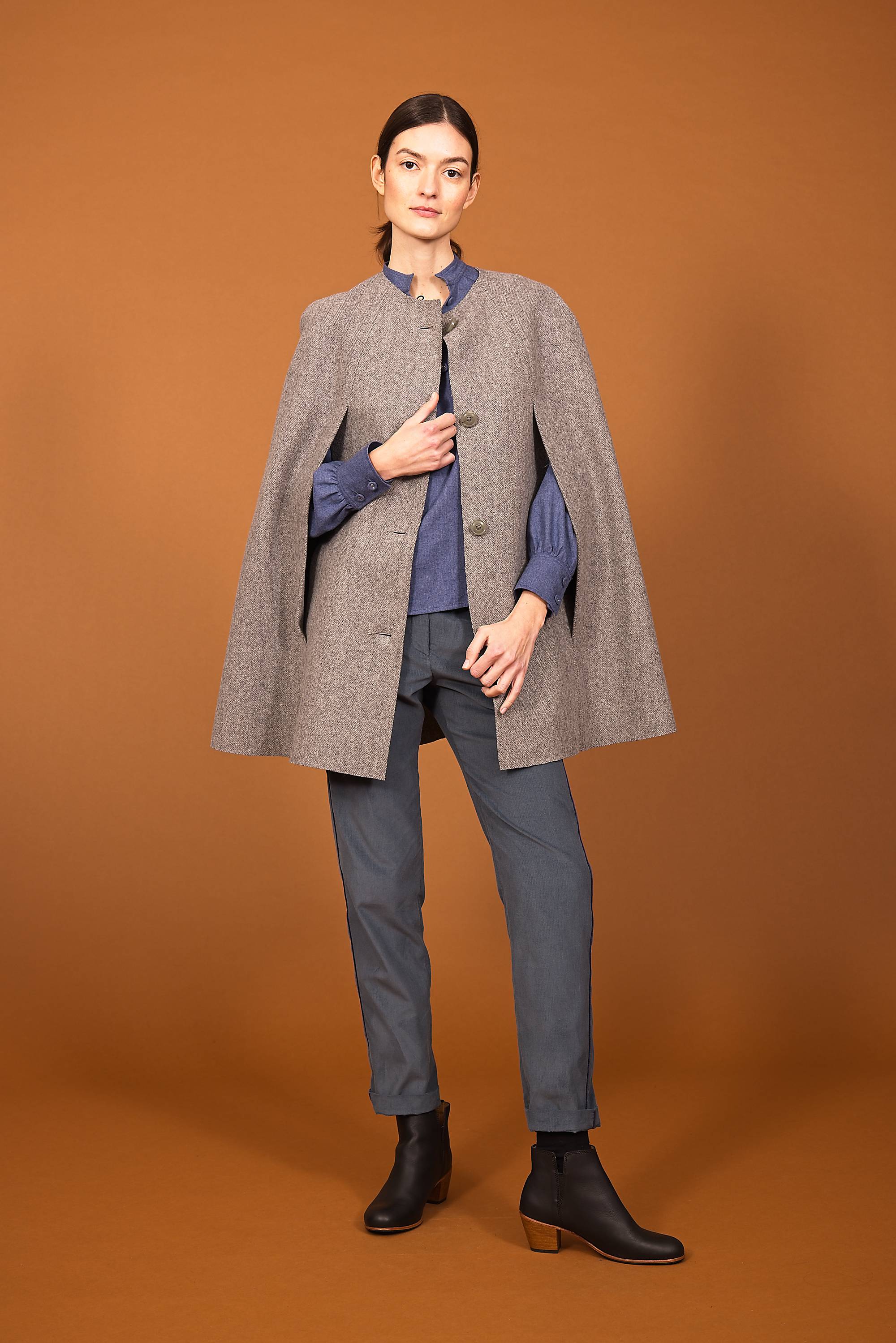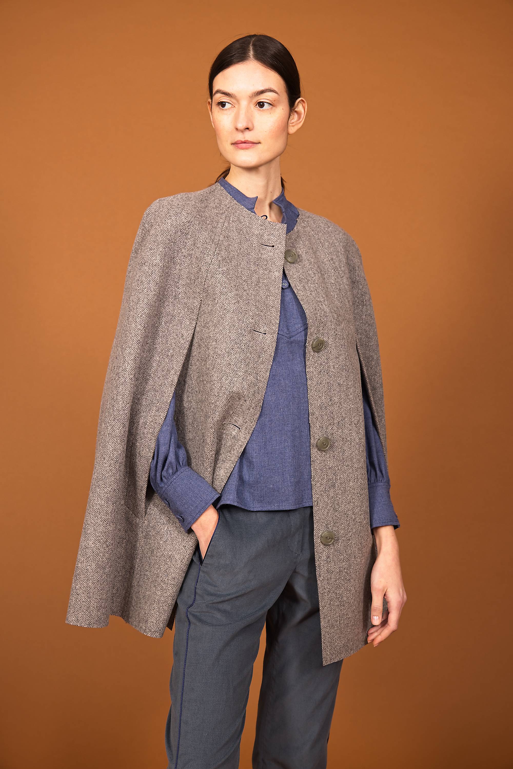 Grey cape with a round neck and button closure at the front. Made from vintage, eco-friendly natural wool, the ISAÏ cape is a must-have piece that will keep you warm this winter.