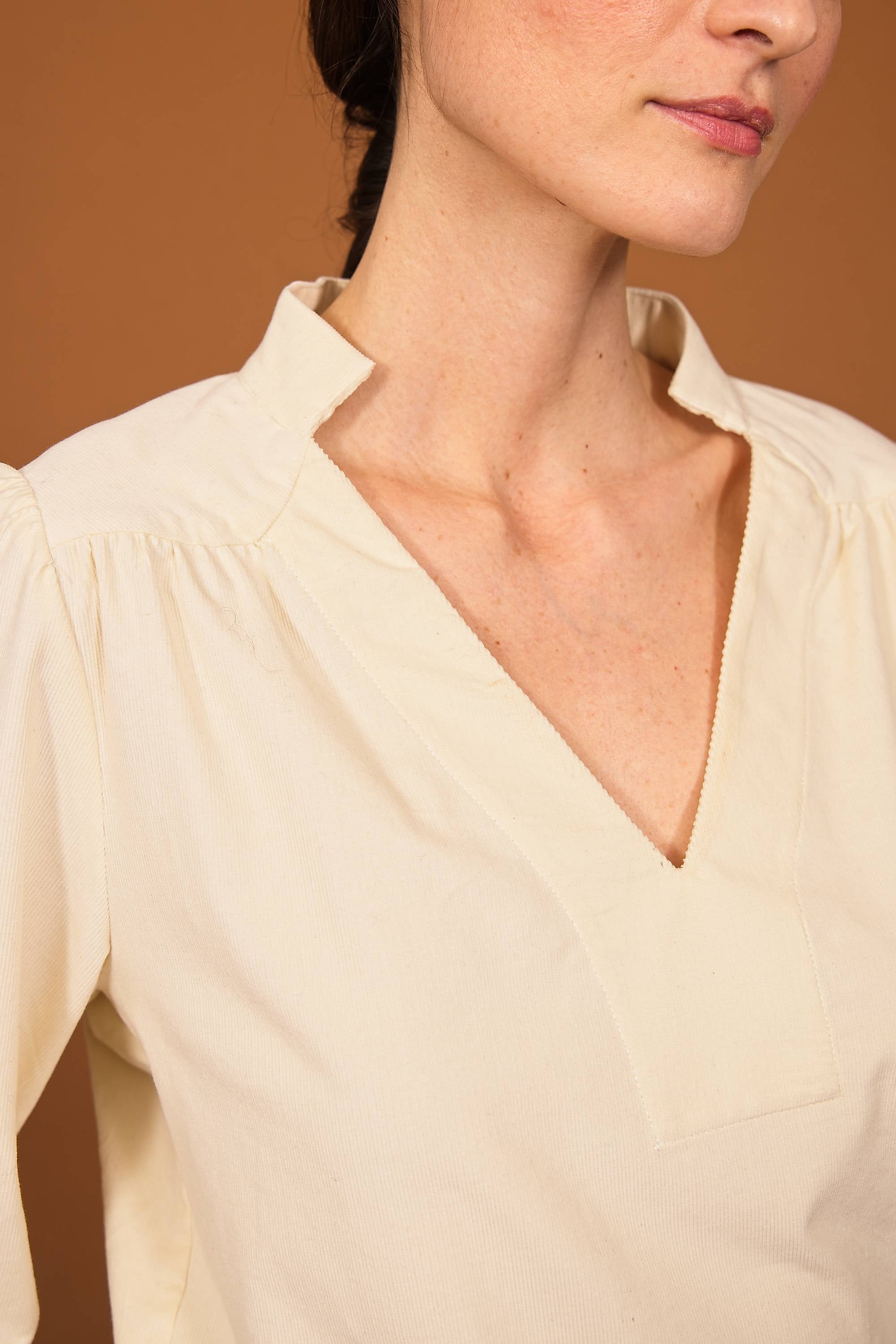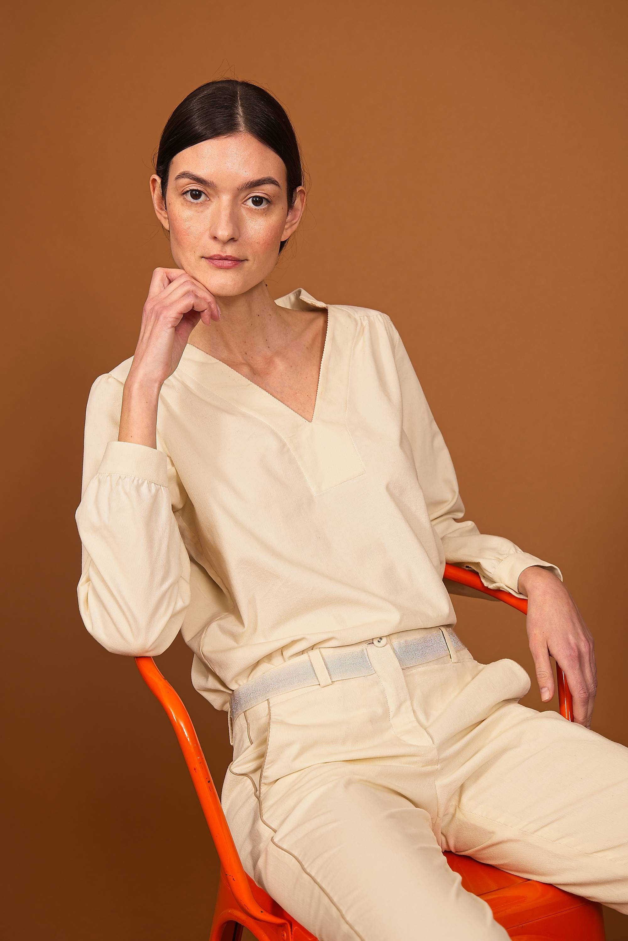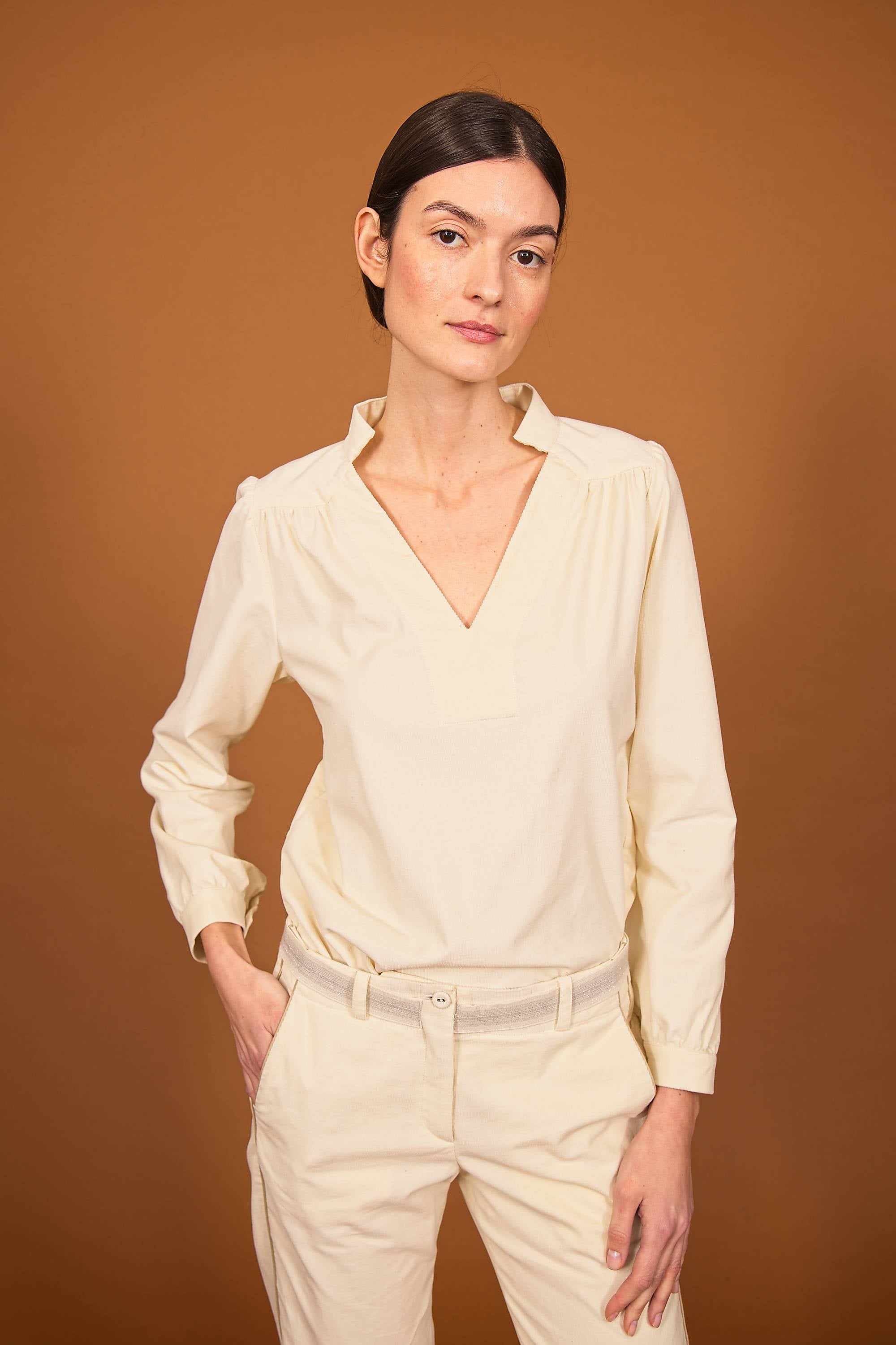 Finely ribbed velvet blouse with long sleeves, iconic from the Anne Willi house. V-neckline and small Tunisian collar, cuffs tightened with a button.