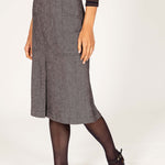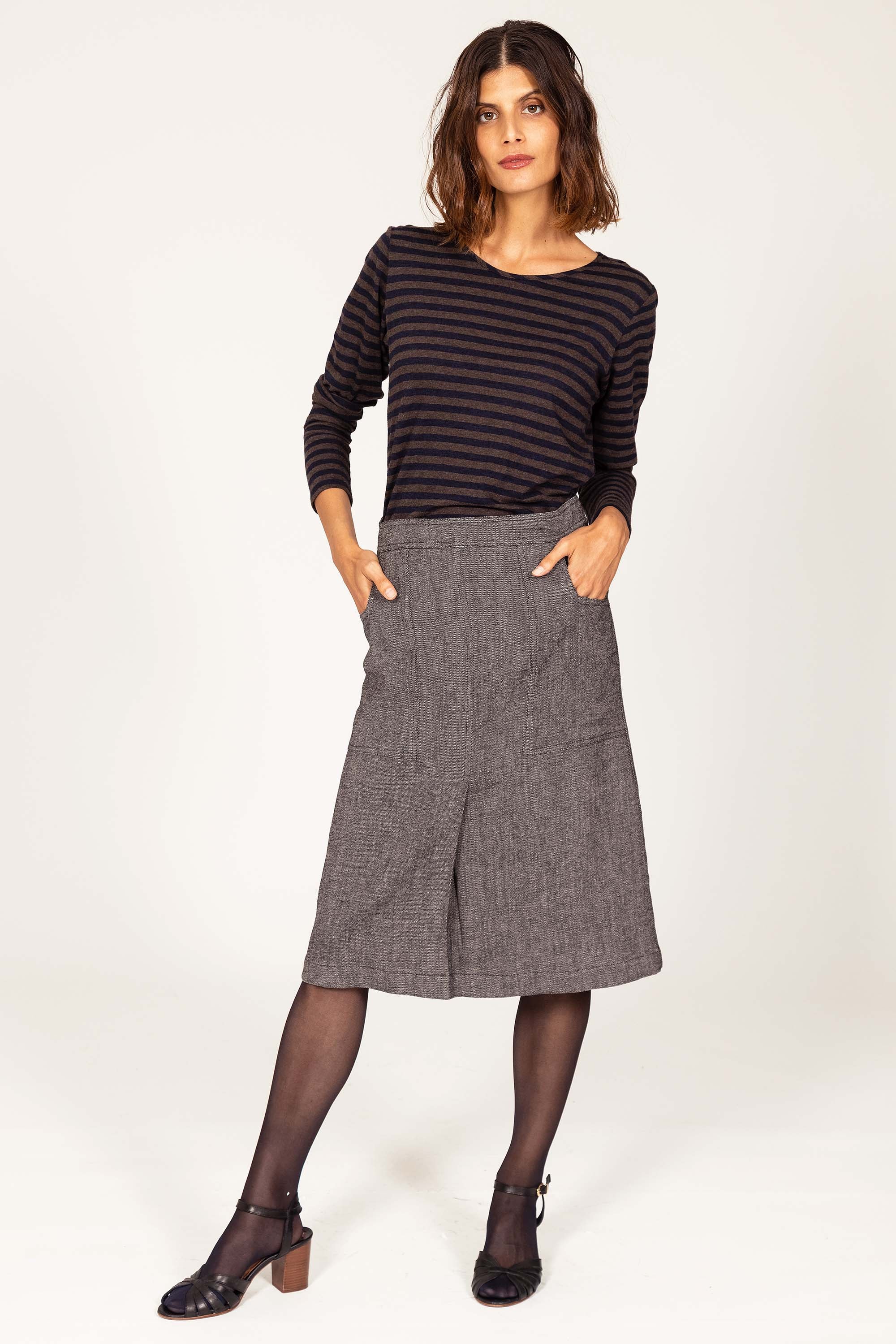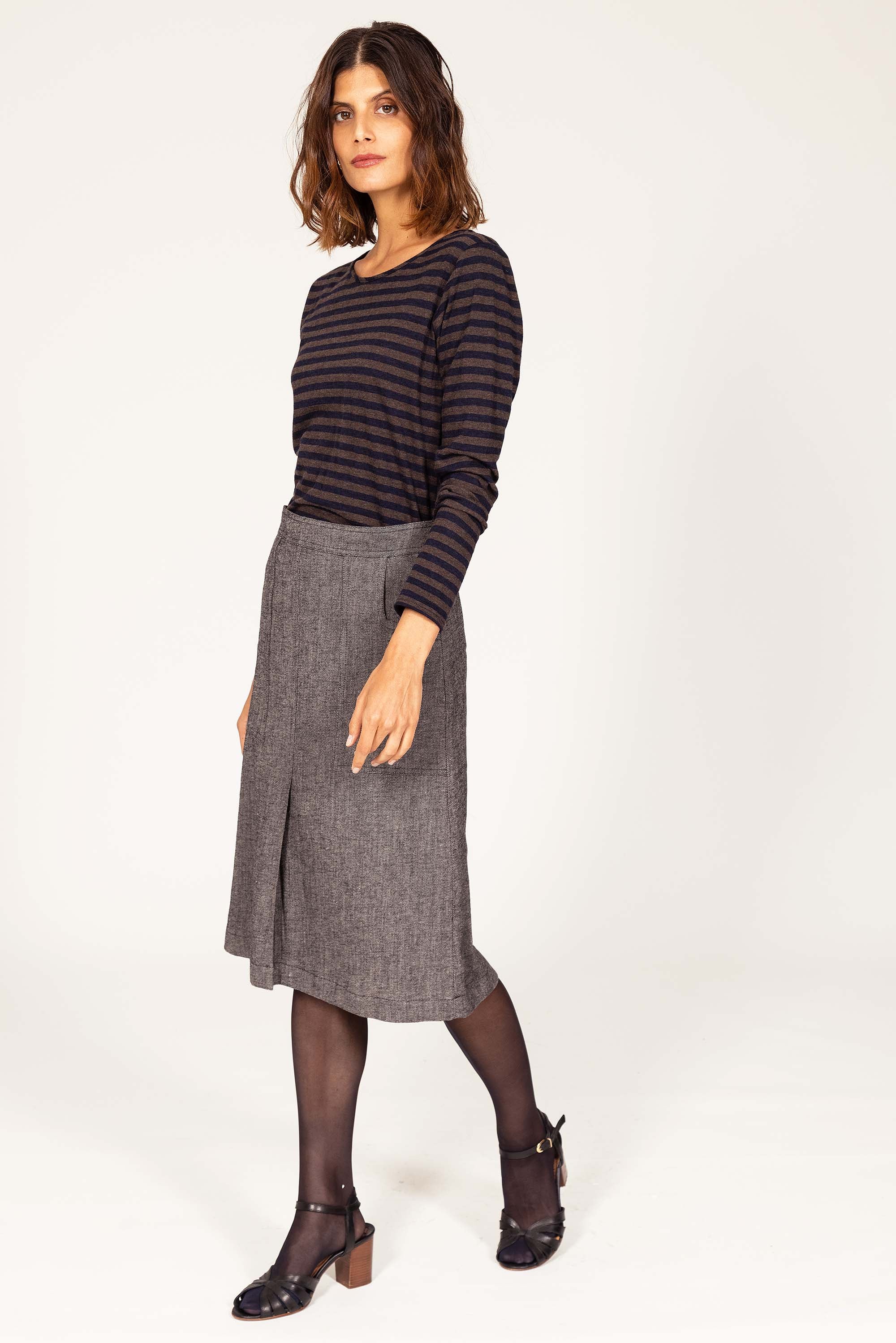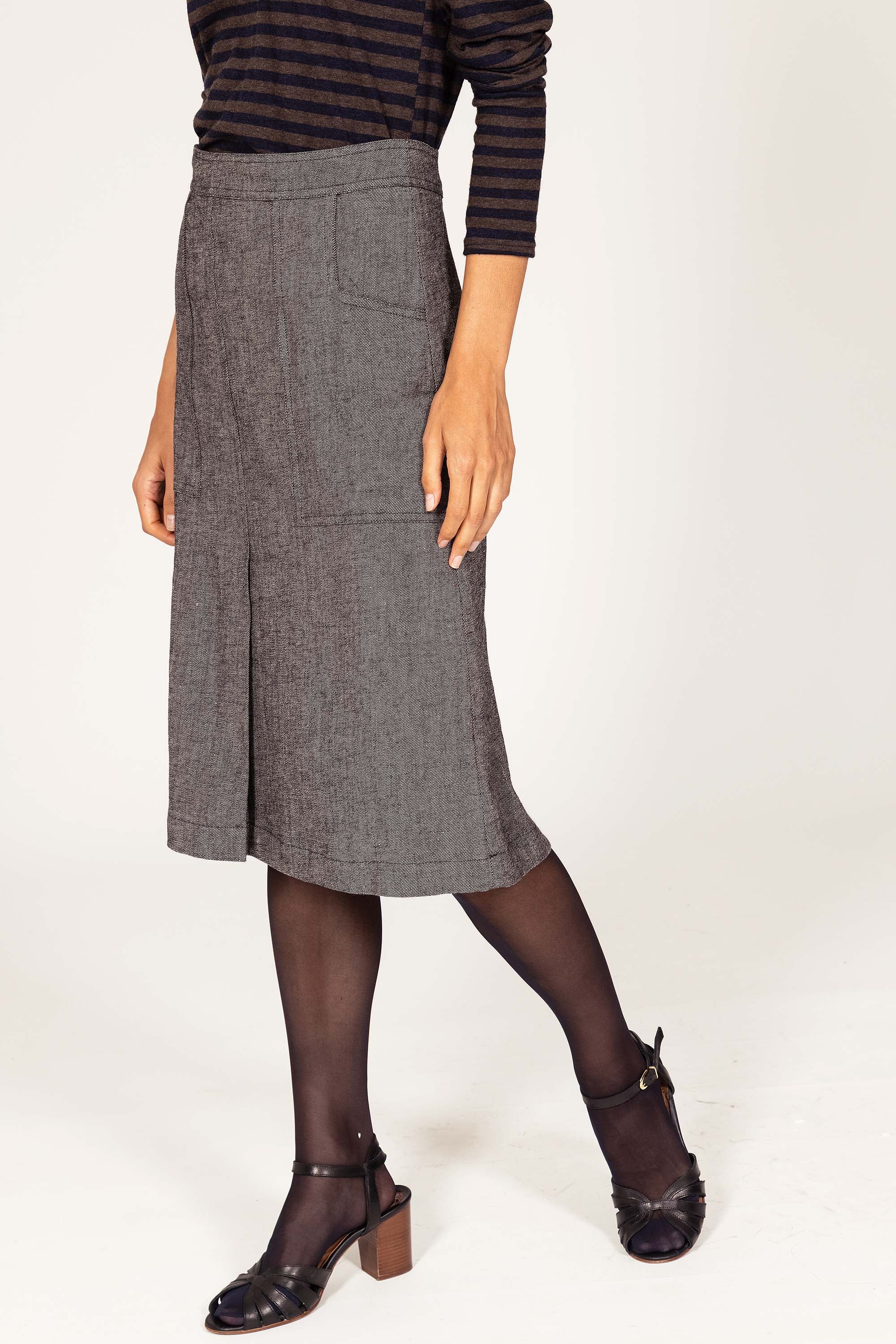 Straight skirt, belted at the waist, knee length. 2 large graphic pockets on the front outlining the curve of the hips.