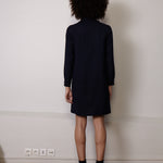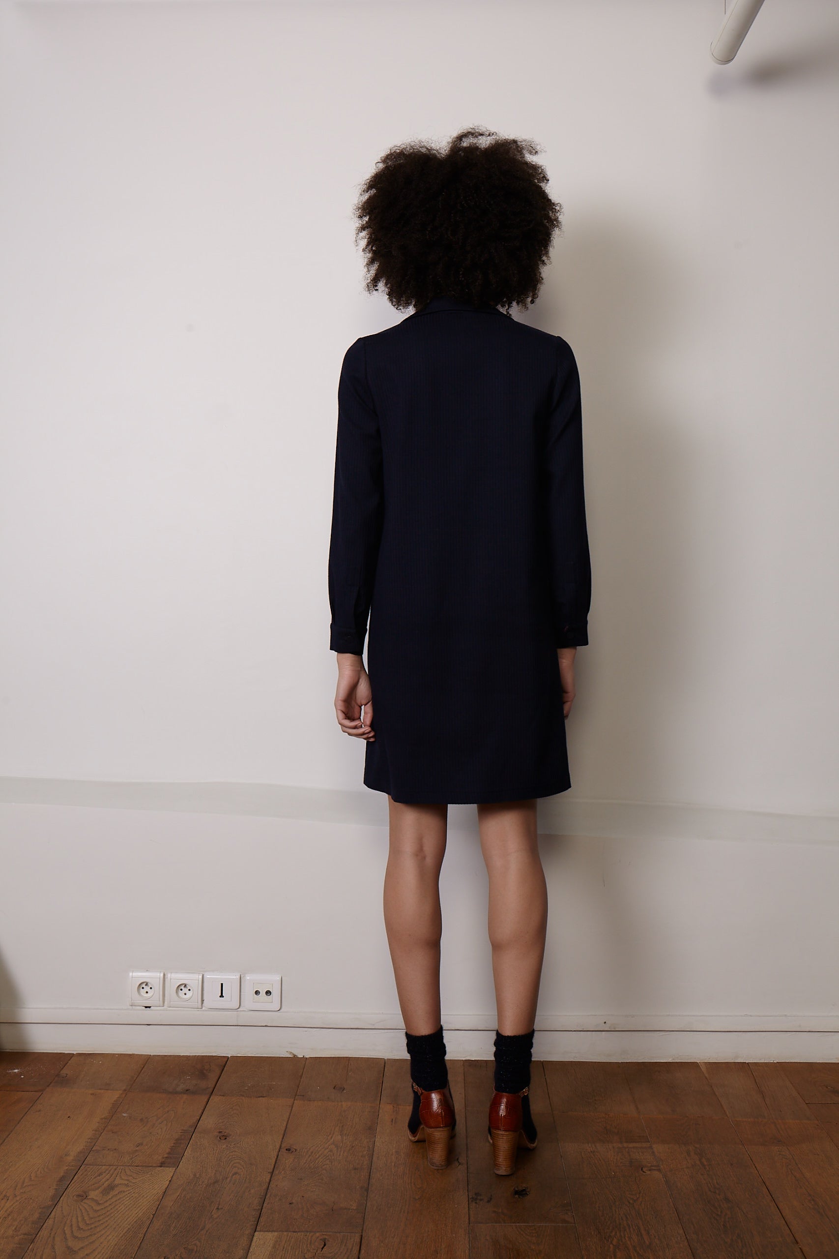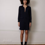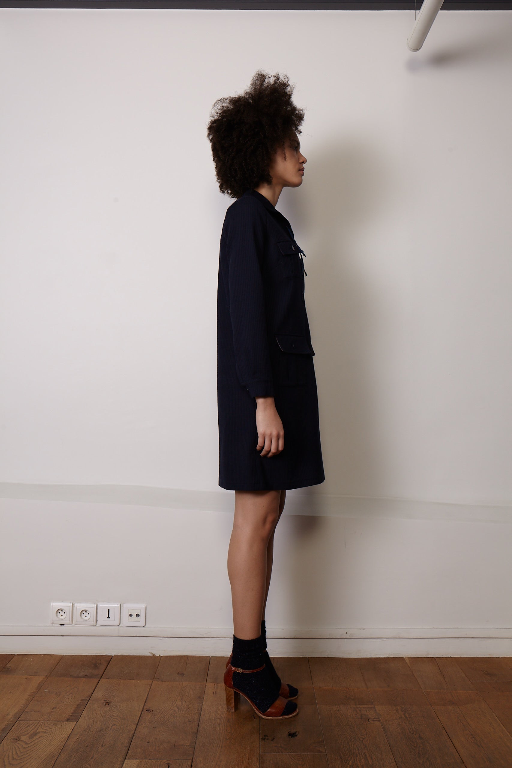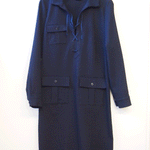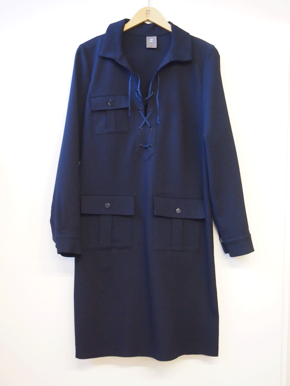 Long-sleeved dress, lacing at the neckline and two pockets on the front.