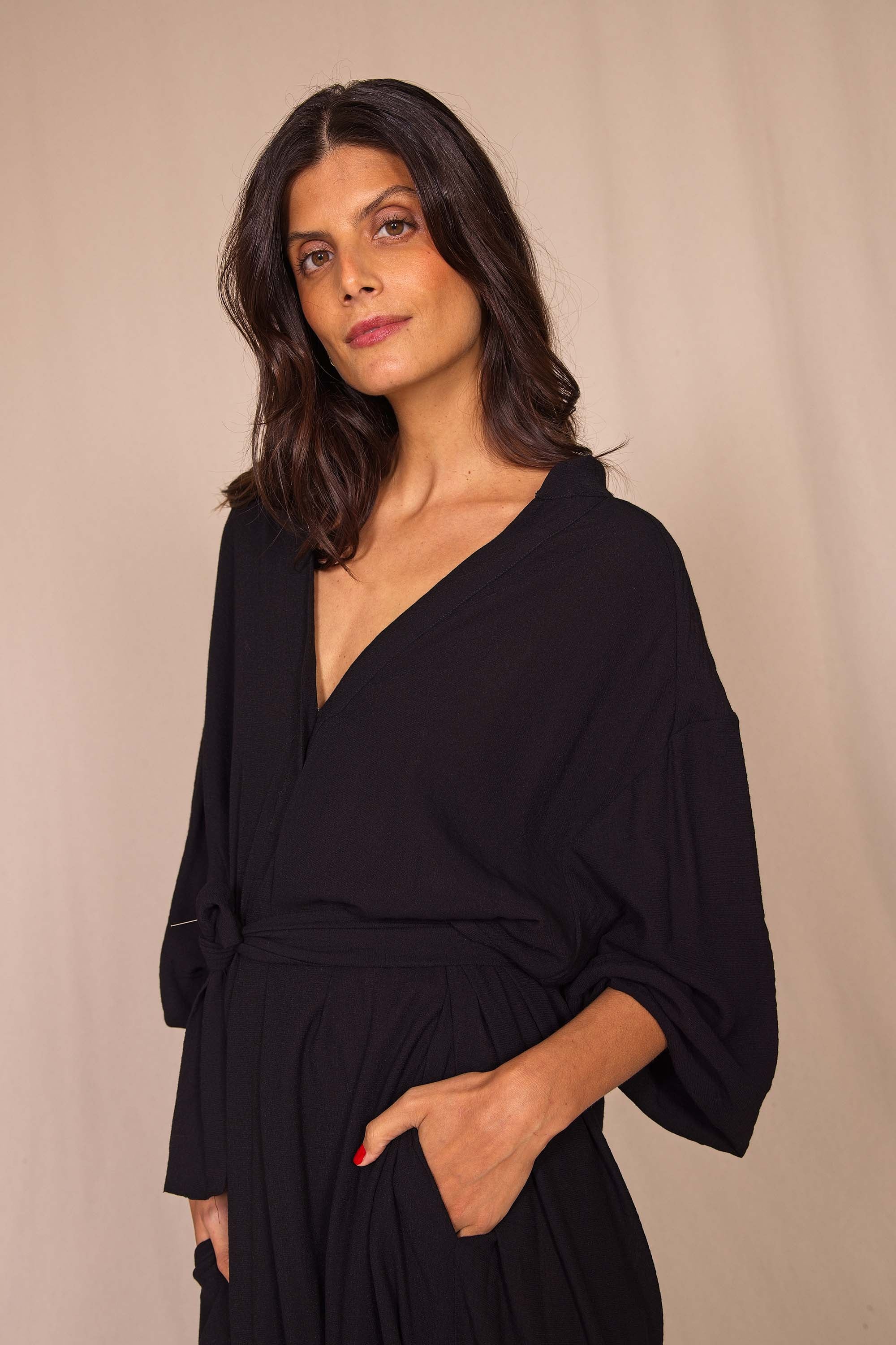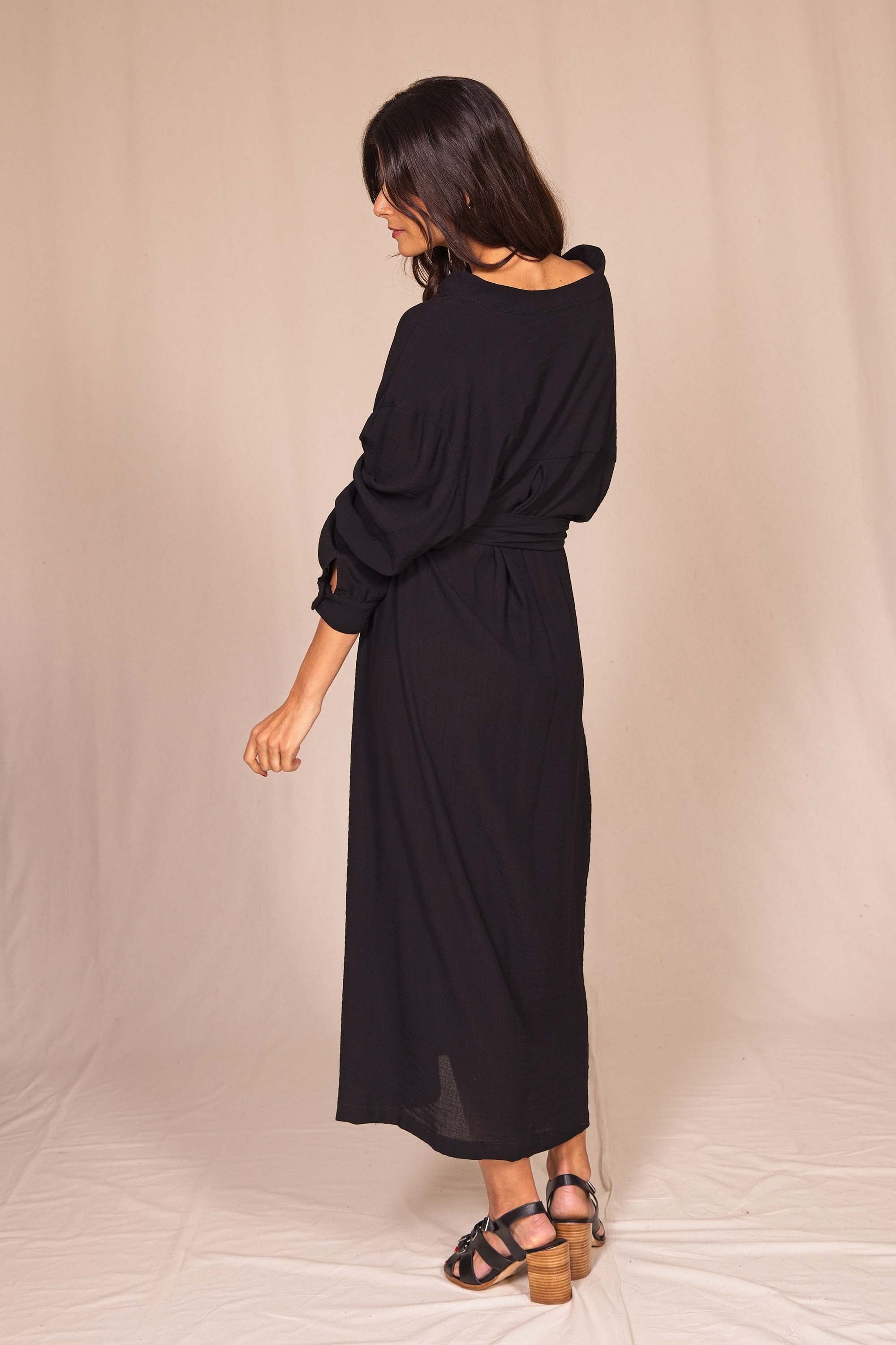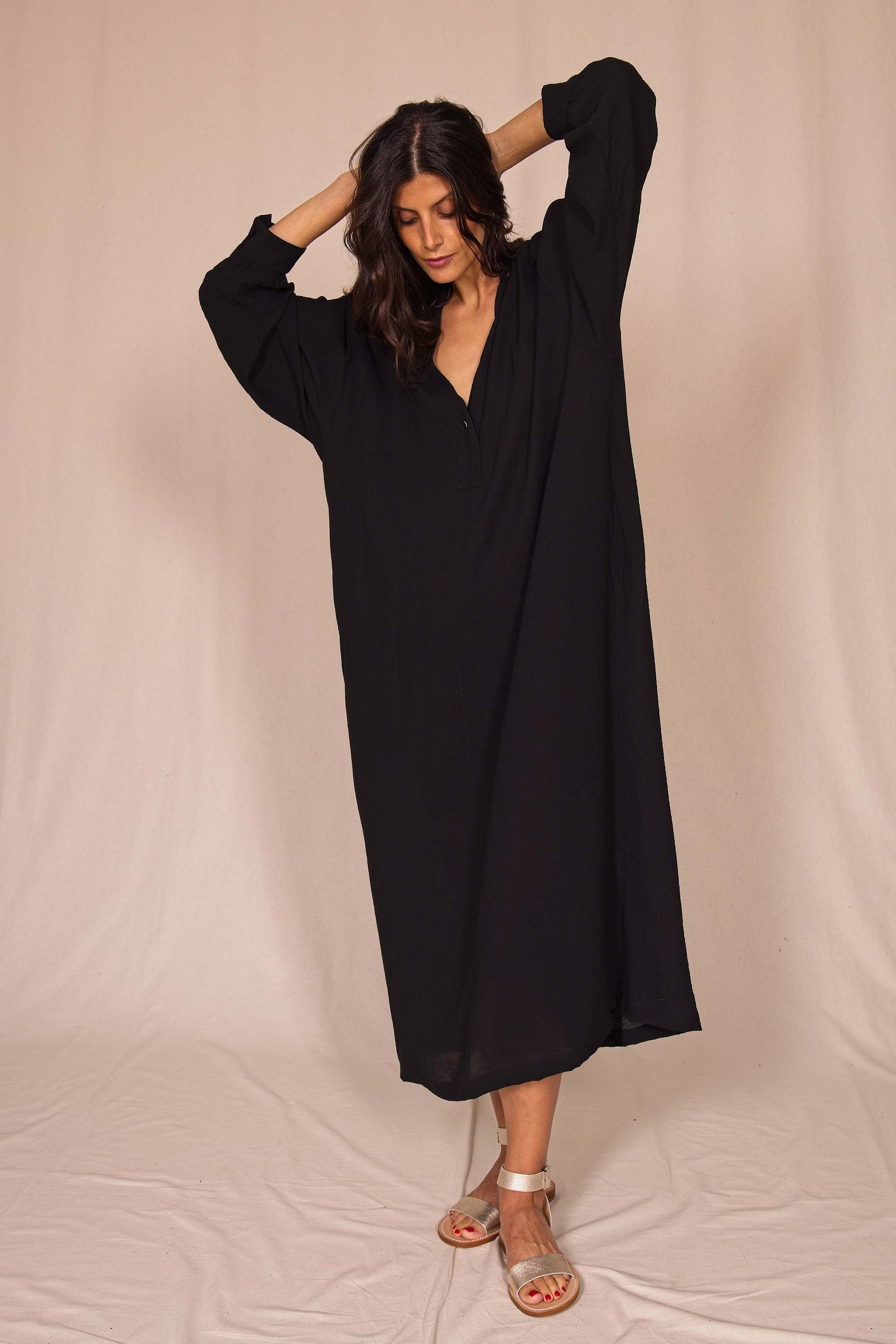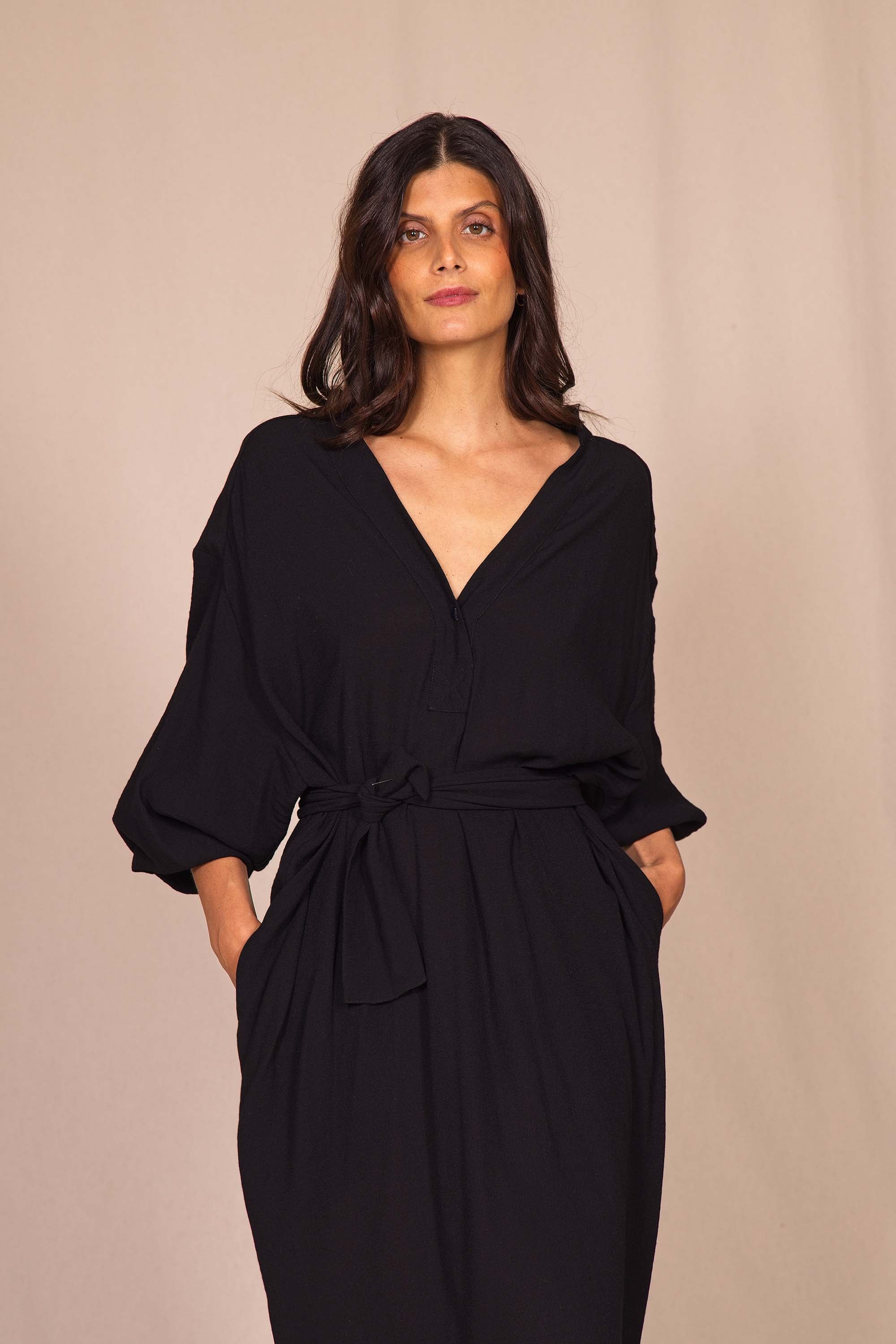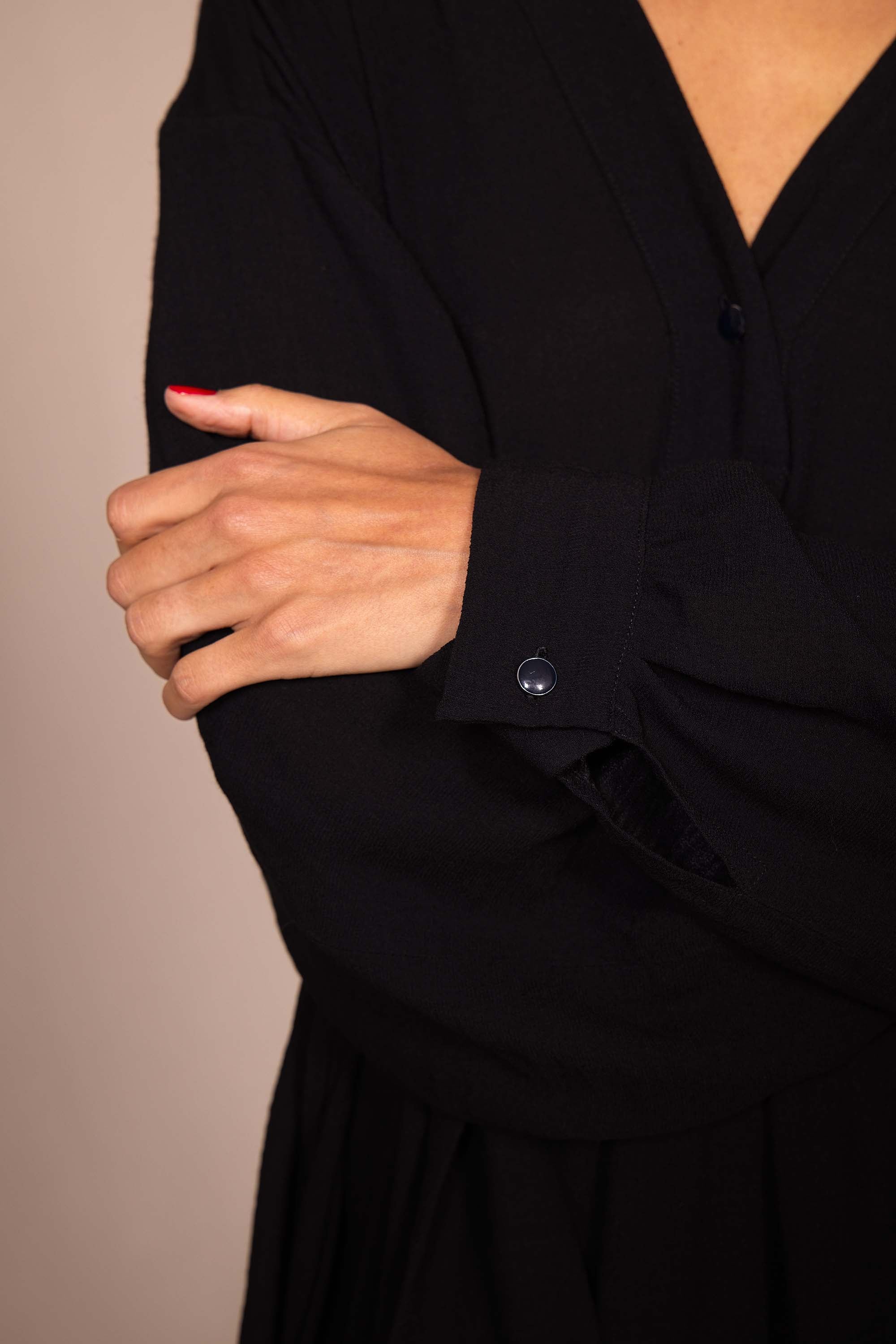 V-neckline with button closure. Long, dropped sleeves, box pleat at the back.