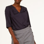 pleats on the shoulder, elbow-length sleeves, back pleats, small hip length