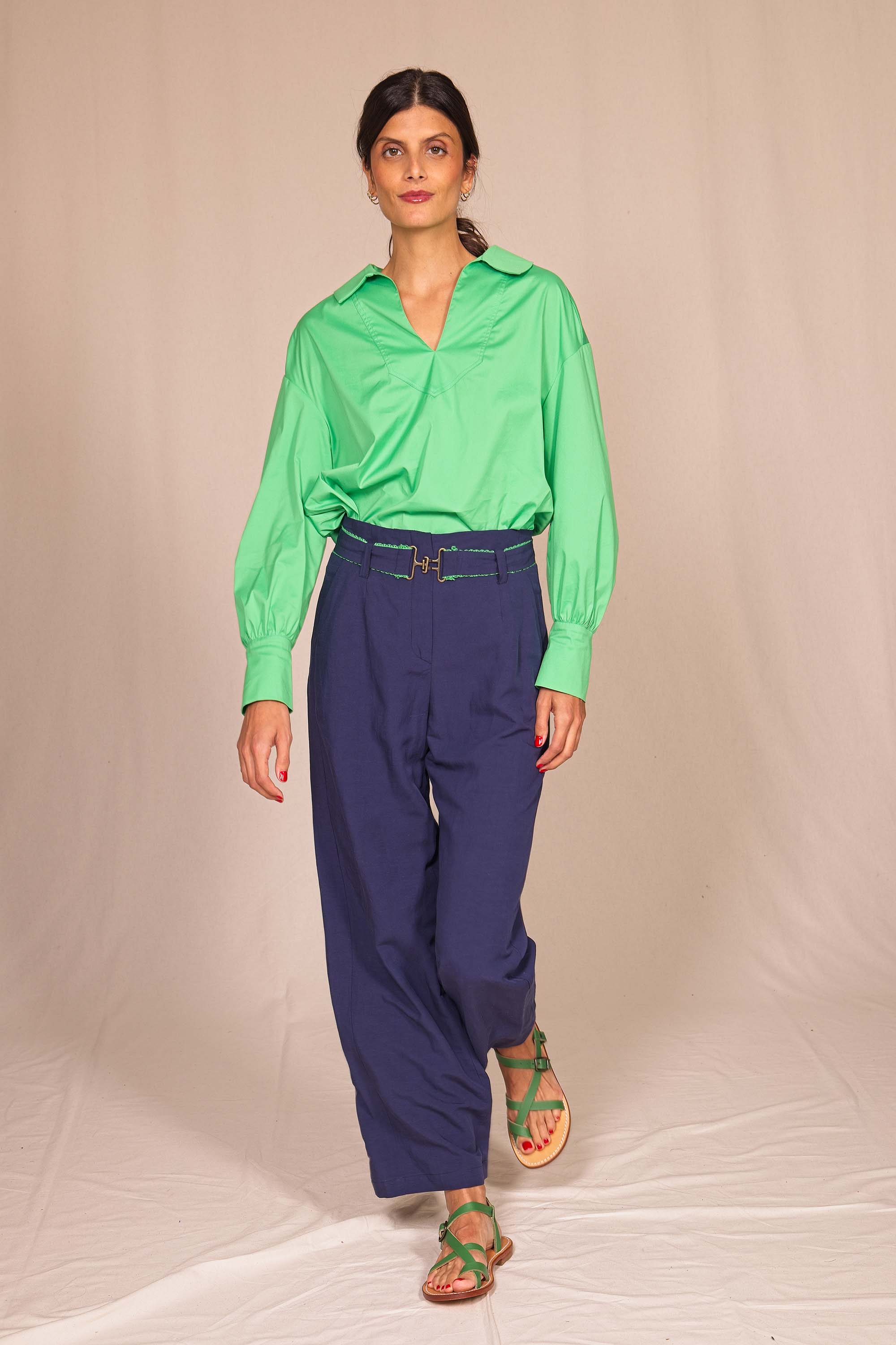 Straight trousers enhanced by a tone-on-tone belt edged with green piping and closed with a pretty buckle. 2 side pockets.