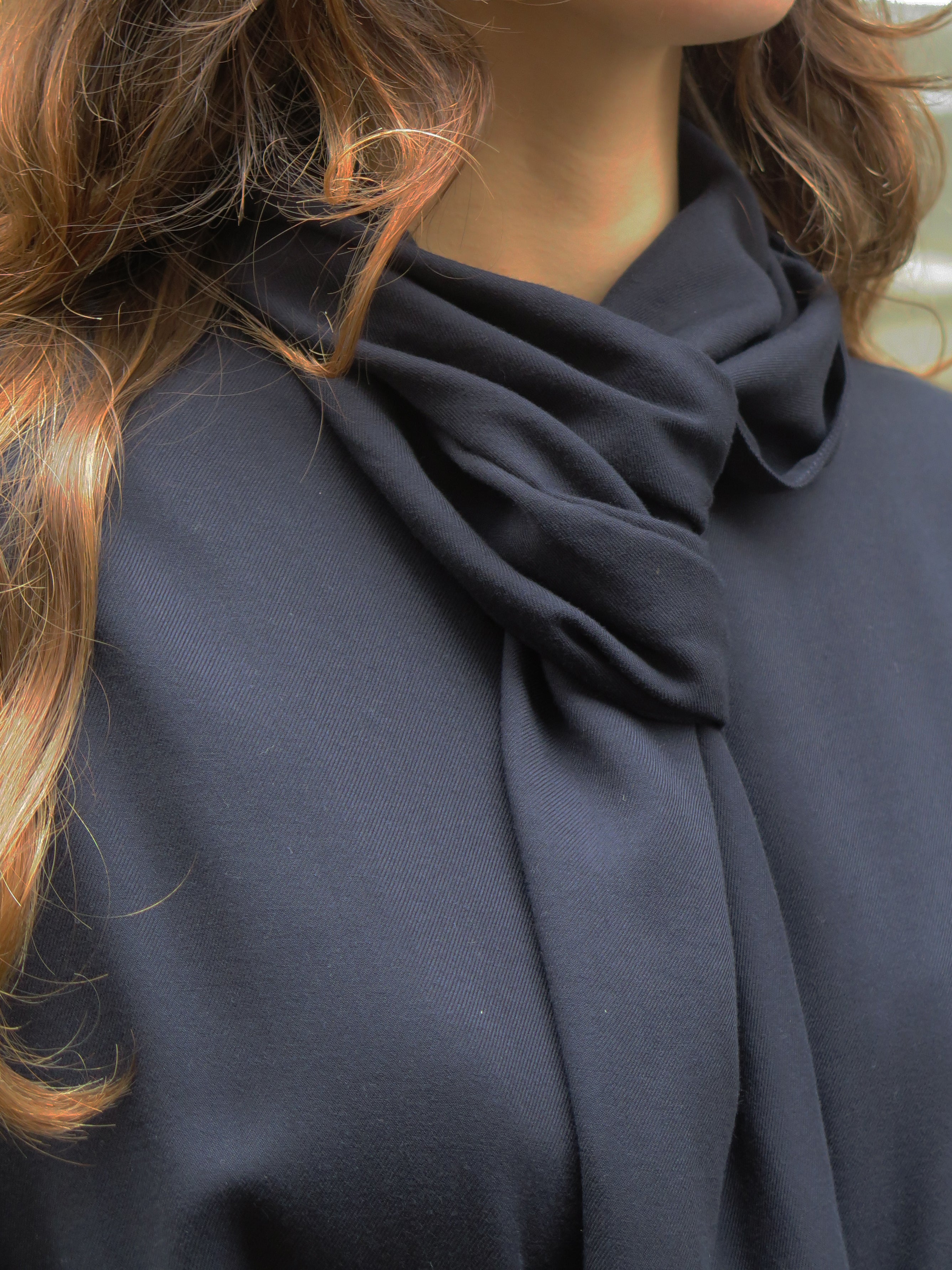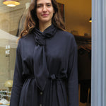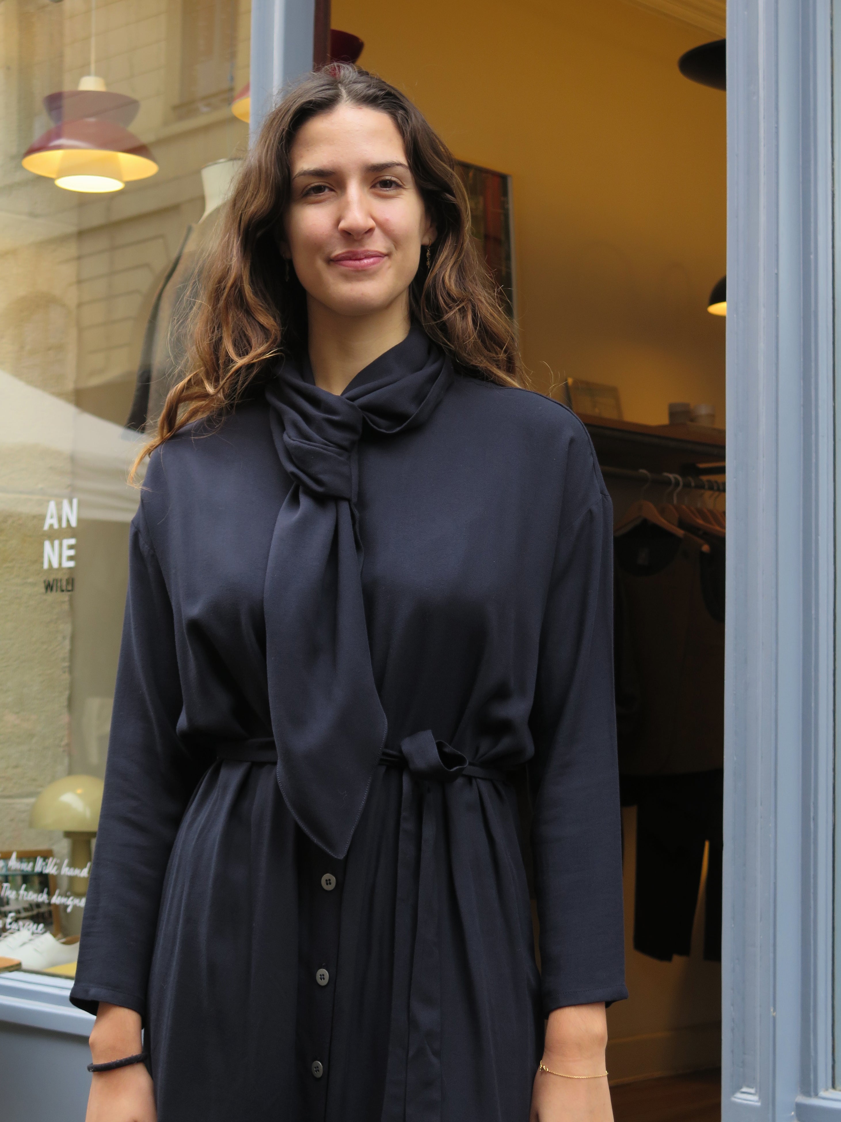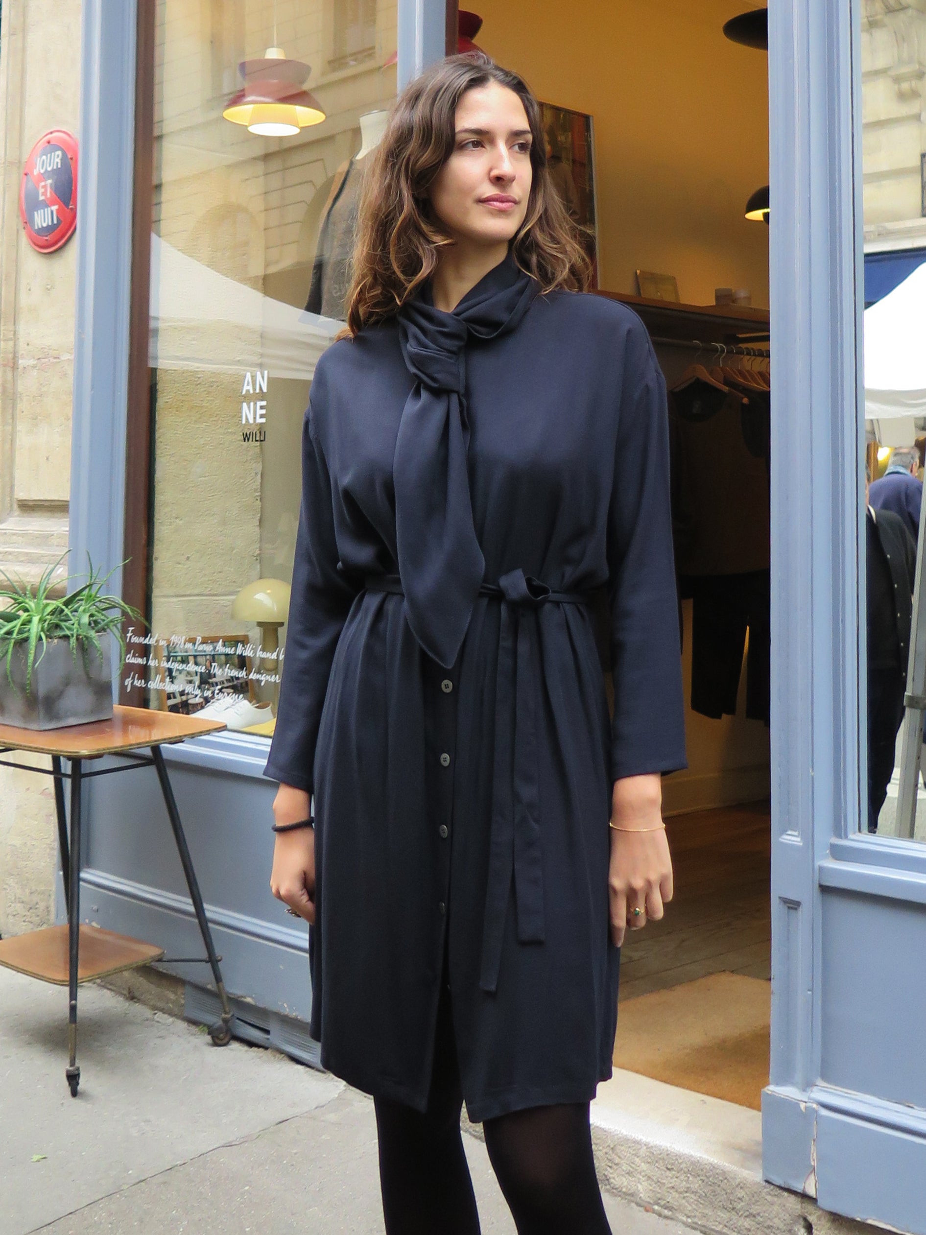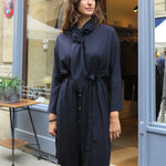 The GILARDI dress embodies Parisian chic with its flowing cut and refined finishes. Its scarf collar gives it a decidedly chic look. Fully buttoned down the front, it can be worn with or without a belt.