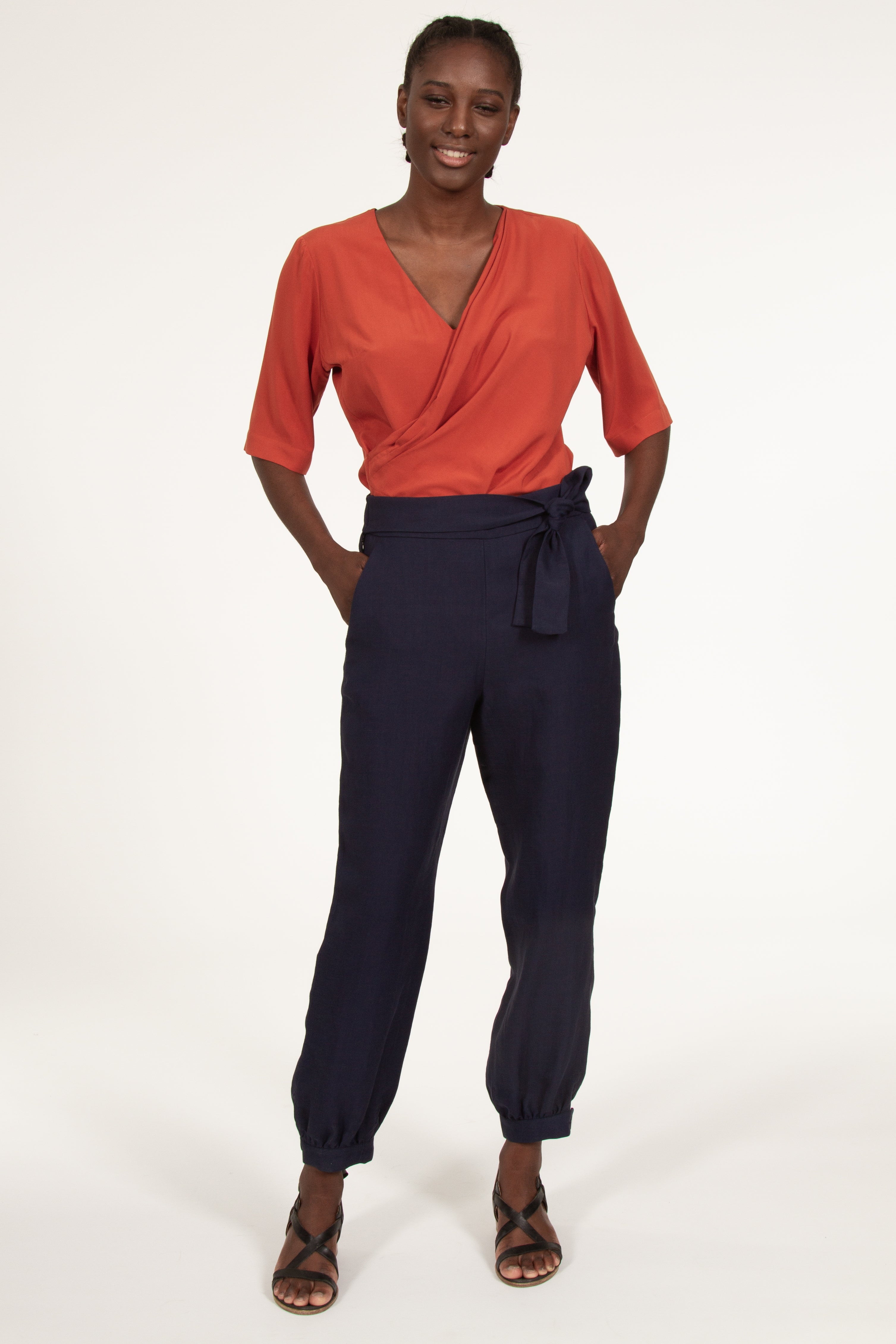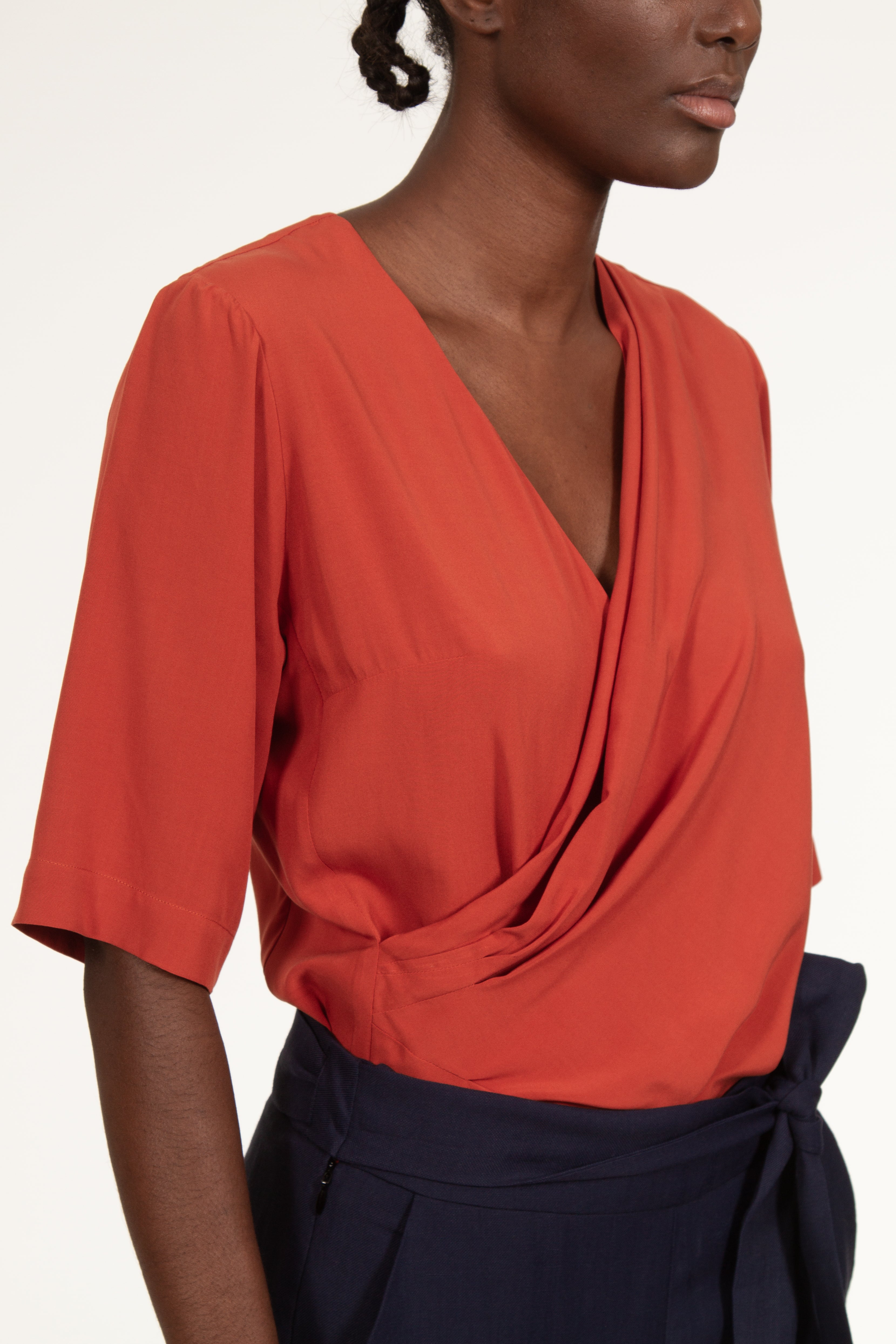Draped and asymmetrical top on the front.