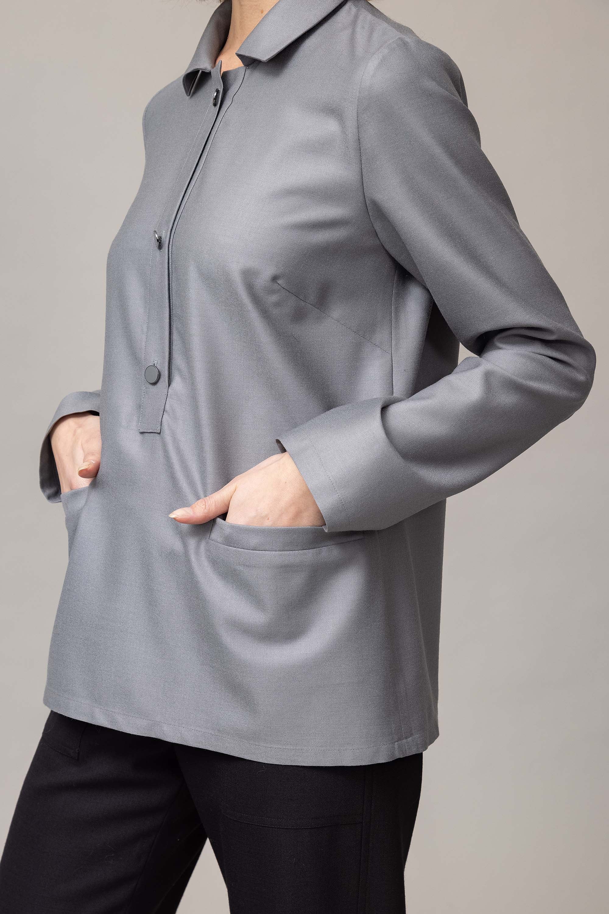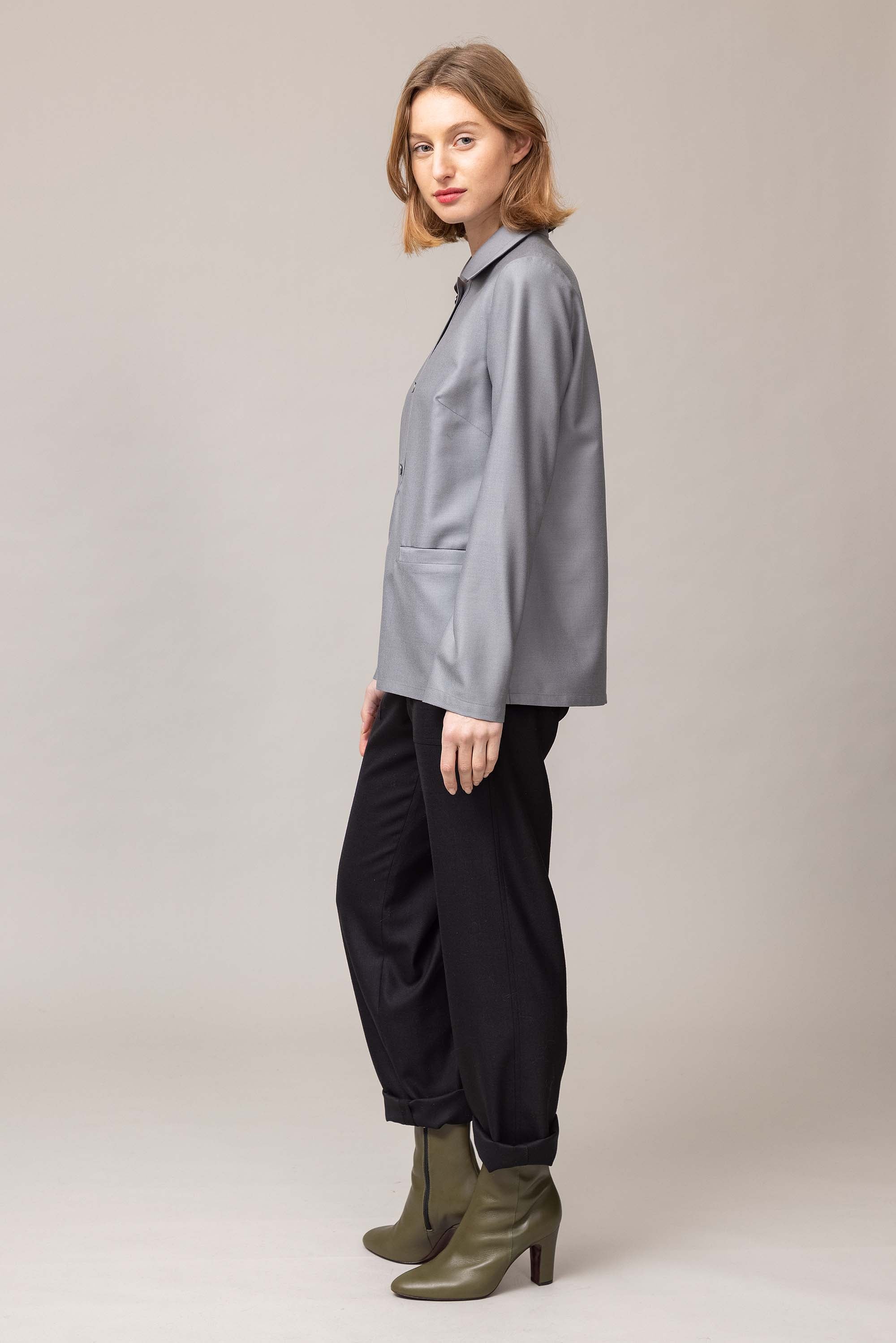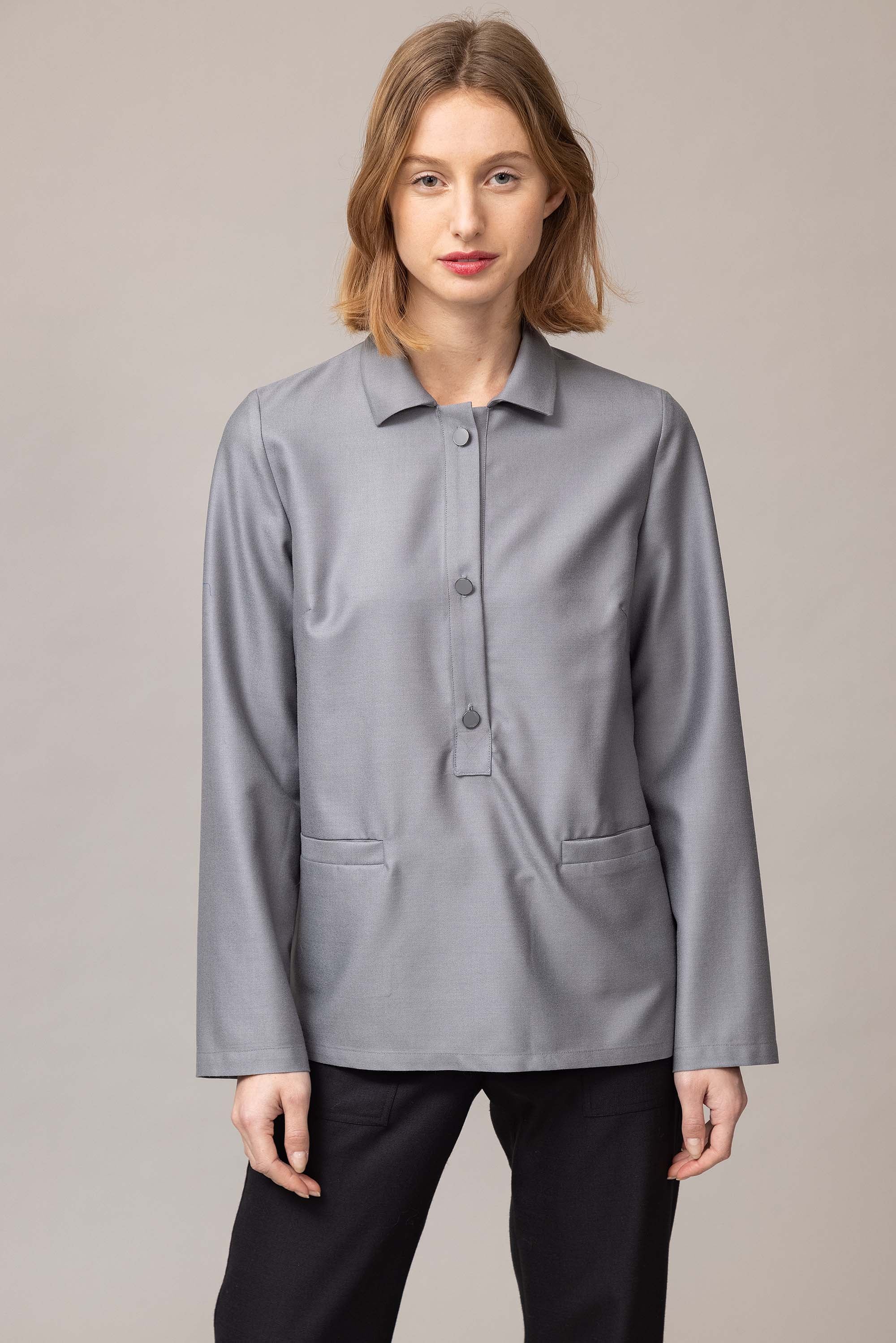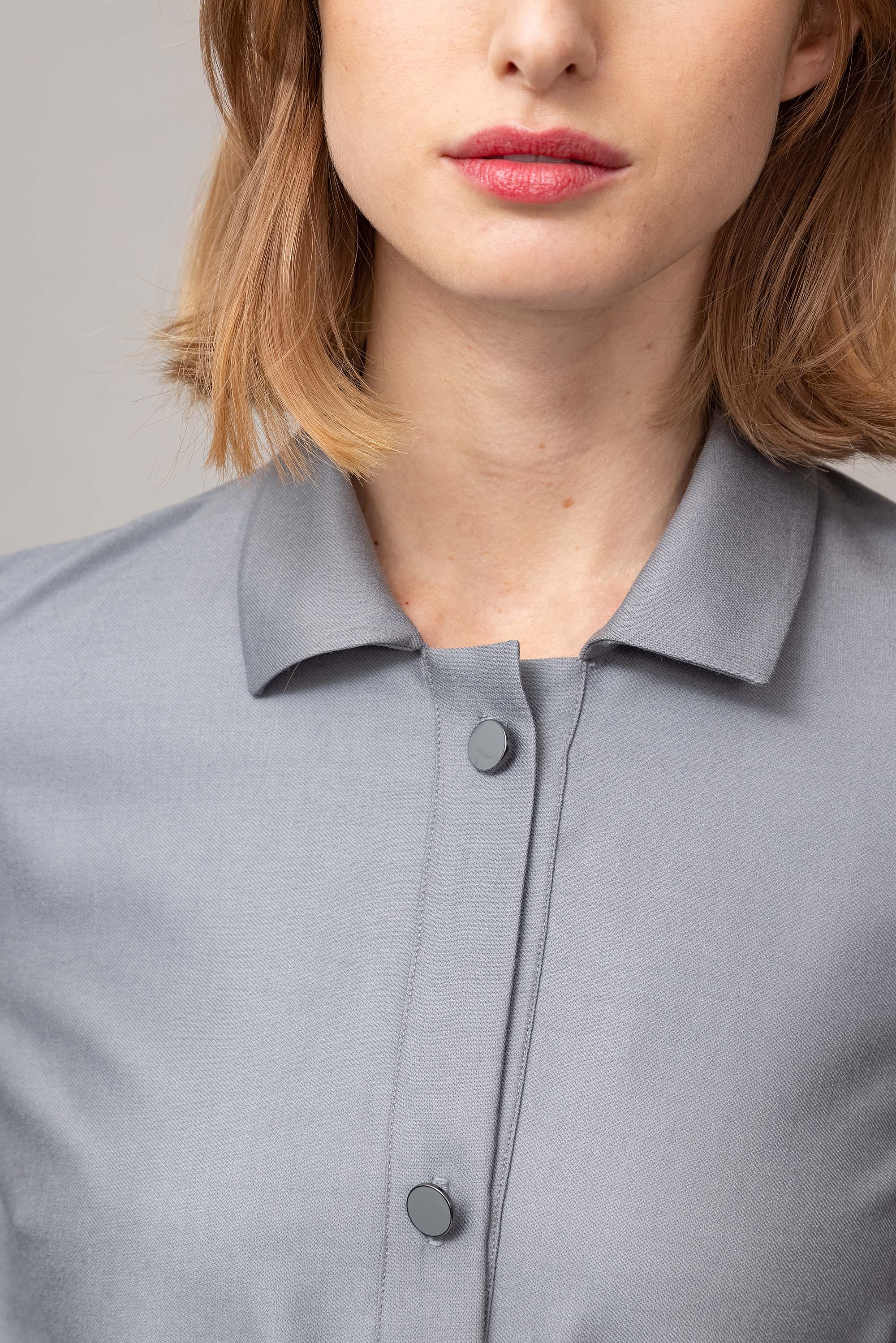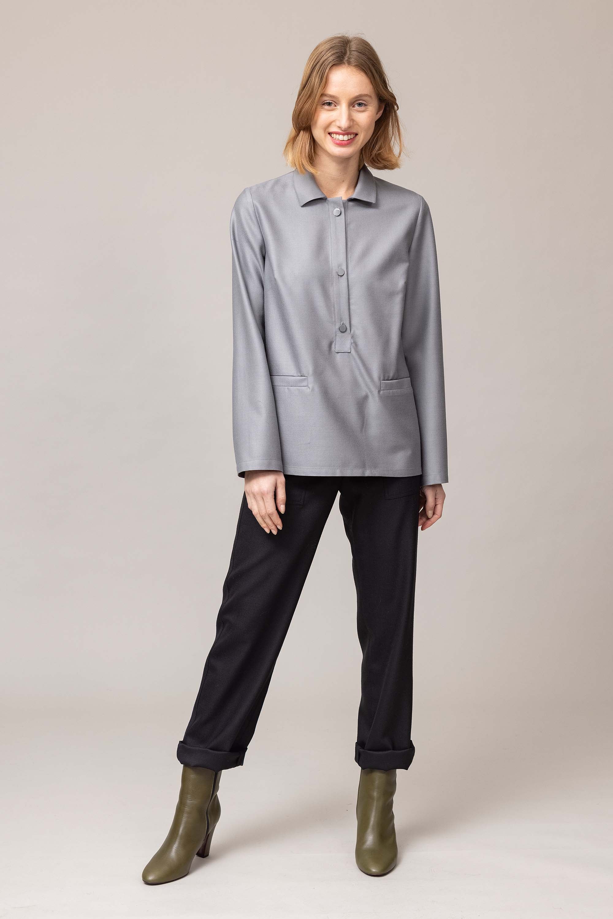 Straight blouse with shirt collar, buttoned at the front, cut from soft Italian wool fabric.