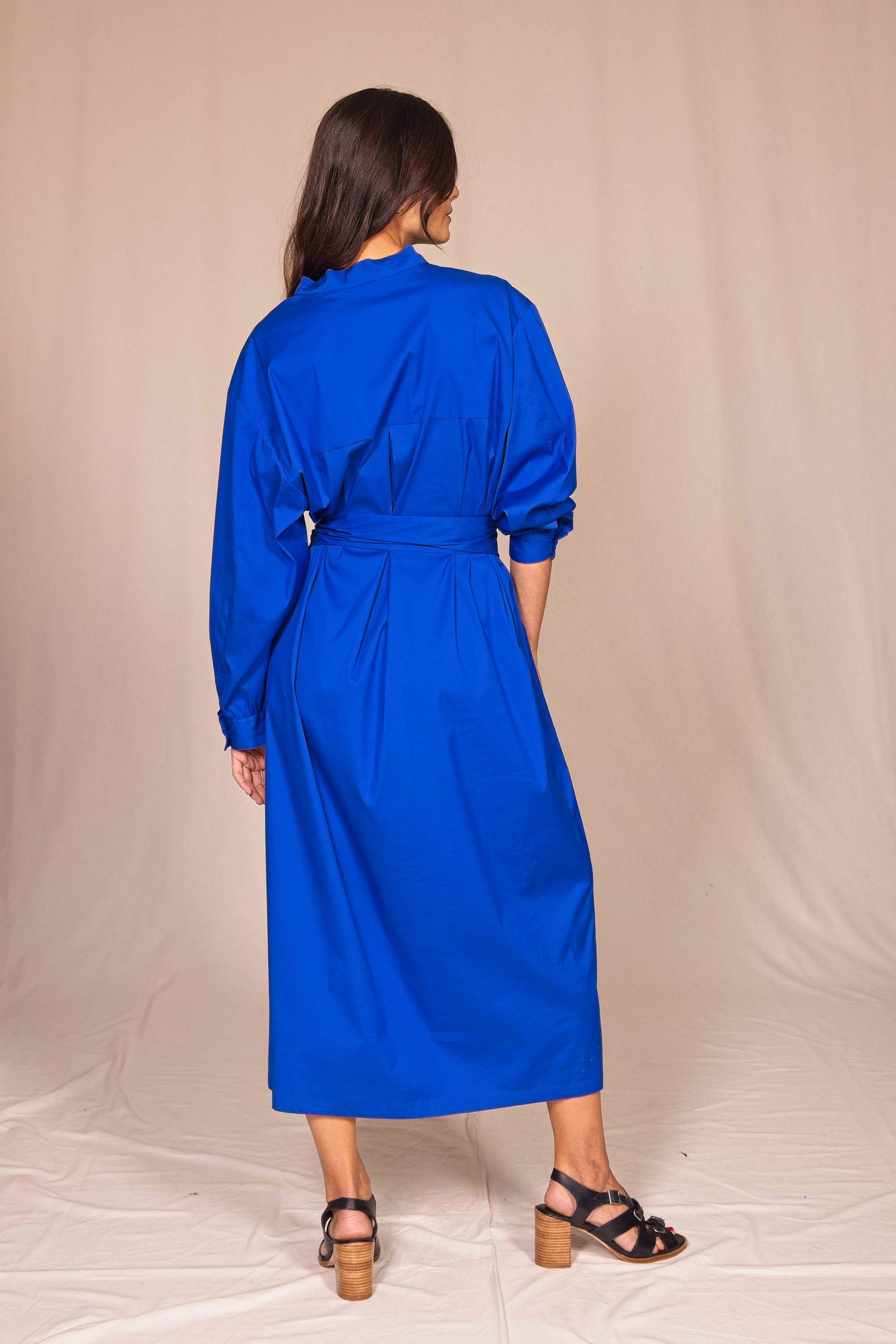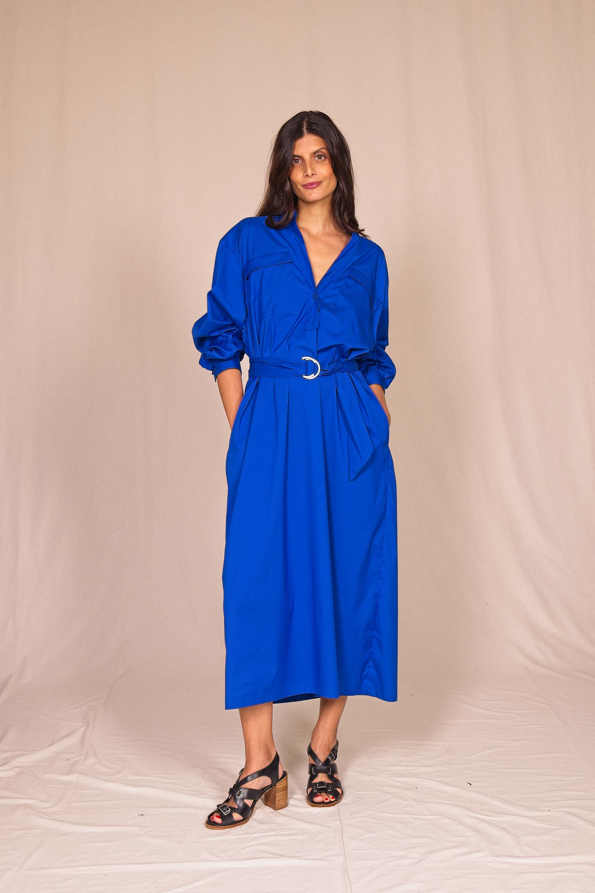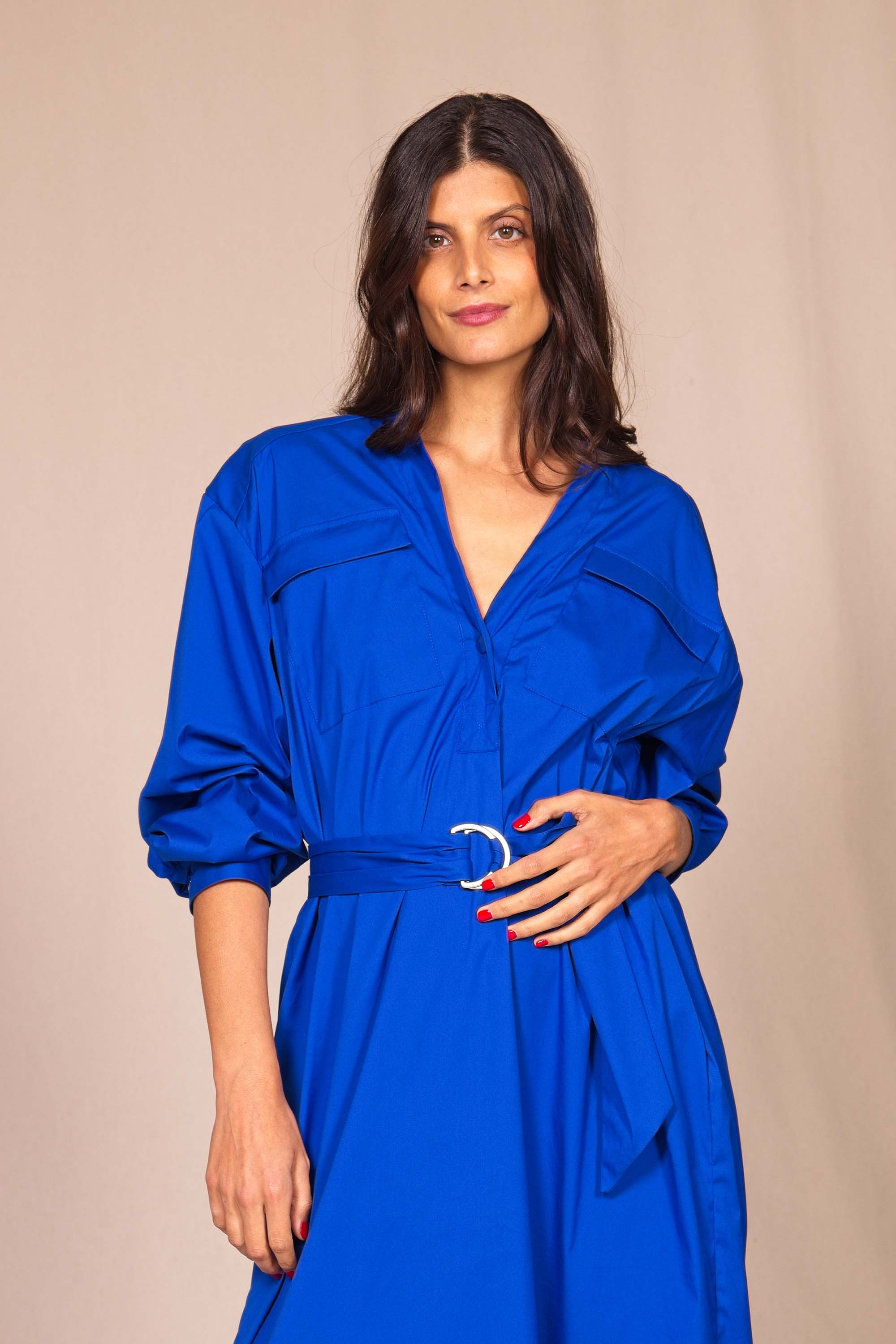 Cette robe mi-longue séduit par son allure féminine et aérienne. La taille est cintrée par une ceinture du même tissu ornée d'une jolie boucle. Pour un effet plus décontracté et oversize, la robe se porte aussi joliment sans ceinture.