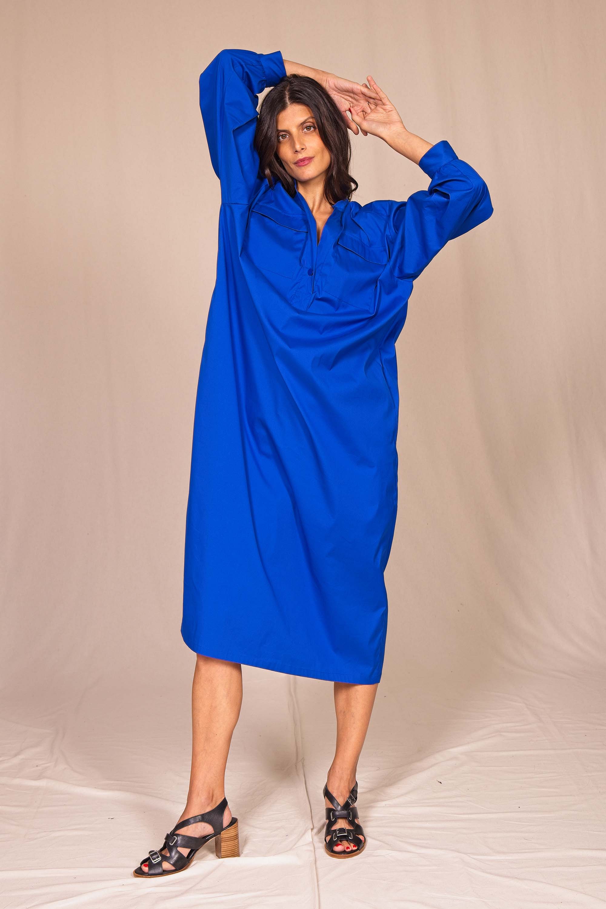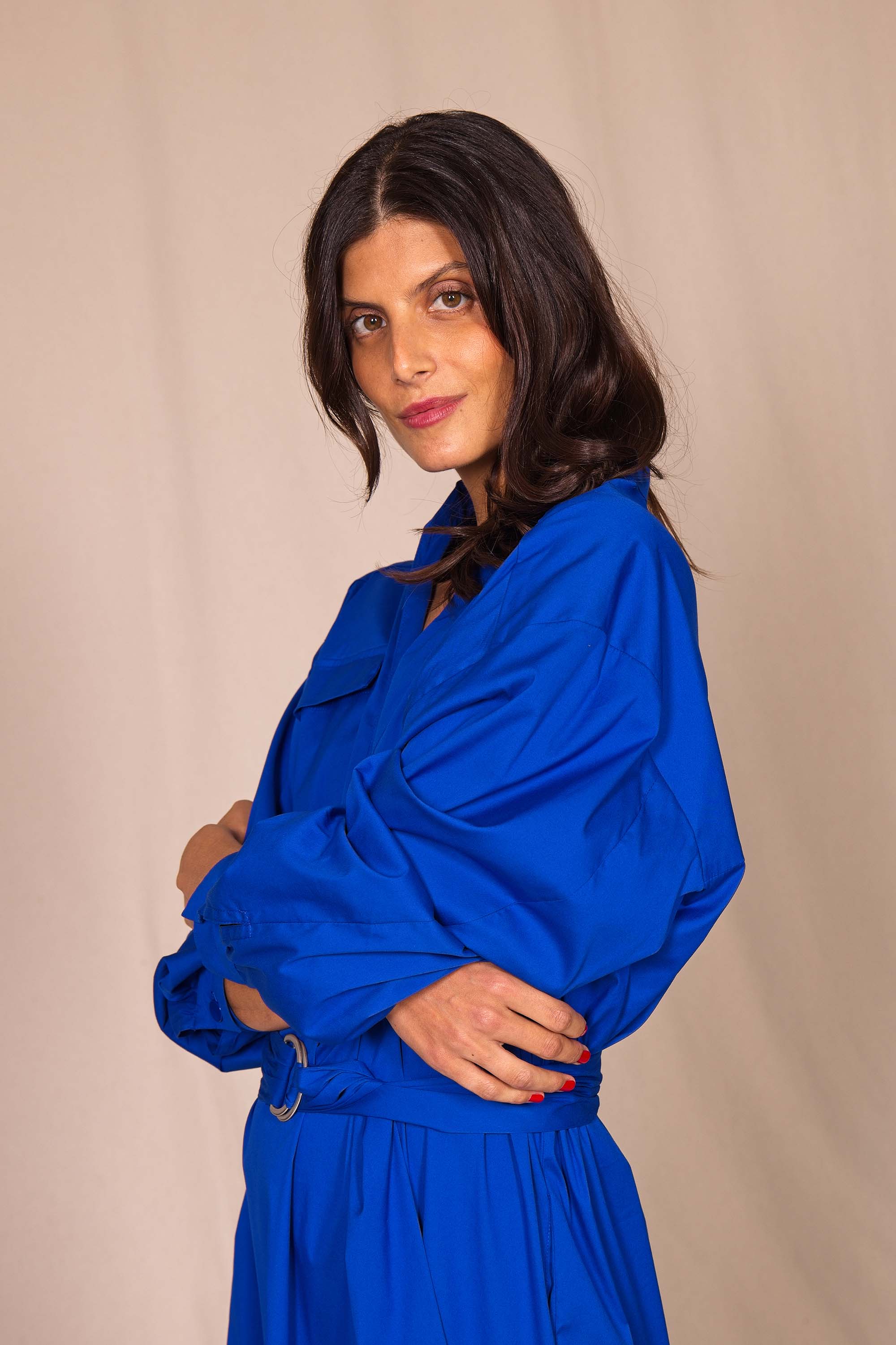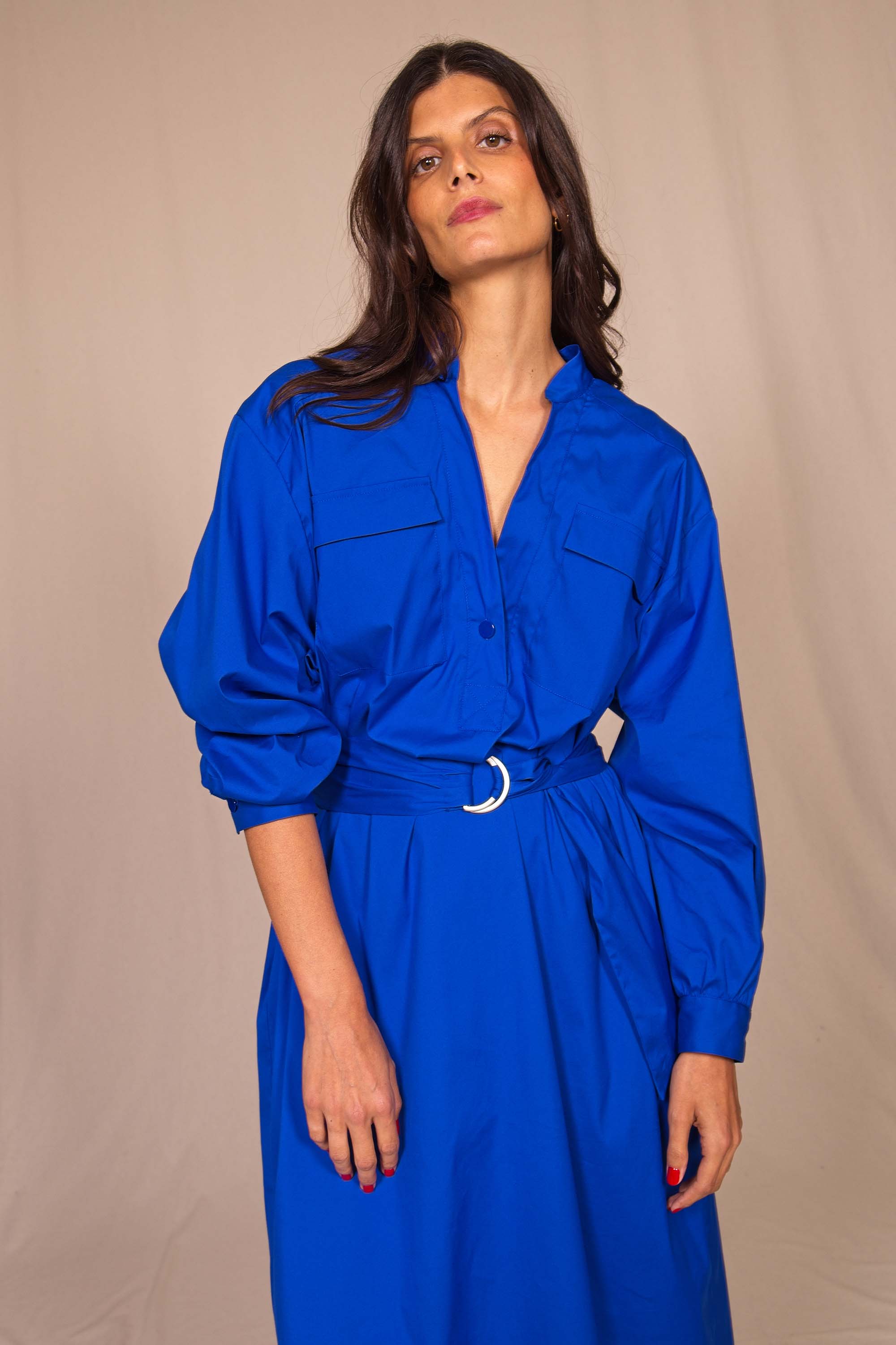Décolleté V fermé par un bouton ton sur ton, 2 poches à rabat sur la poitrine, manches 3/4 légèrement bouffantes.